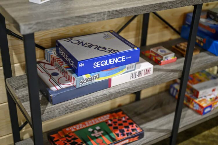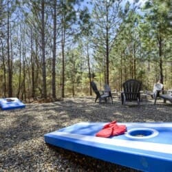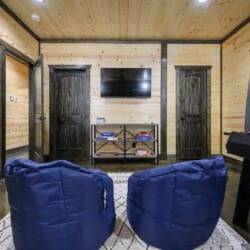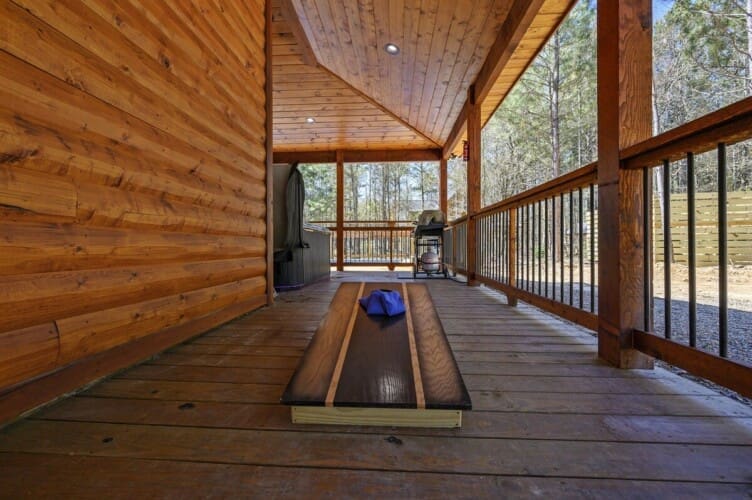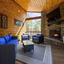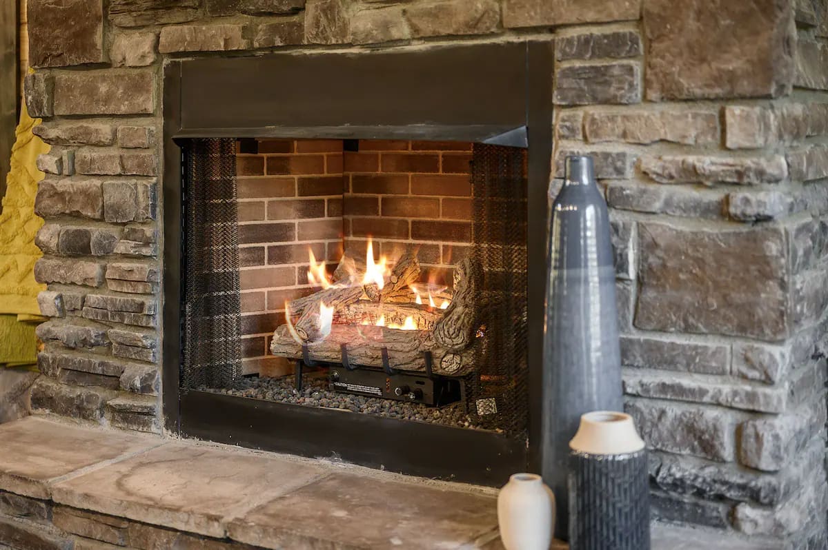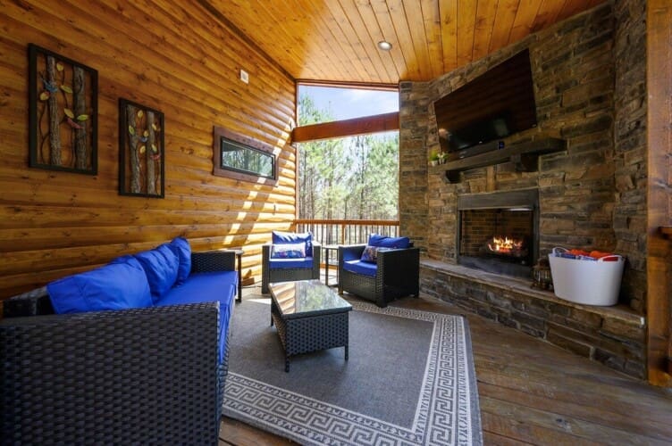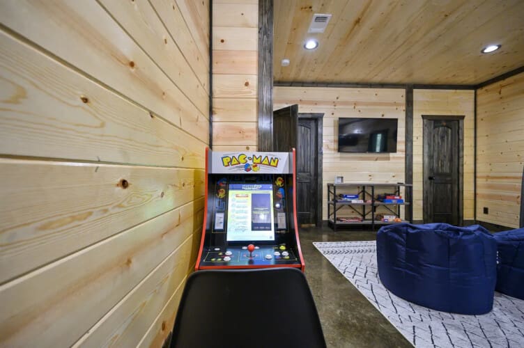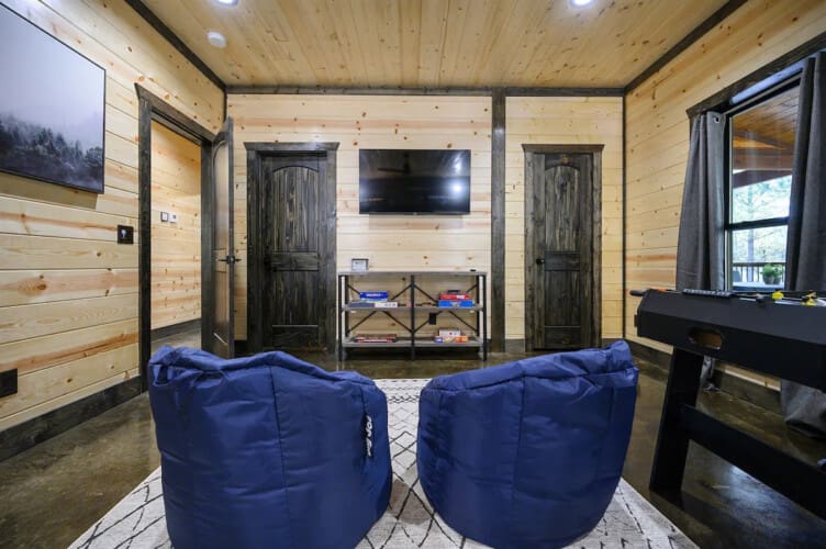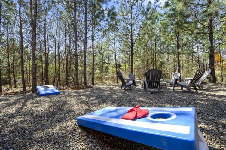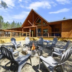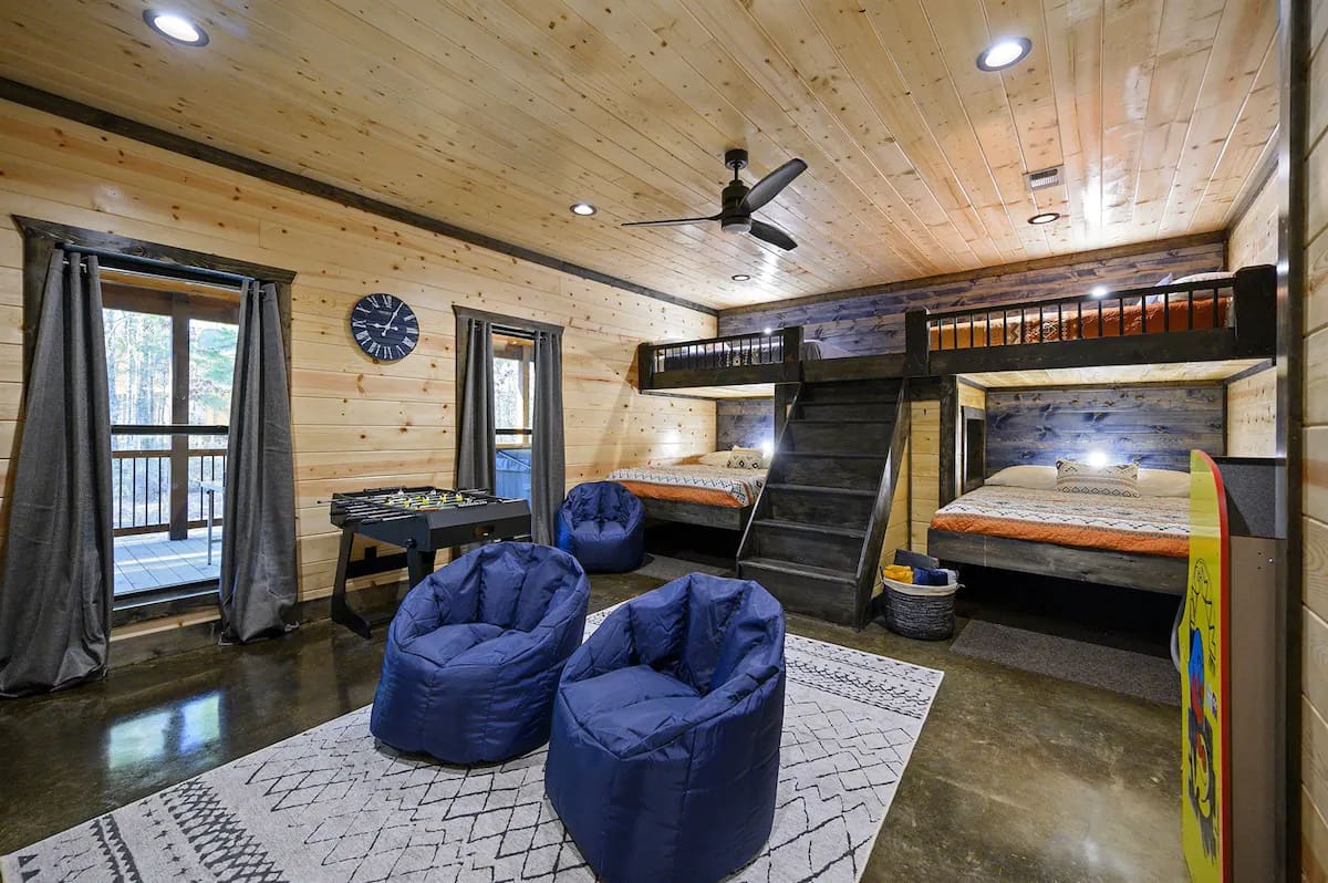 Down the hall is the bunkroom, complete with a play cave and 55″ TV, perfect for kids to play and relax. The covered deck outside the kitchen offers a spacious area for grilling and enjoying meals at the picnic table or relaxing by the outdoor fireplace with mounted TV. The string lights around the firepit add the perfect ambiance for roasting marshmallows or playing games.