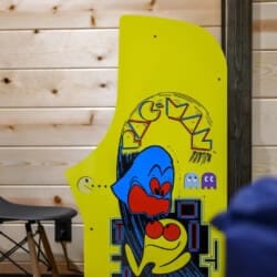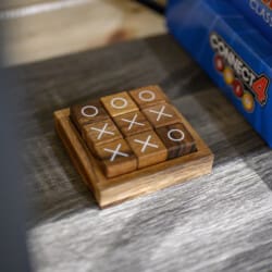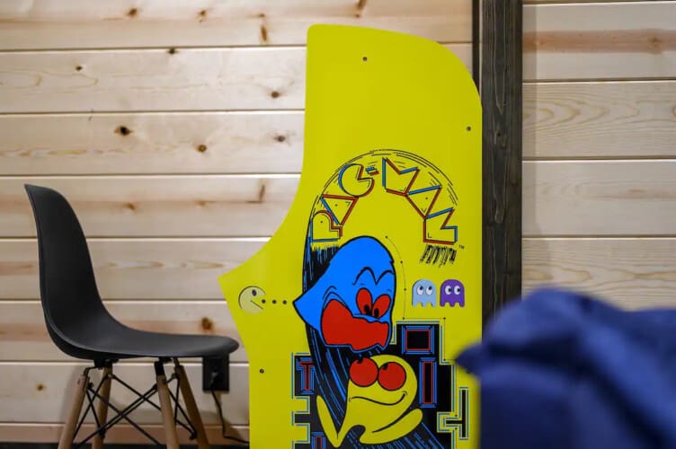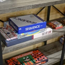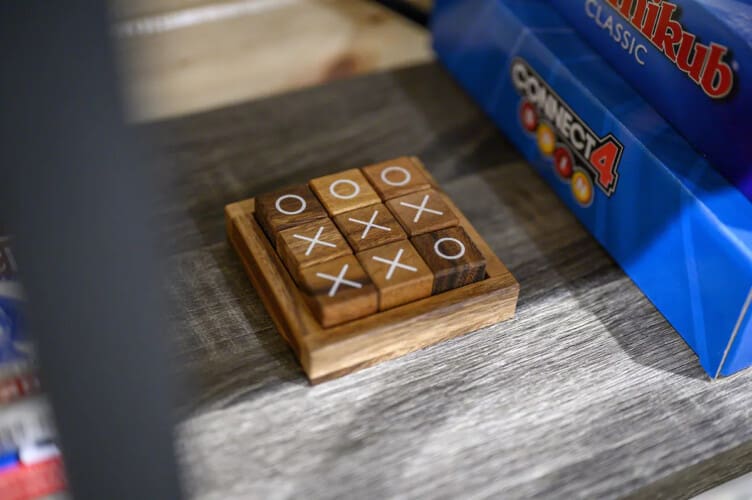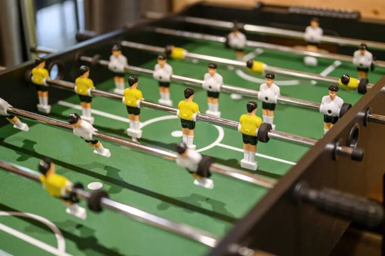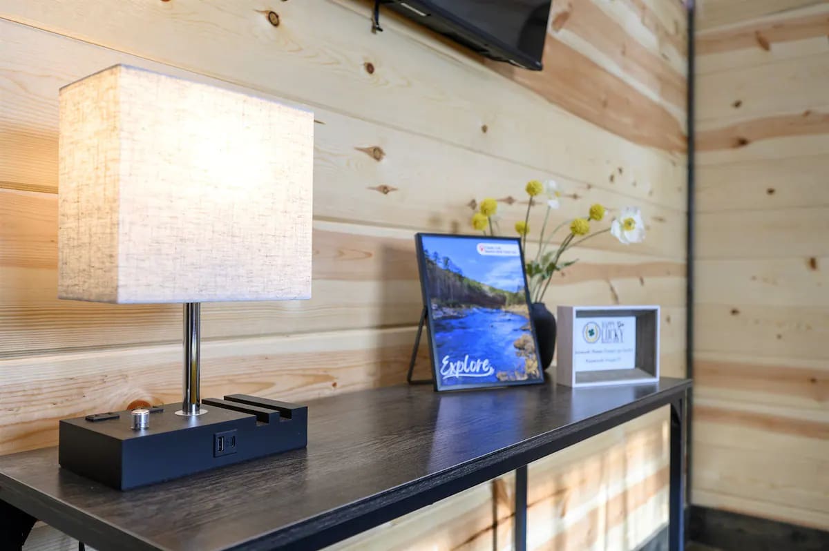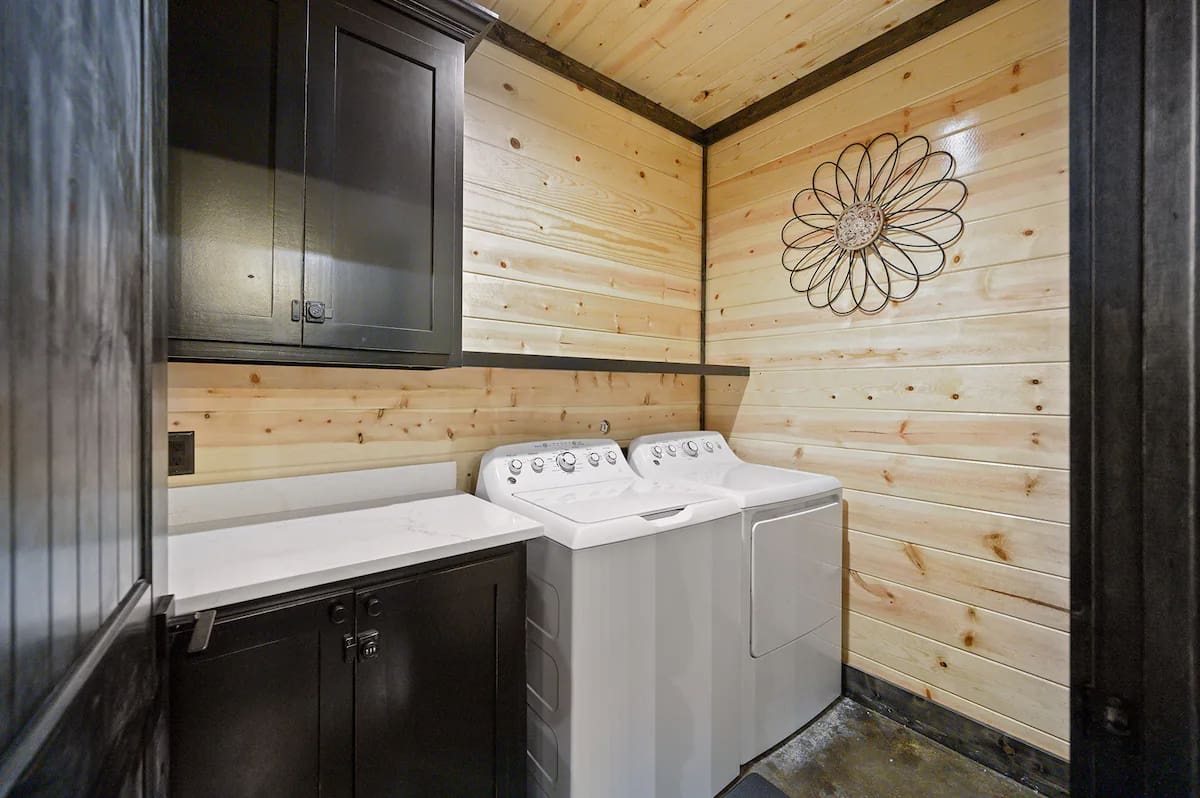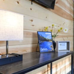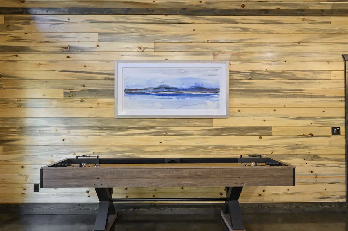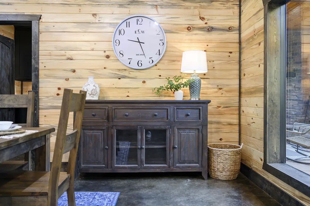 Down the hall is the bunkroom, complete with a play cave and 55″ TV, perfect for kids to play and relax. The covered deck outside the kitchen offers a spacious area for grilling and enjoying meals at the picnic table or relaxing by the outdoor fireplace with mounted TV. The string lights around the firepit add the perfect ambiance for roasting marshmallows or playing games.