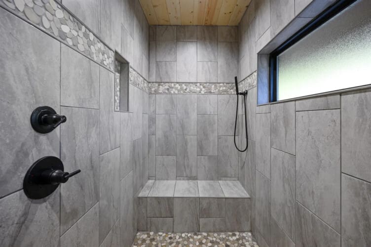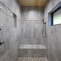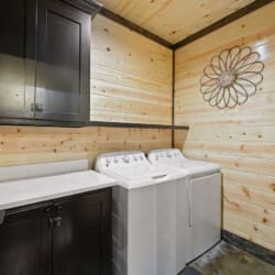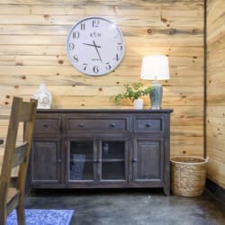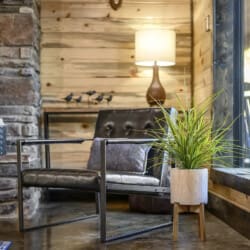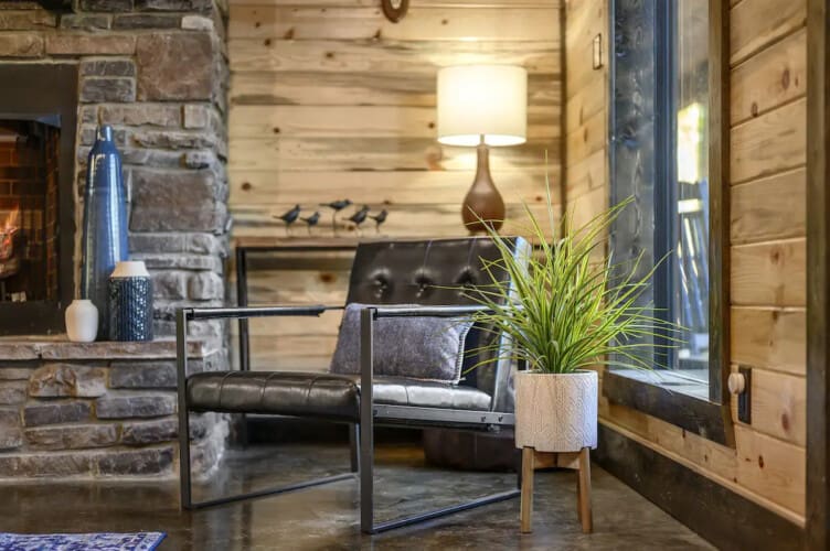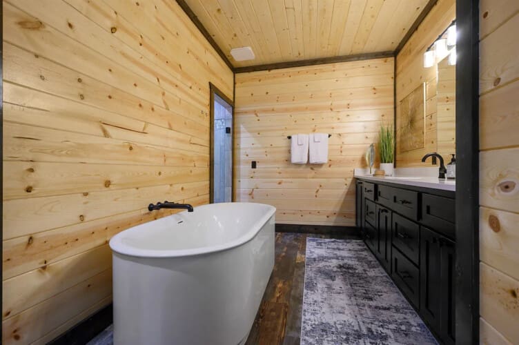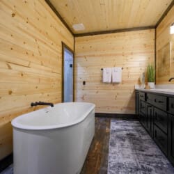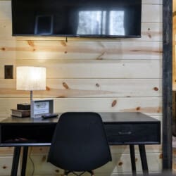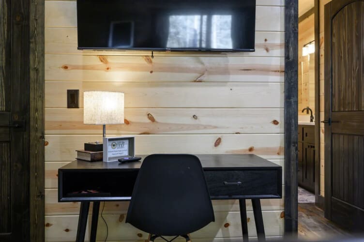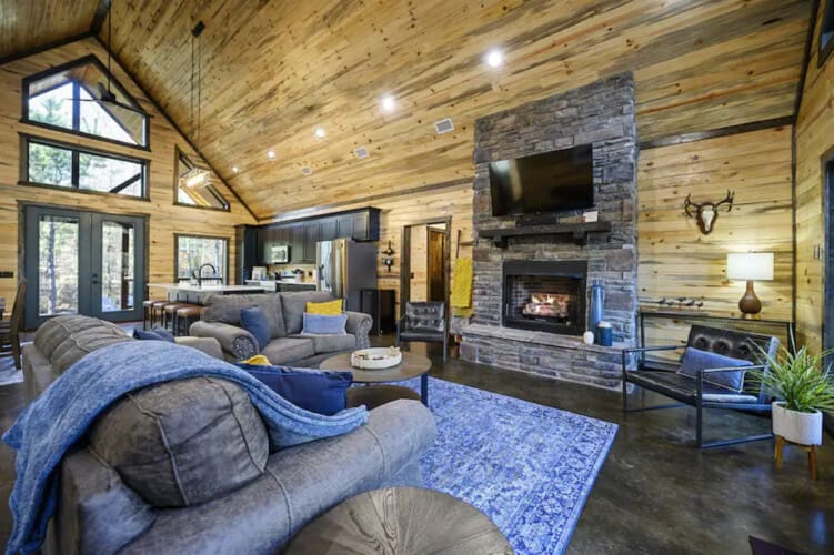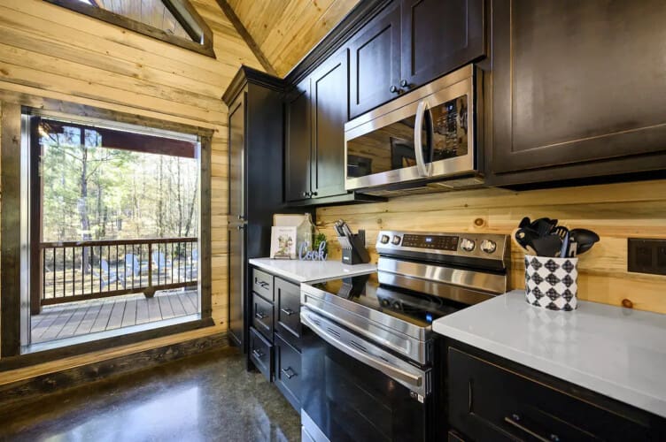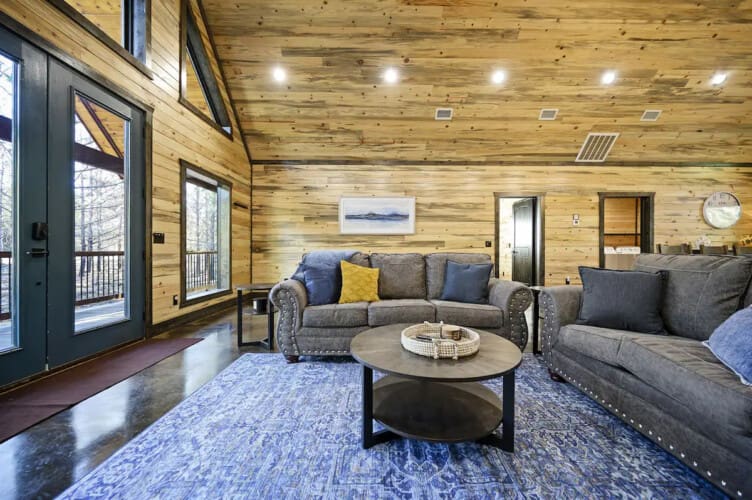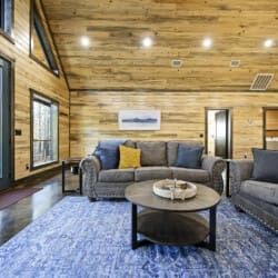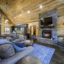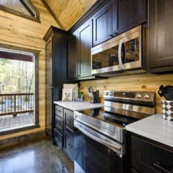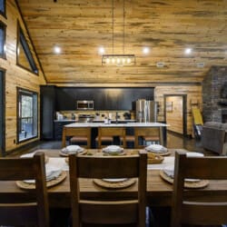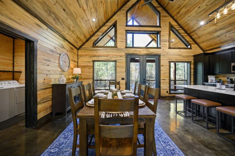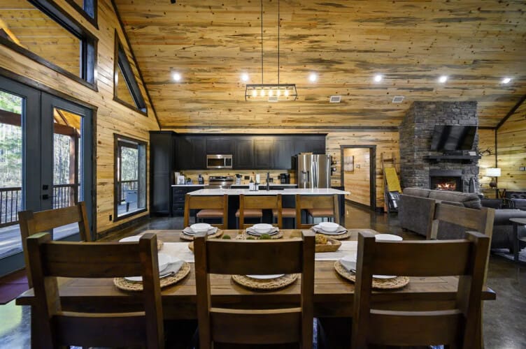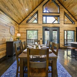 As you walk into the cabin, you are greeted by warm wood, open spaces, and abundant natural light. The great room features floor-to-ceiling windows that bring the outside in, with views of the forest and a gas-lit fireplace for cozy evenings.