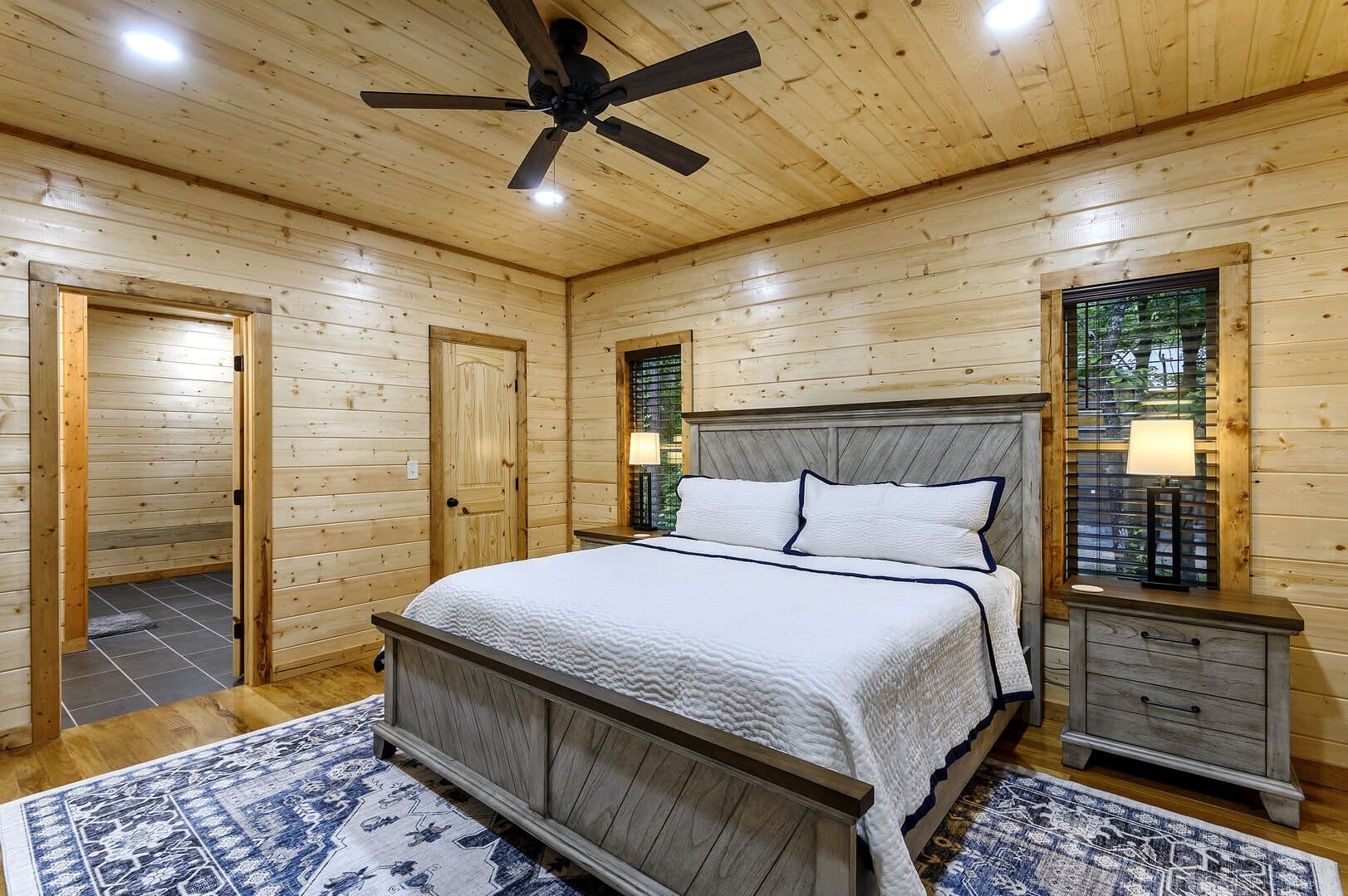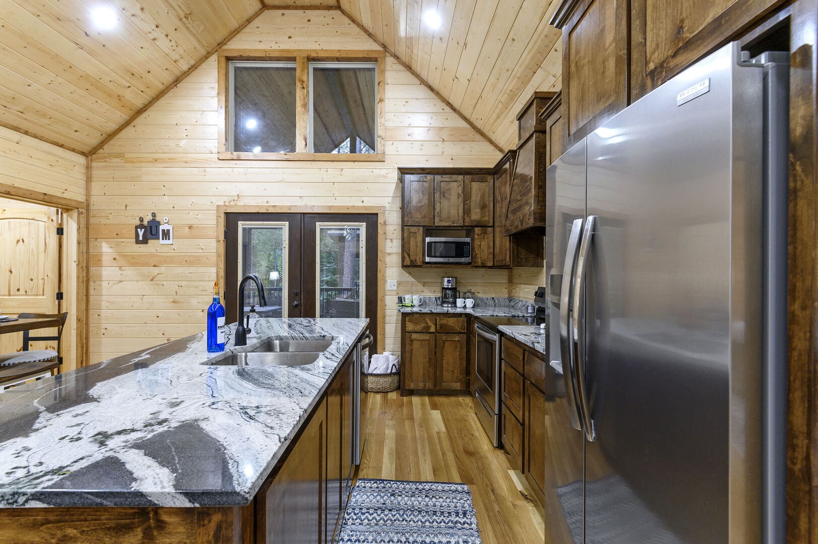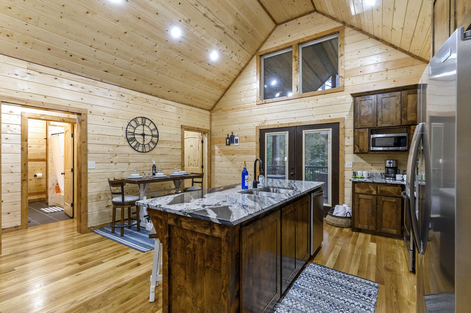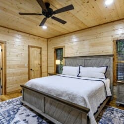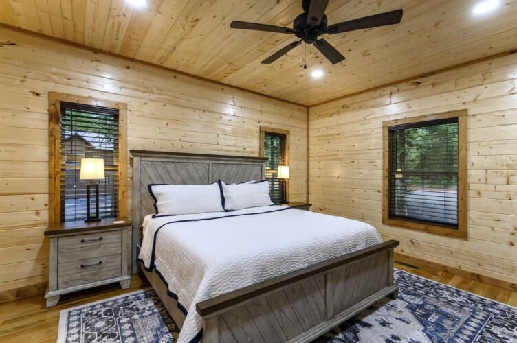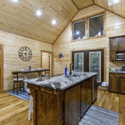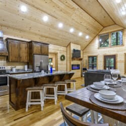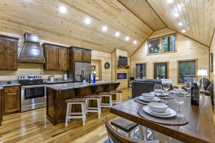 As you step into the cabin, the Living Room welcomes you with two comfortable couches, an electric fireplace, a big-screen TV, and throw blankets—an inviting space to unwind after a day of exploration. The Kitchen and Dining area boasts full-size appliances, a coffee pot, knife set, cutting boards, cooking utensils, pots and pans, dishes, flatware, and drinkware. With seating for up to 8, enjoy meals at the dining table for four and the kitchen island.