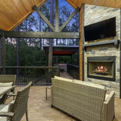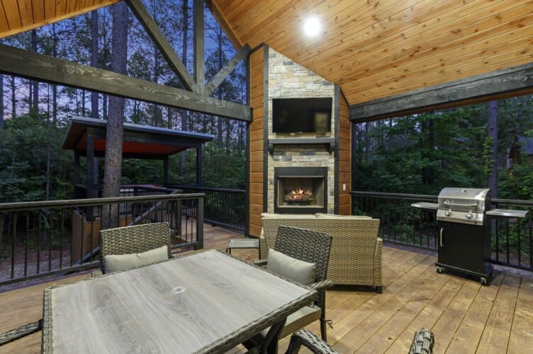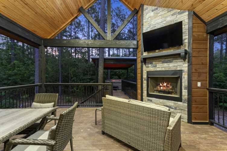 Step into the Outdoor space, where relaxation and entertainment intertwine. A big-screen TV, gas fireplace, patio furniture, dining table for 4, hot tub, and firepit with seating for 4 create a perfect ambiance for outdoor enjoyment.