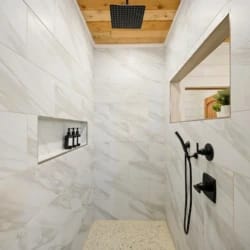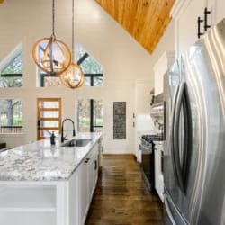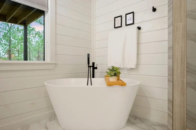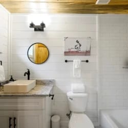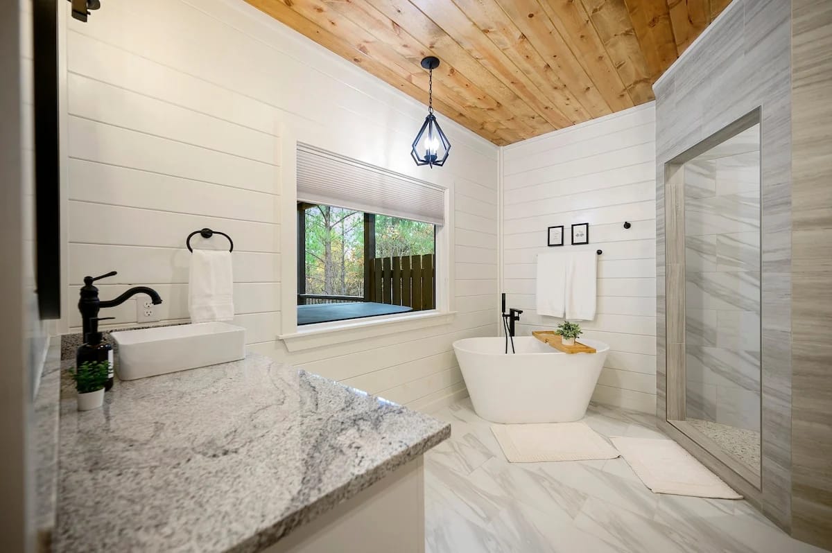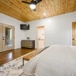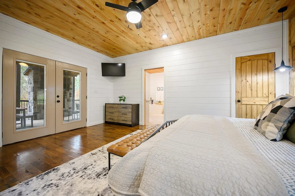 The downstairs master suite of Hit Refresh offers a peaceful place to rest. It has a king-size bed, Smart HDTV, nightstands, and a full dresser. French doors lead directly from the bedroom to the lower back deck, allowing quiet access to the fresh air and forest views. The attached bathroom feels like a spa, with a double vanity, deep soaking tub, and walk-in shower equipped with a rainfall shower head and handheld wand.