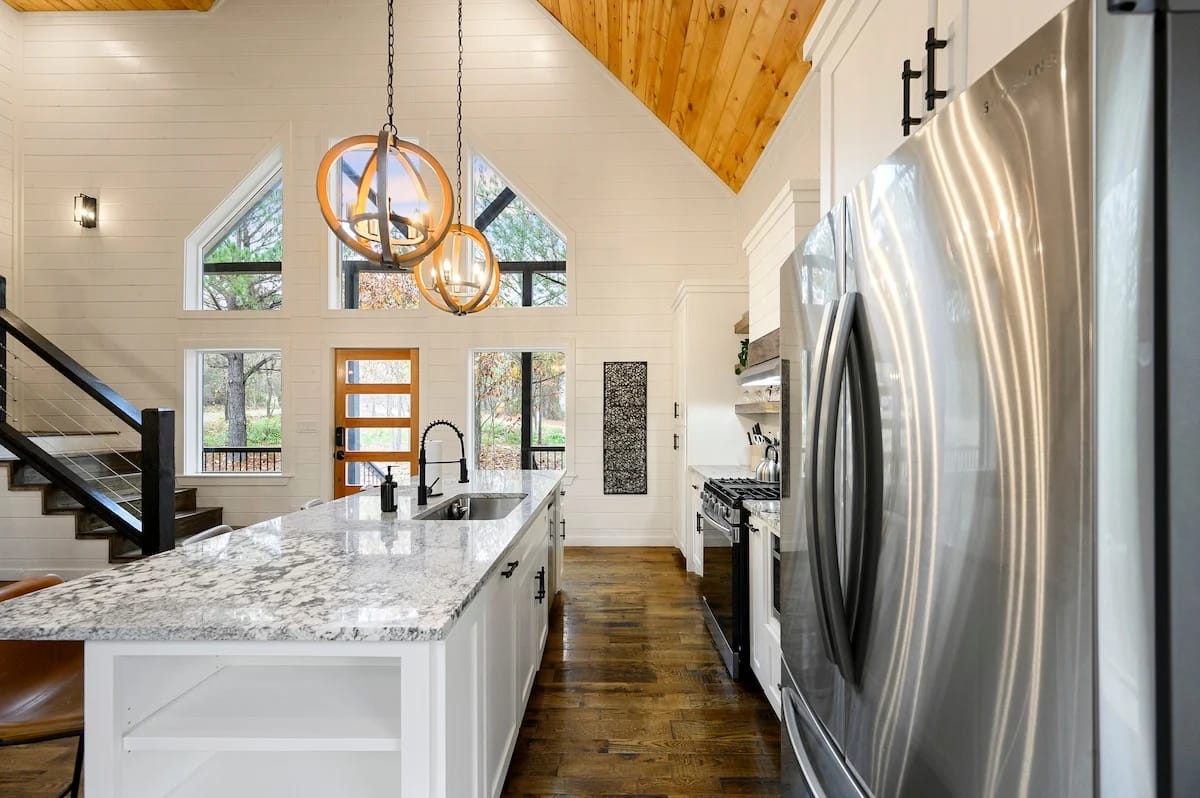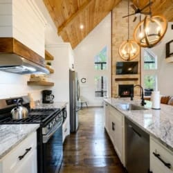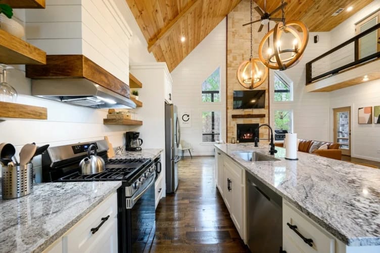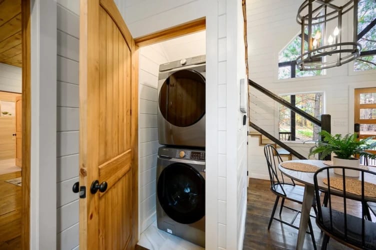 The kitchen is thoughtfully stocked and designed to bring people together. It features a gas stovetop and oven and a variety of tools and appliances, including a drip coffee maker, Keurig, crock pot, toaster, and blender. Guests can easily cook full meals or prepare quick snacks. The island includes barstool seating for four, while the dining table seats four more, making meals and conversation flow naturally.