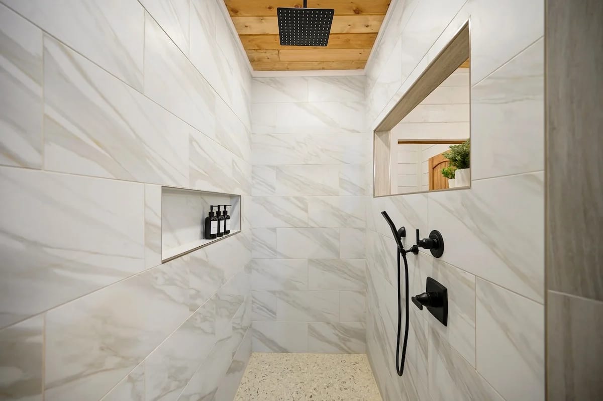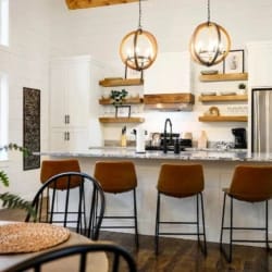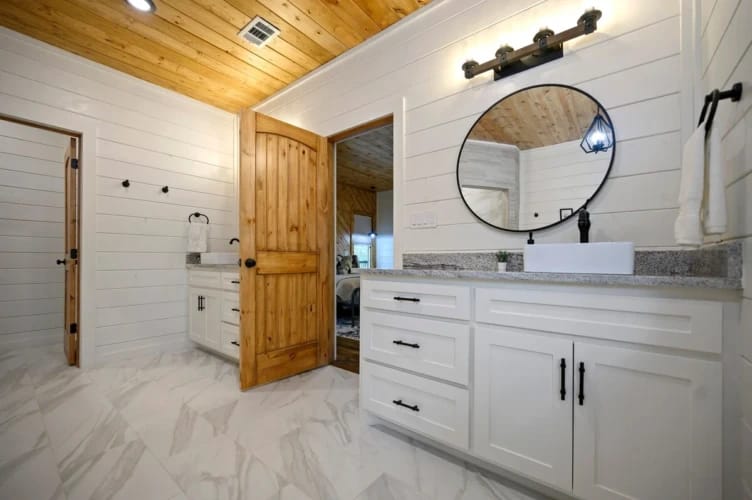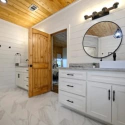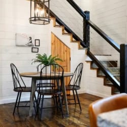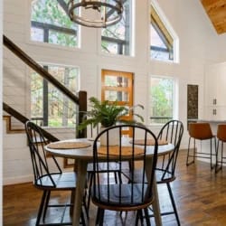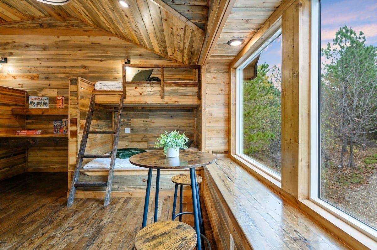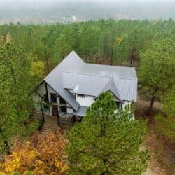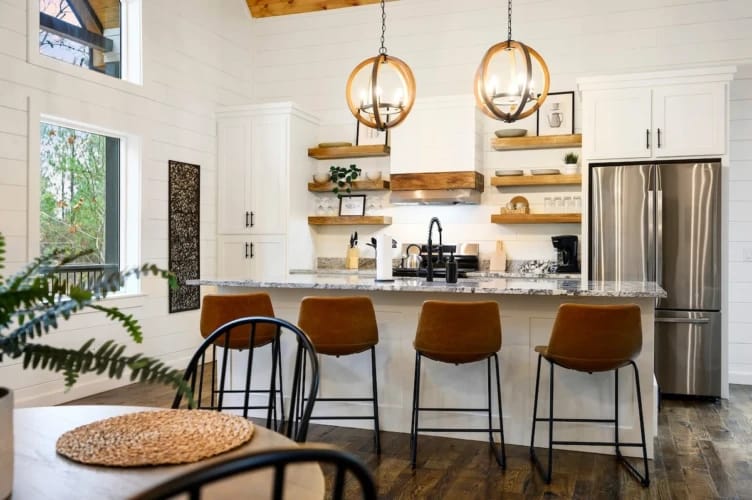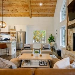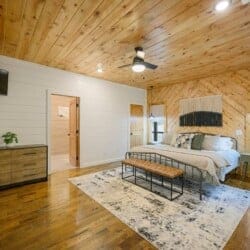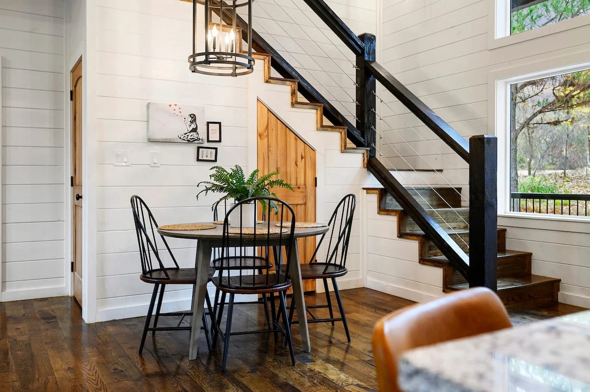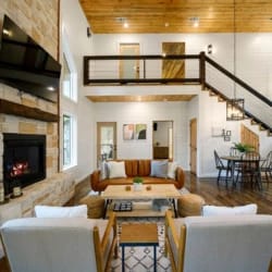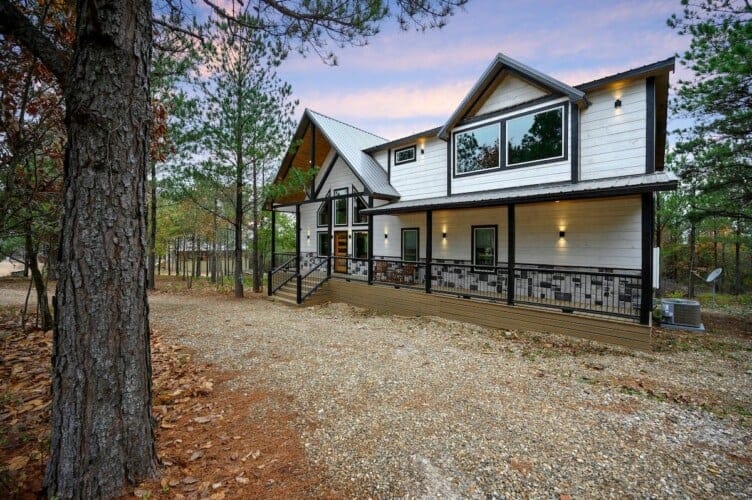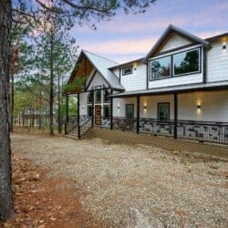 Hit Refresh offers the perfect blend of modern farmhouse charm and natural beauty, nestled among the tall pines of Broken Bow, Oklahoma. Set over an acre of private wooded land, this inviting cabin is ideal for couples or families seeking a peaceful escape. The two-story design includes a master suite on the lower level and a game and bunk room upstairs, accommodating up to eight guests.