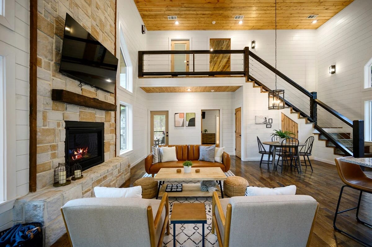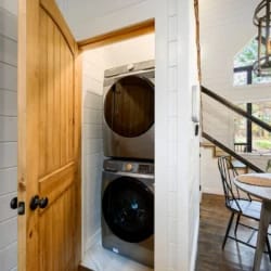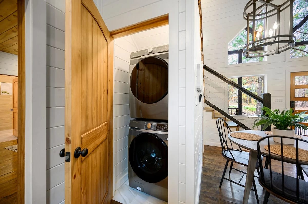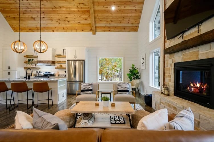 Inside, the Hit Refresh cabin opens to a warm, cozy living space where soft lighting, rustic details, and stylish furniture create a relaxing environment. A comfortable leather sofa and two armchairs sit around the gas fireplace, offering the perfect spot to unwind after a long day exploring Hochatown. A large Smart HDTV is mounted above the fireplace for easy movie nights or catching up on your favorite shows. Nearby, a tucked-away laundry closet adds everyday convenience.