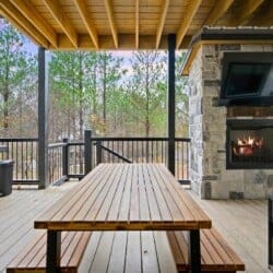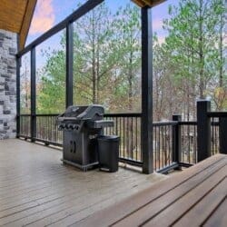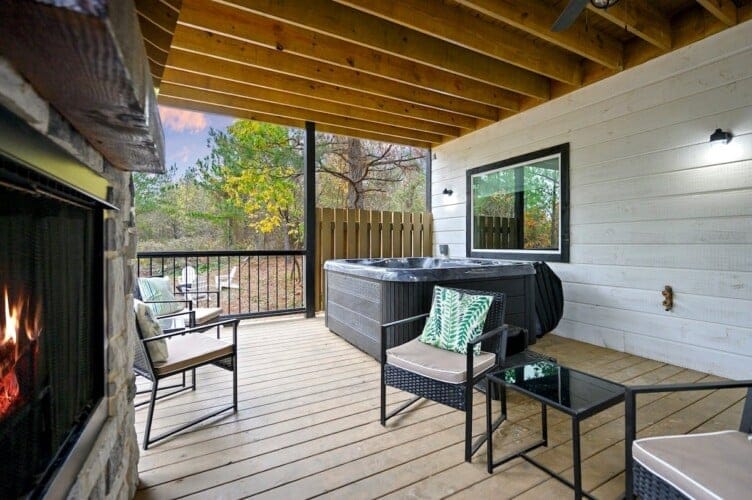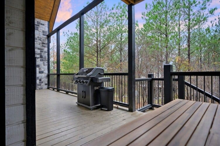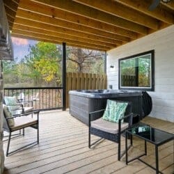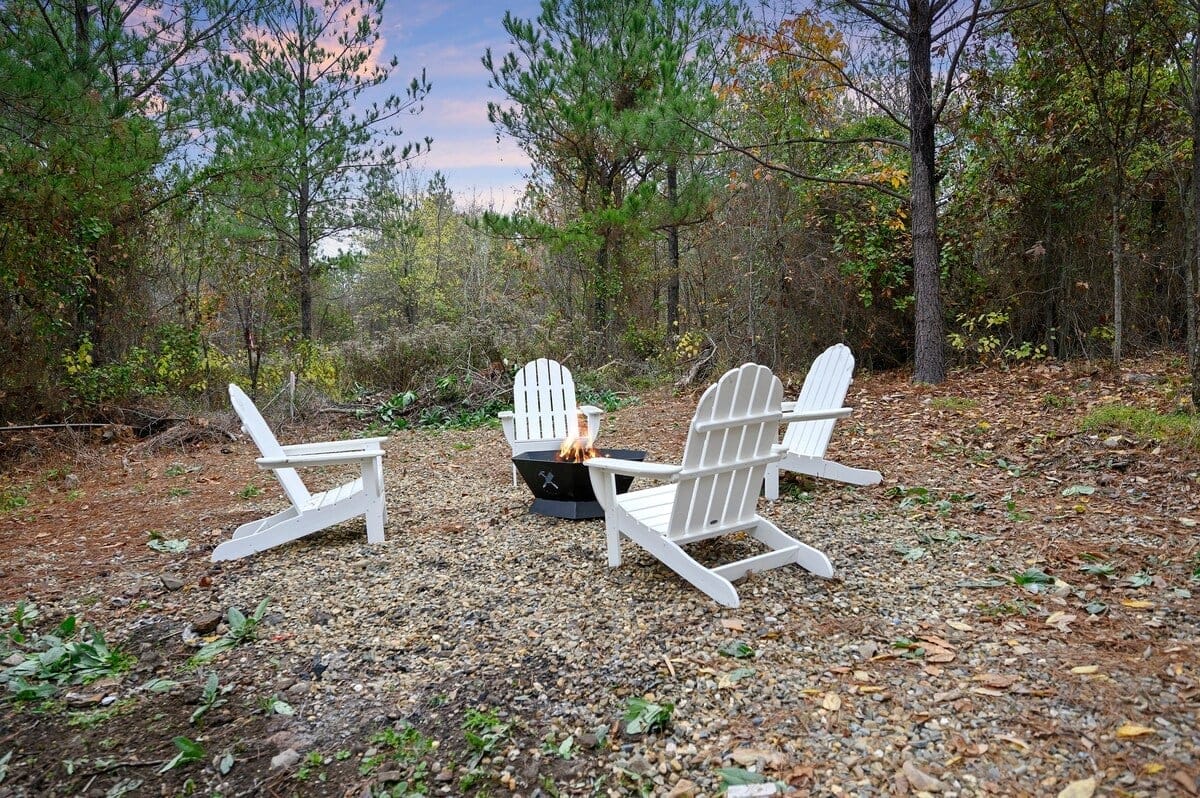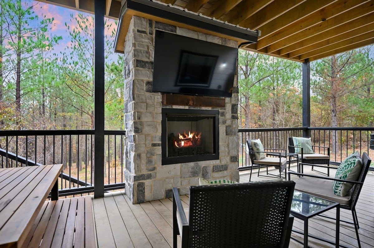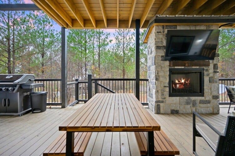 Outside, Hit Refresh makes the most of its natural setting with three separate outdoor spaces. The front porch welcomes guests with two rocking chairs, perfect for quiet mornings. The lower back deck features a cozy lounge area around a seasonal gas fireplace, a large dining table, a Smart HDTV, a gas grill, and a bubbling hot tub. The upper deck includes more seating and its HDTV, while a short walk down leads to the fire pit, where guests can sit under the stars and roast marshmallows.