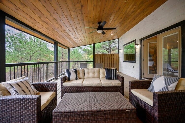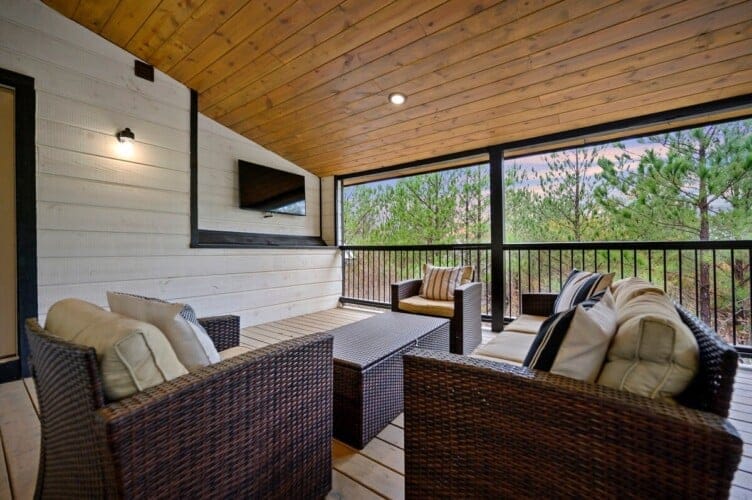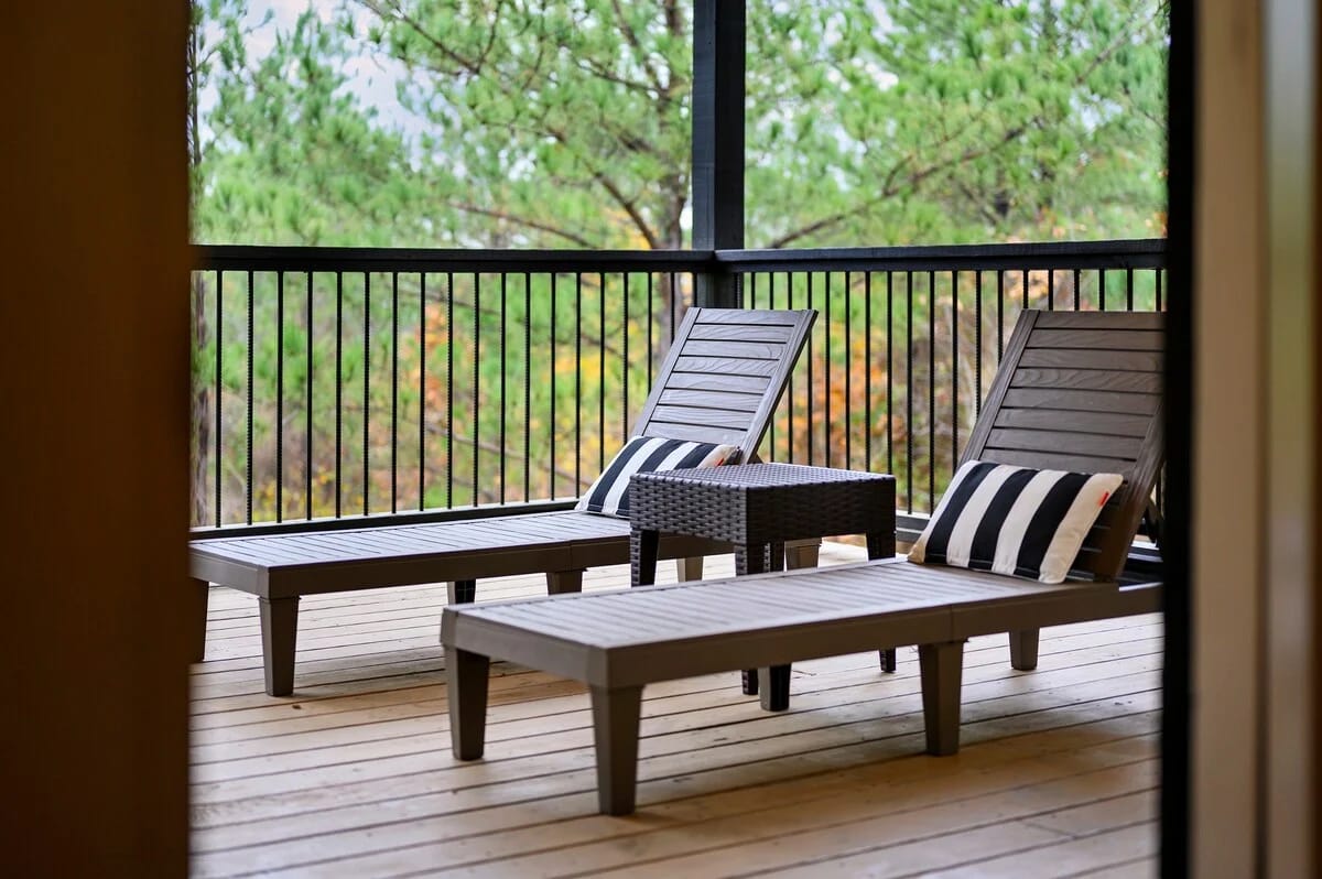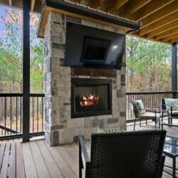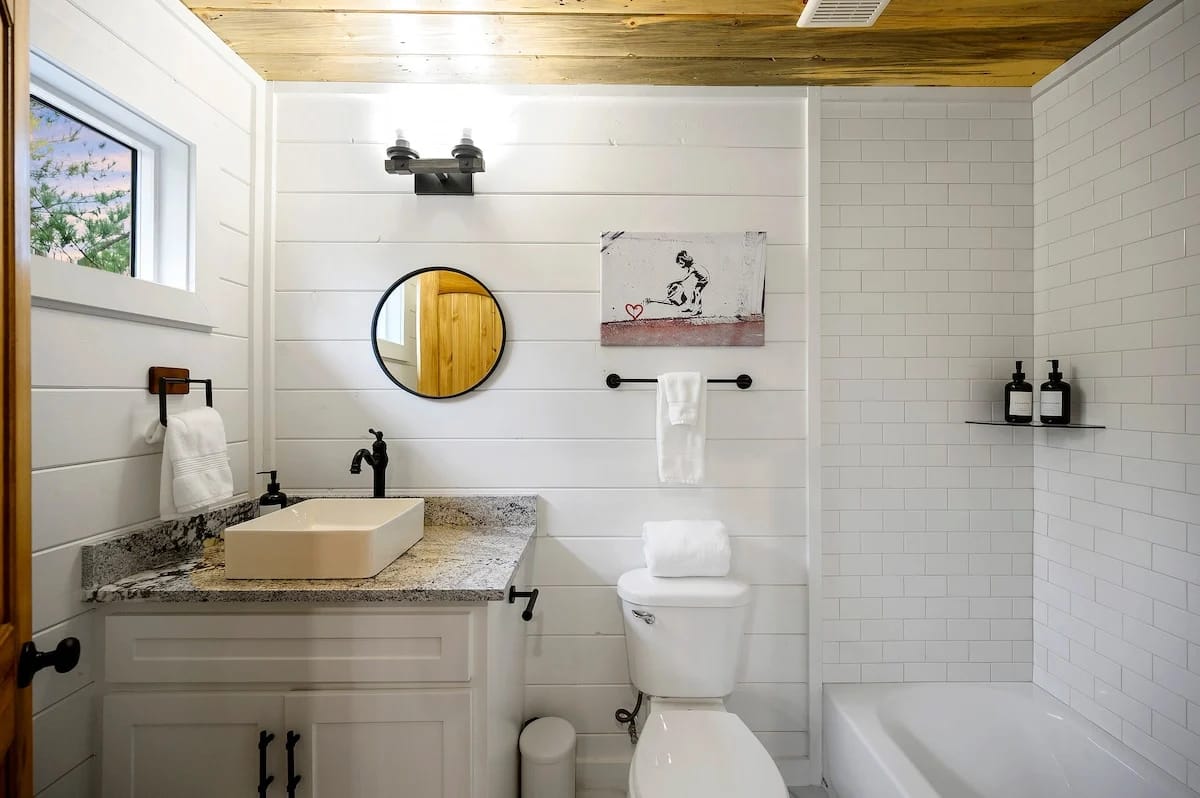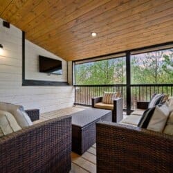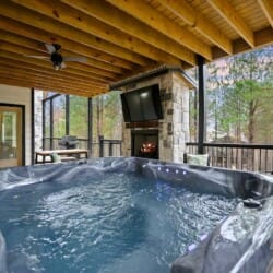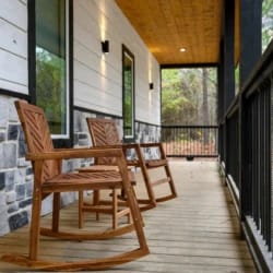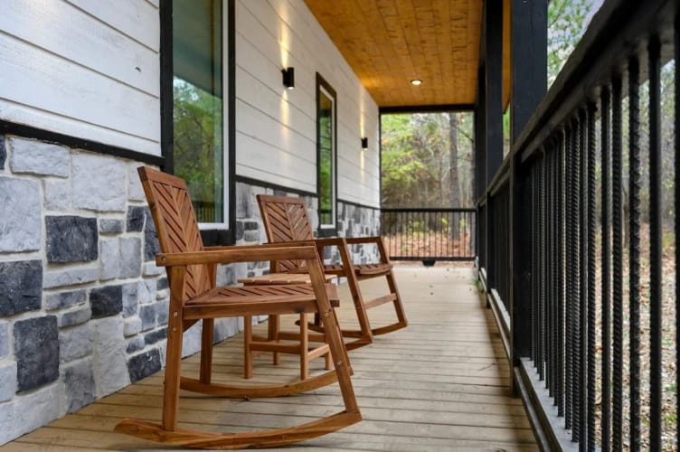 Outside, Hit Refresh makes the most of its natural setting with three separate outdoor spaces. The front porch welcomes guests with two rocking chairs, perfect for quiet mornings. The lower back deck features a cozy lounge area around a seasonal gas fireplace, a large dining table, a Smart HDTV, a gas grill, and a bubbling hot tub. The upper deck includes more seating and its HDTV, while a short walk down leads to the fire pit, where guests can sit under the stars and roast marshmallows.
