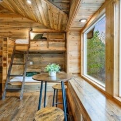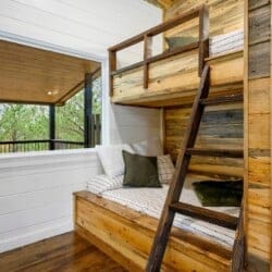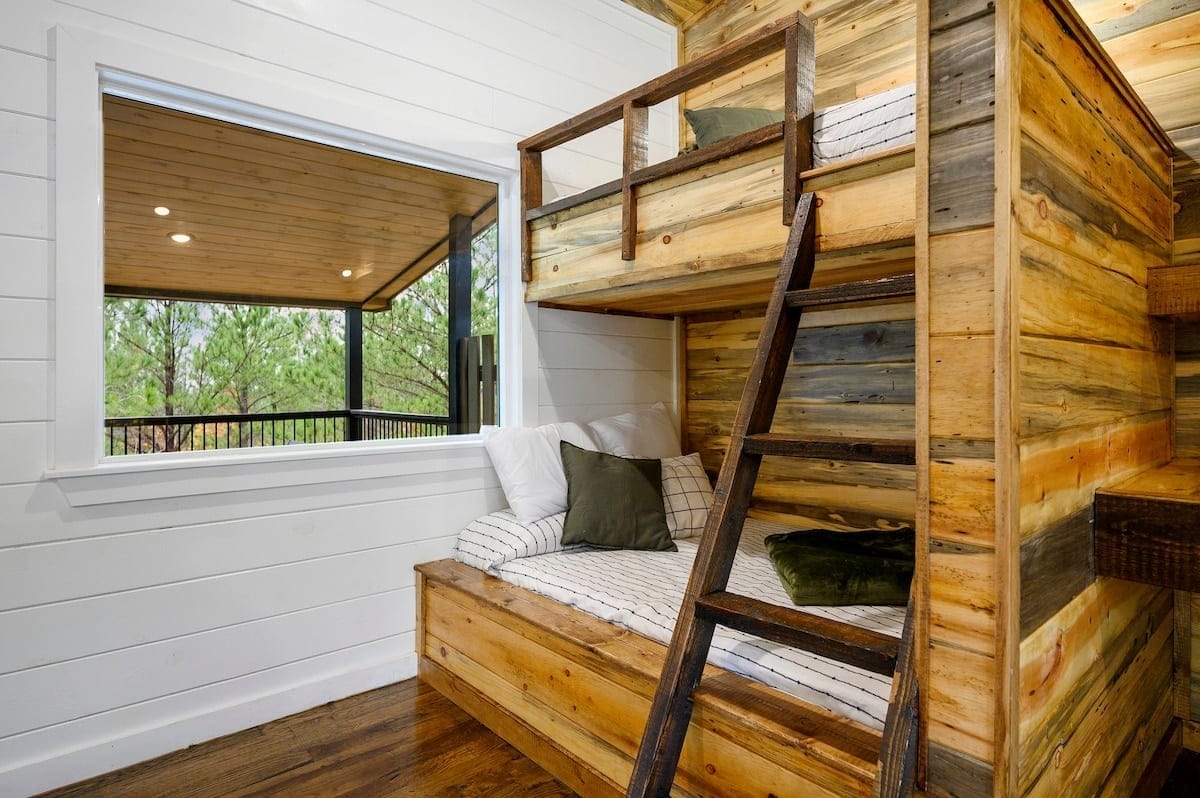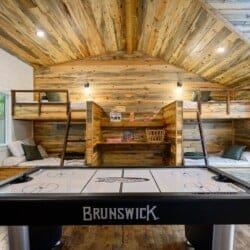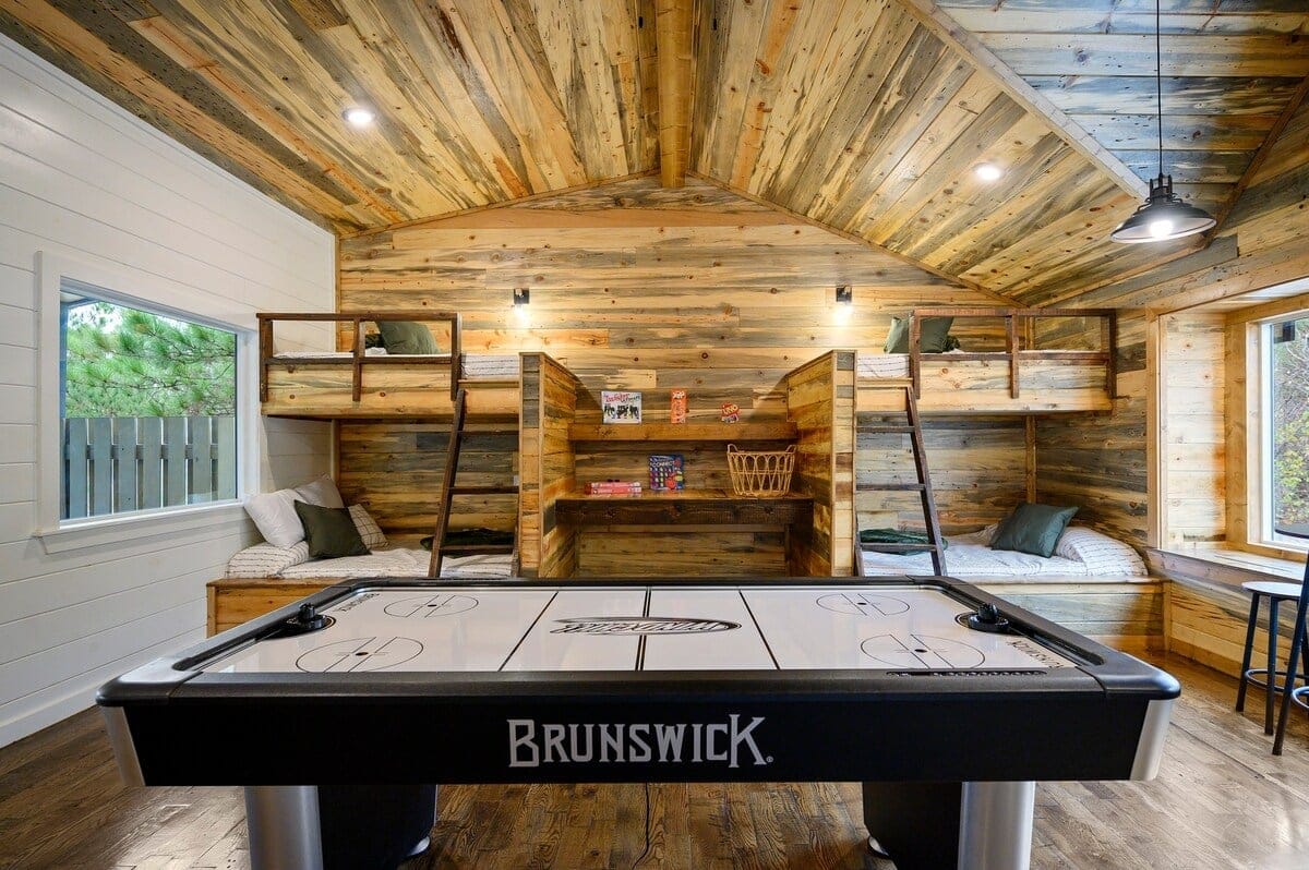 Upstairs, the bunk and game room offer a fun retreat for kids, teens, or anyone who wants to enjoy some play. This spacious room includes two twin-over-full bunk beds, an air hockey table, a retro-style arcade machine, and a bar-height table. There’s also a built-in desk, a second Smart HDTV, and a full en suite bathroom featuring a tub and shower combo. A private door leads out to the upper back deck, providing more relaxing space.