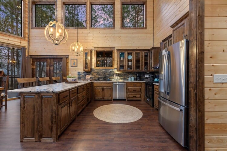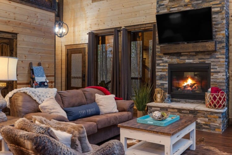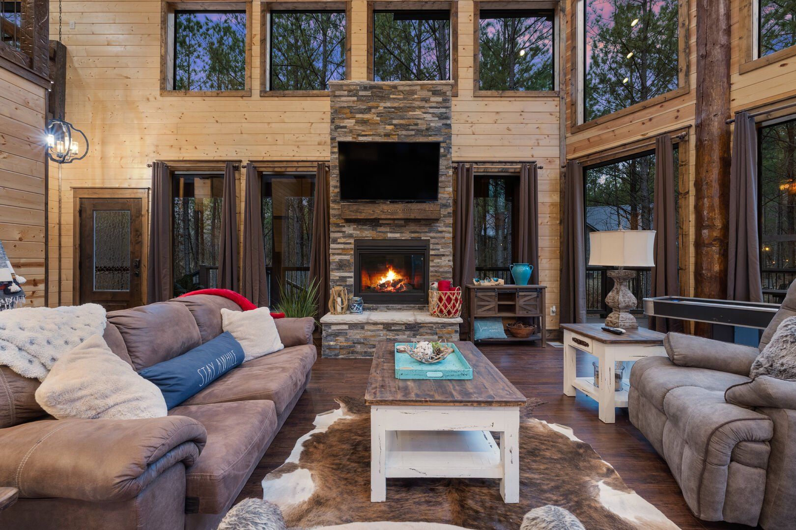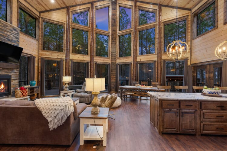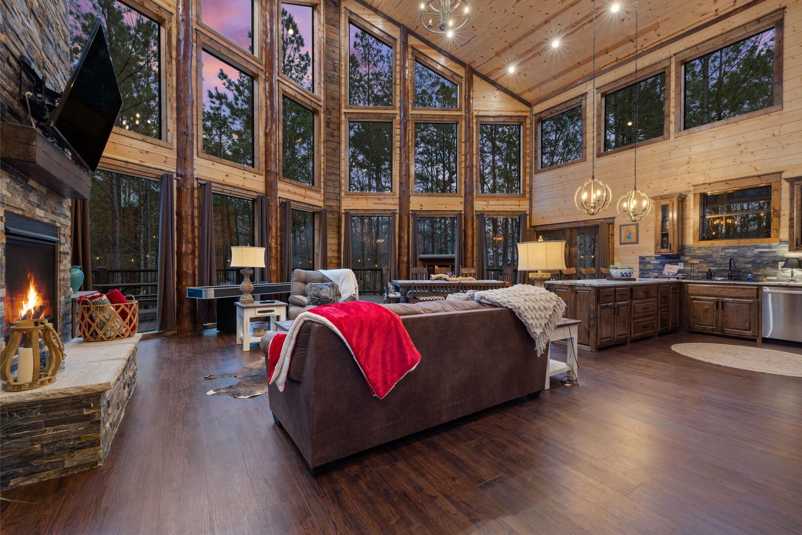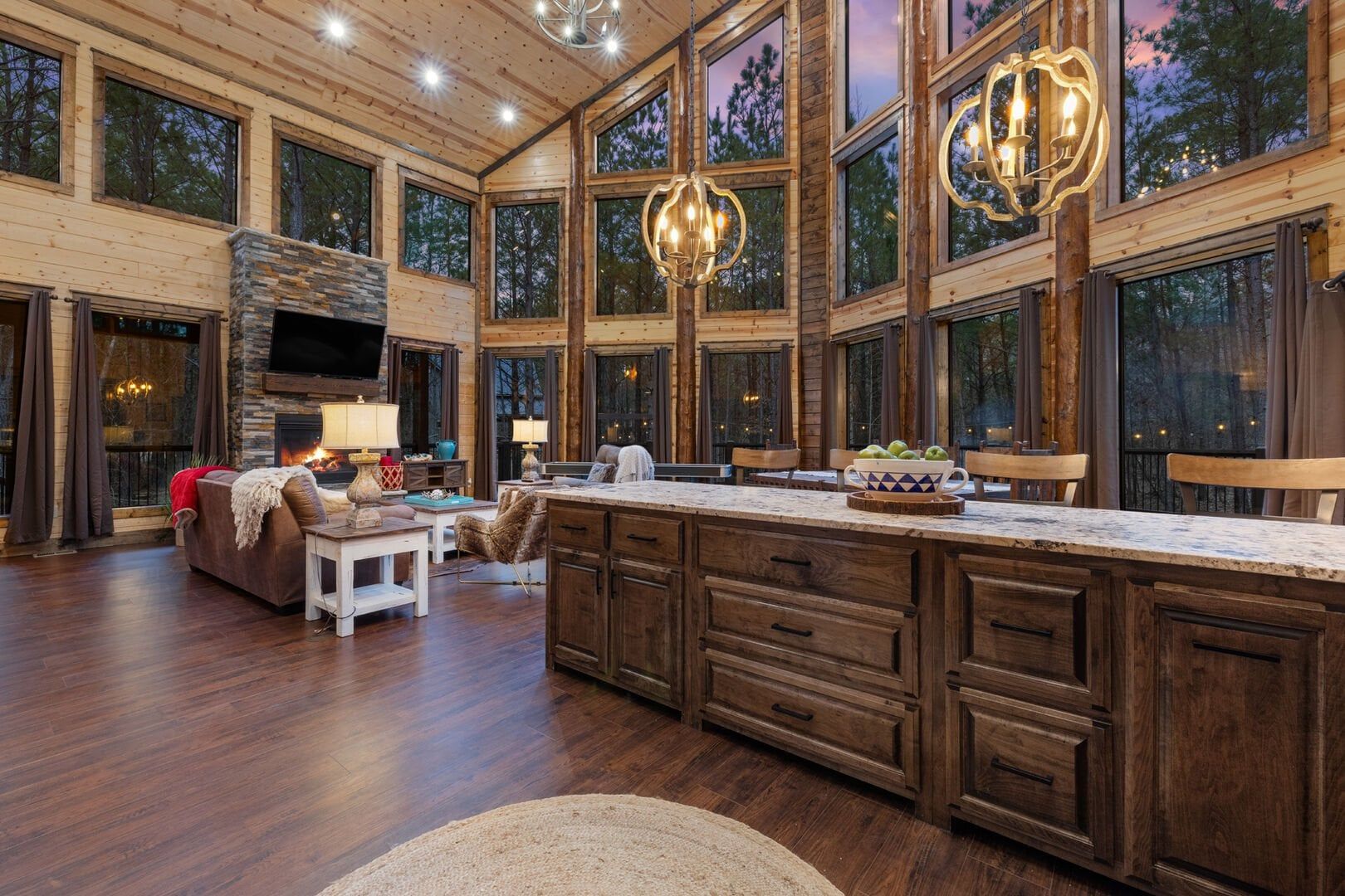 The living room at Hochatown Haven feels cozy and bright, thanks to the fireplace, flat-screen TV, and soft furnishings. Guests often gather here to watch a movie, play board games, or relax after an adventure-filled day. The wooden floors and tall ceilings add to the open feel, while the forest view through the windows reminds everyone they’re away from it all.