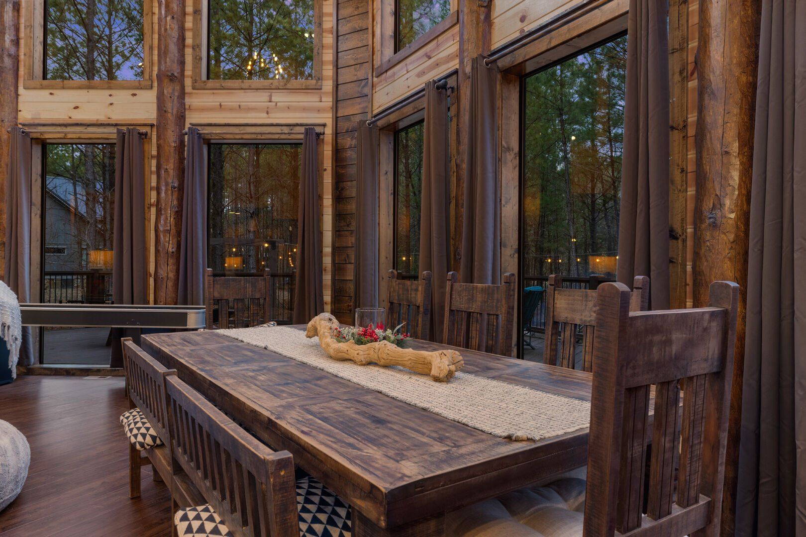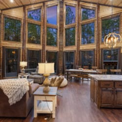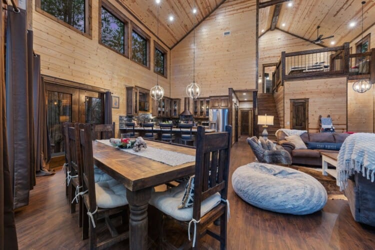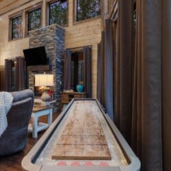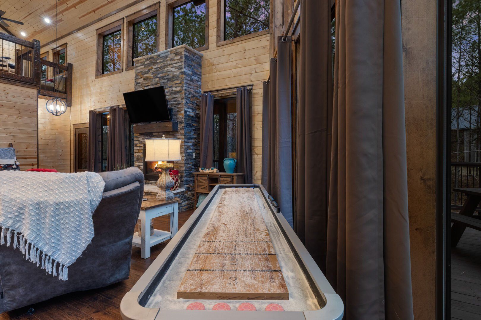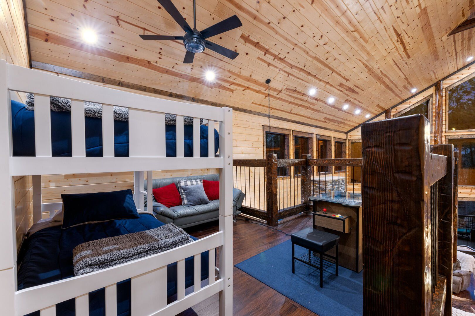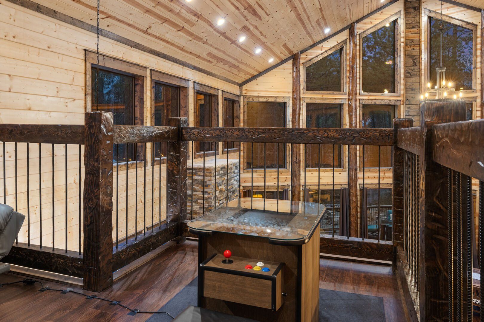 Upstairs, Hochatown Haven keeps the fun going with an arcade machine, games, and a cozy lounge area perfect for teens or those wanting a quiet moment with a good book. This room also opens up to views of the trees, letting the calm of the forest follow guests even inside.