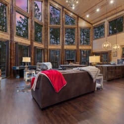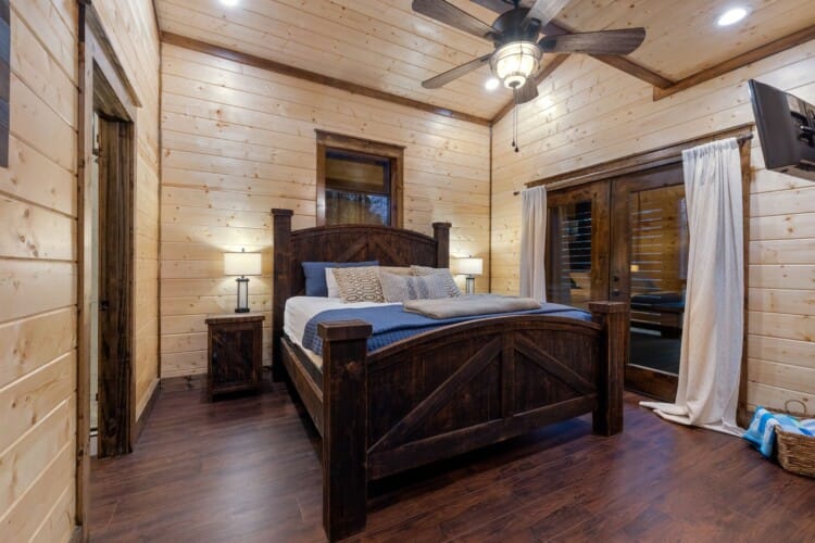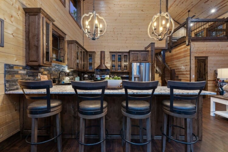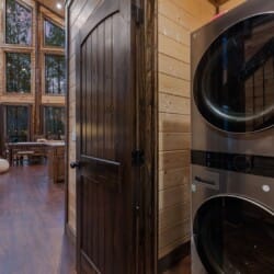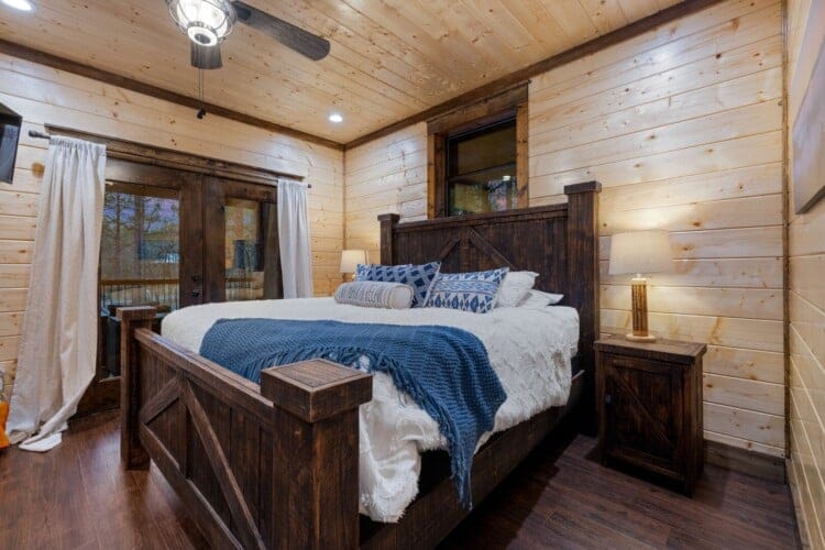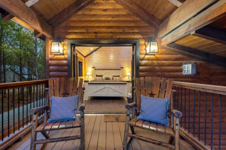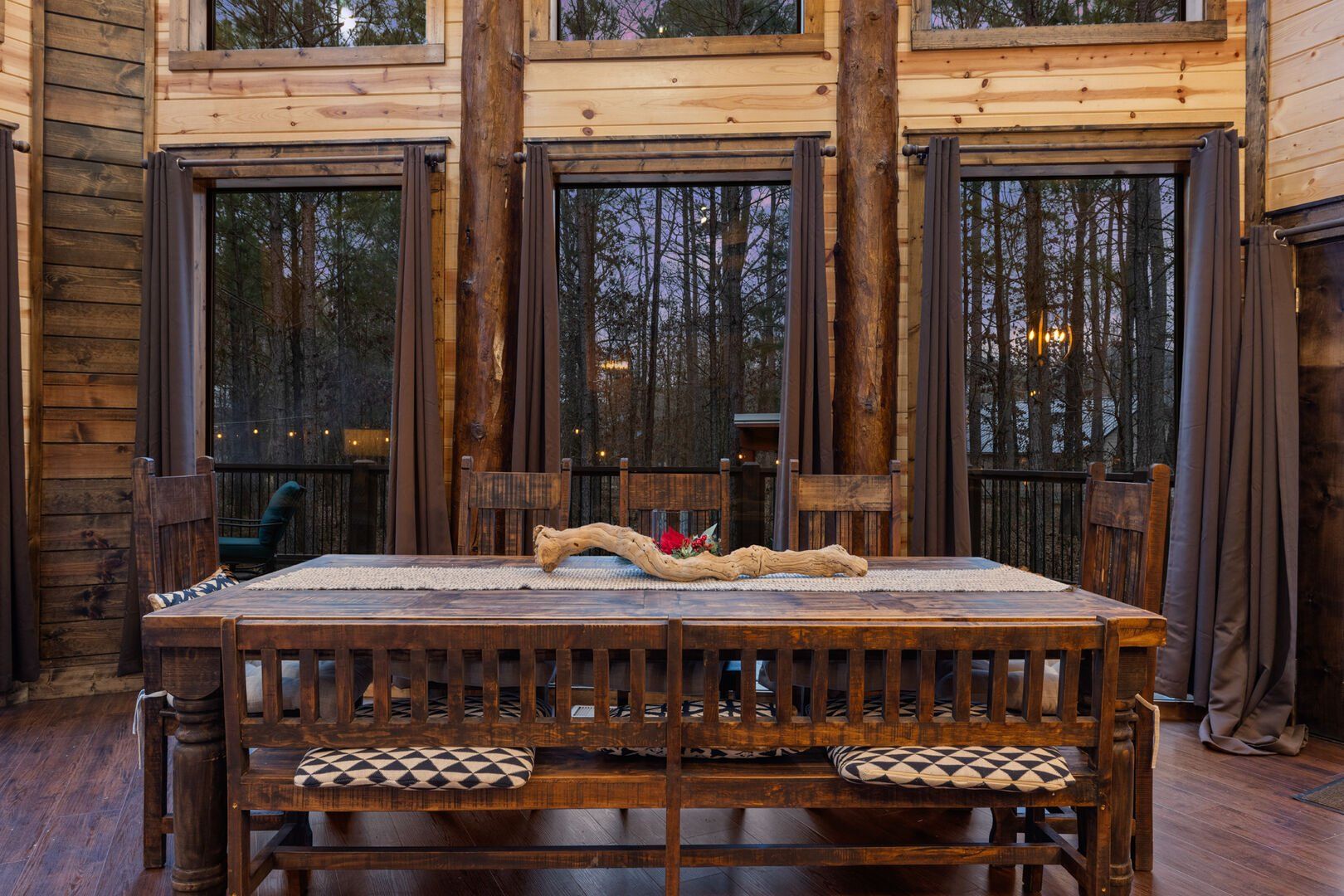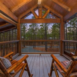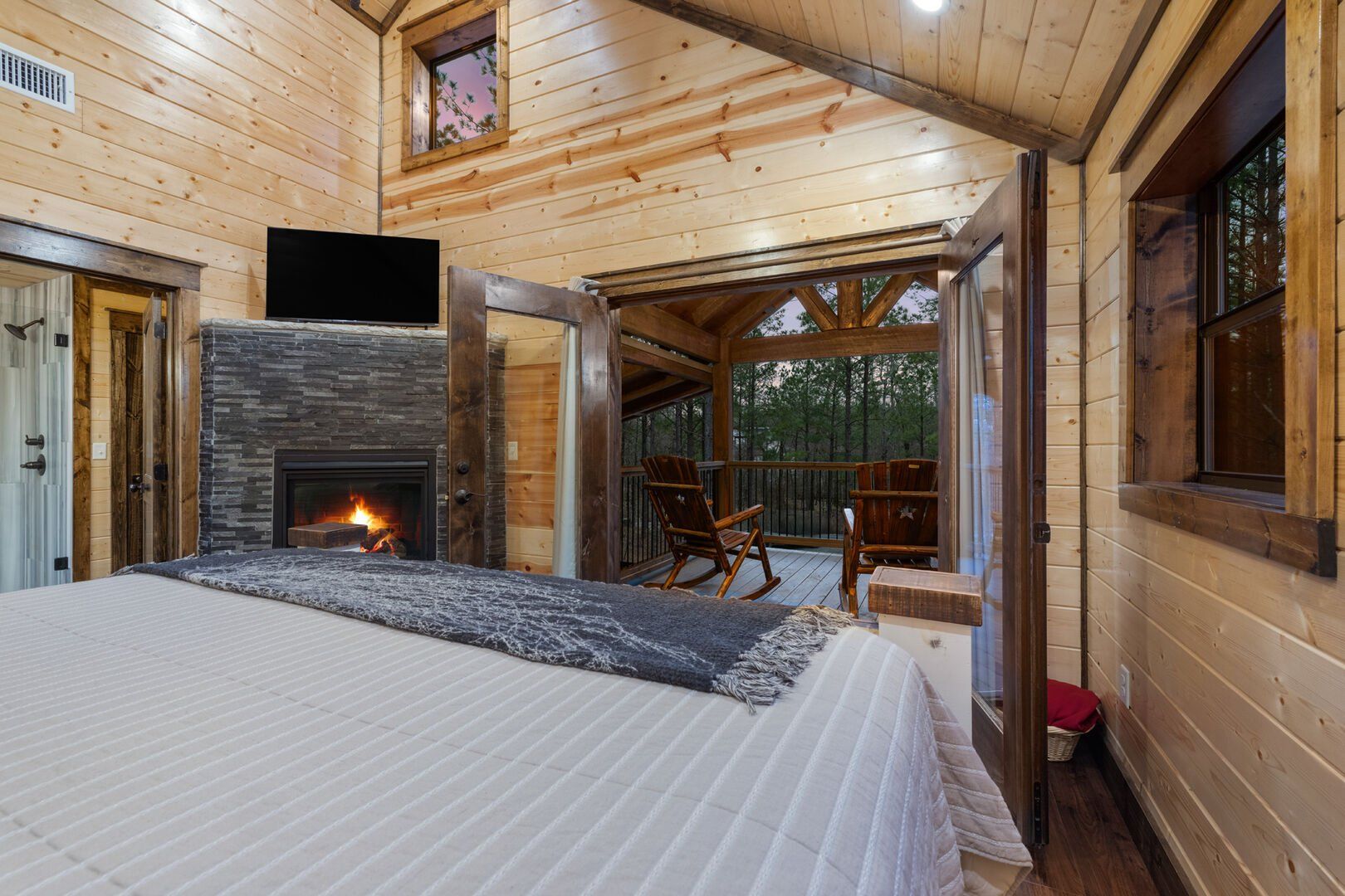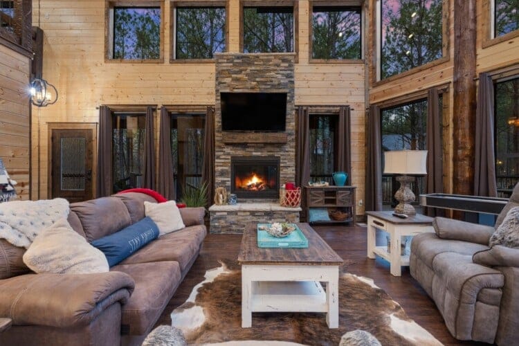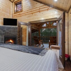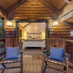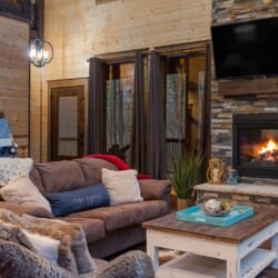 Upstairs, Hochatown Haven keeps the fun going with an arcade machine, games, and a cozy lounge area perfect for teens or those wanting a quiet moment with a good book. This room also opens up to views of the trees, letting the calm of the forest follow guests even inside.
