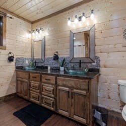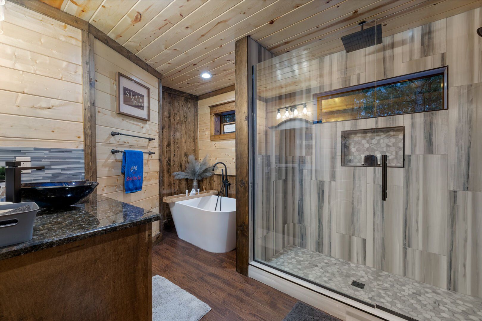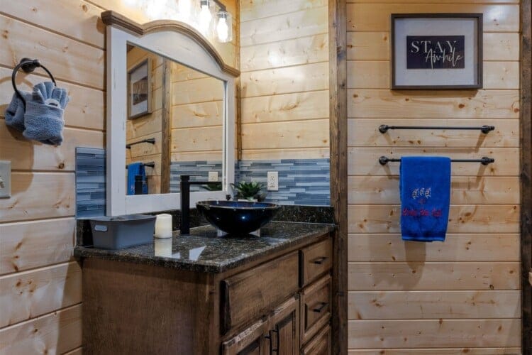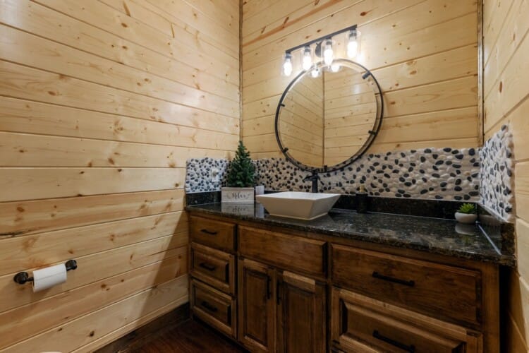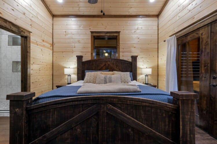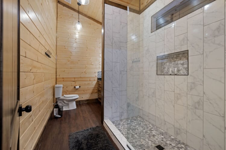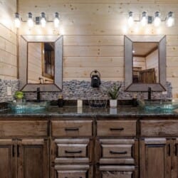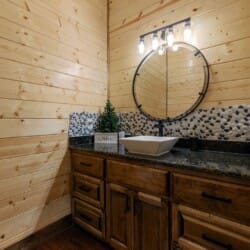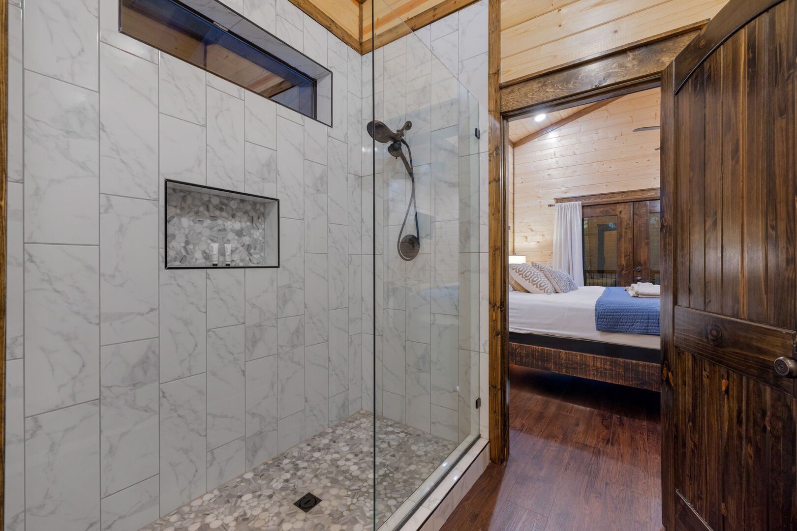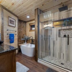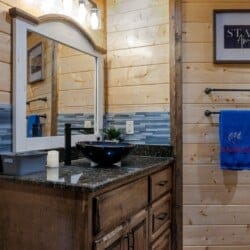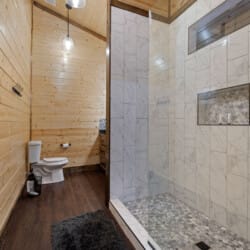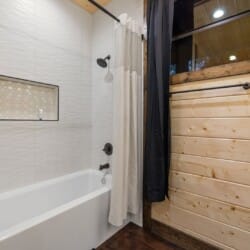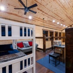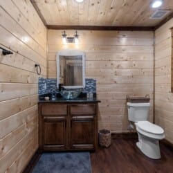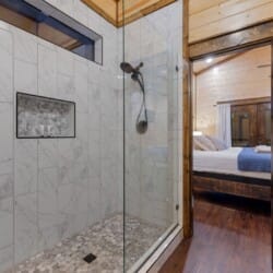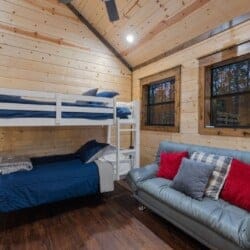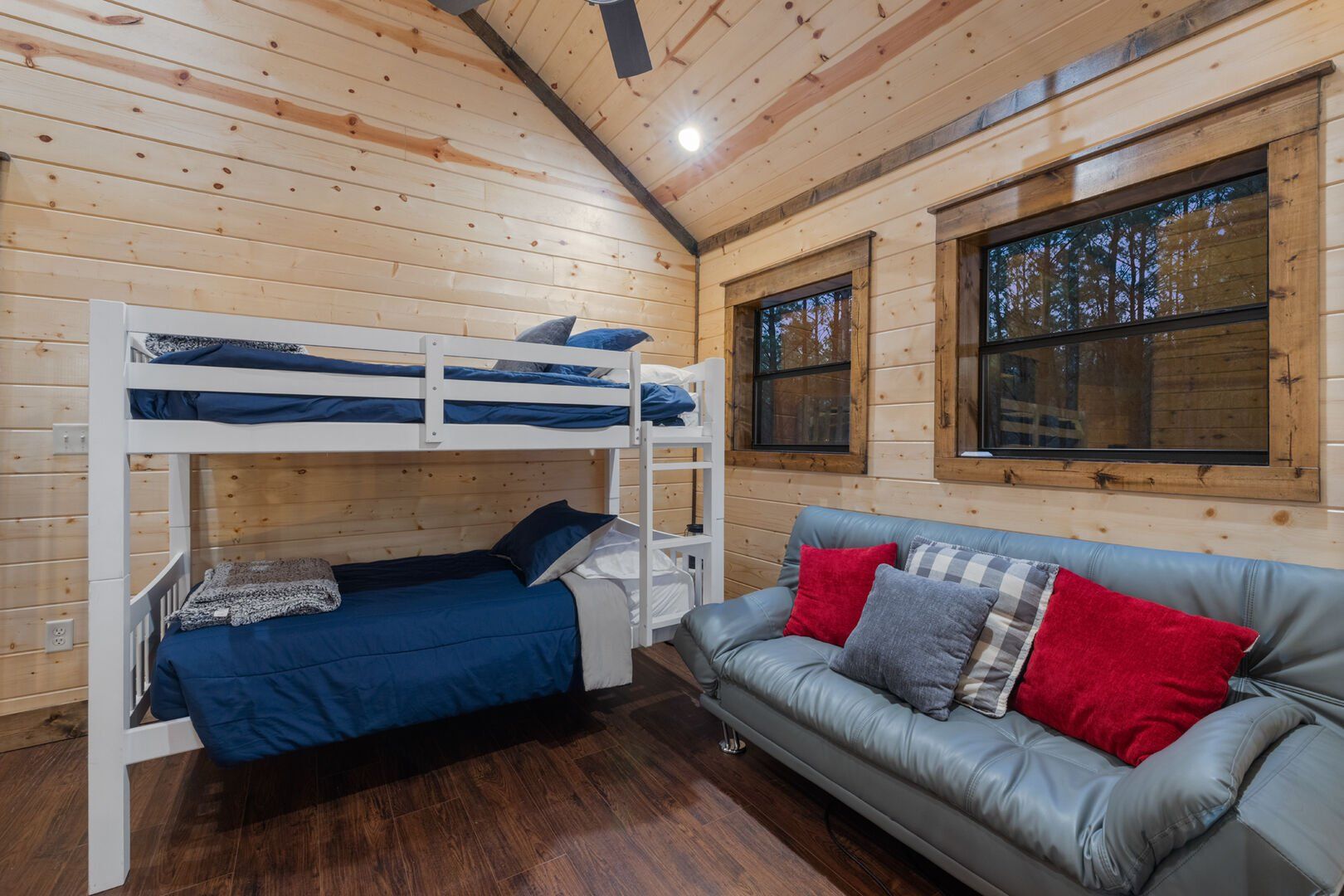 When it’s time to rest, Hochatown Haven delivers plenty of options. Each of the three king bedrooms offers privacy, style, and comfort, with ensuite bathrooms that feature walk-in showers and, in one, a soaking tub for extra relaxation. The upstairs bunk area features two twin beds and a sleeper sofa nearby, making it perfect for children or extra guests. With two additional half baths conveniently placed throughout the cabin, everyone has space and privacy.