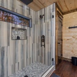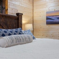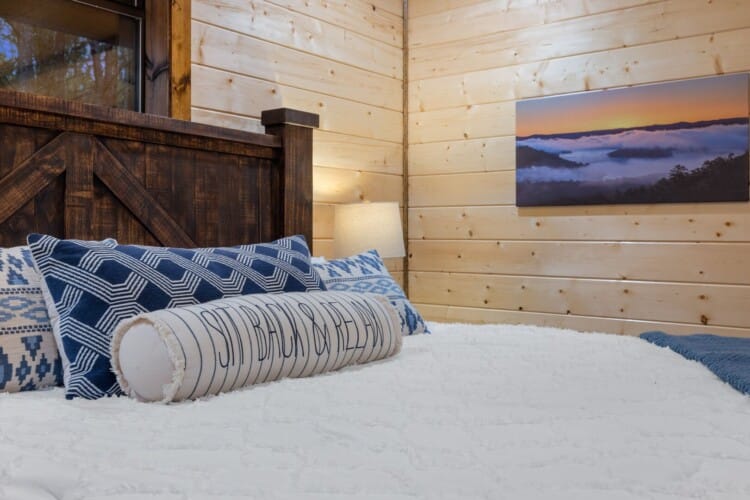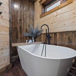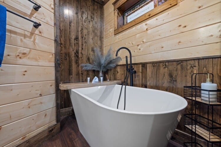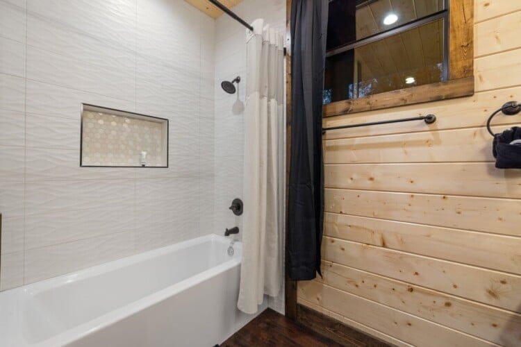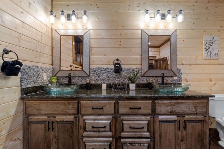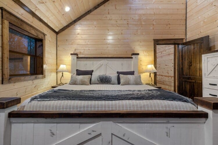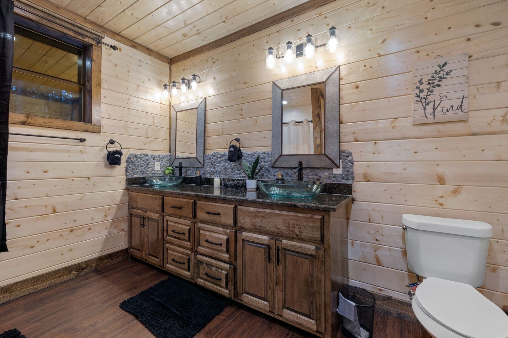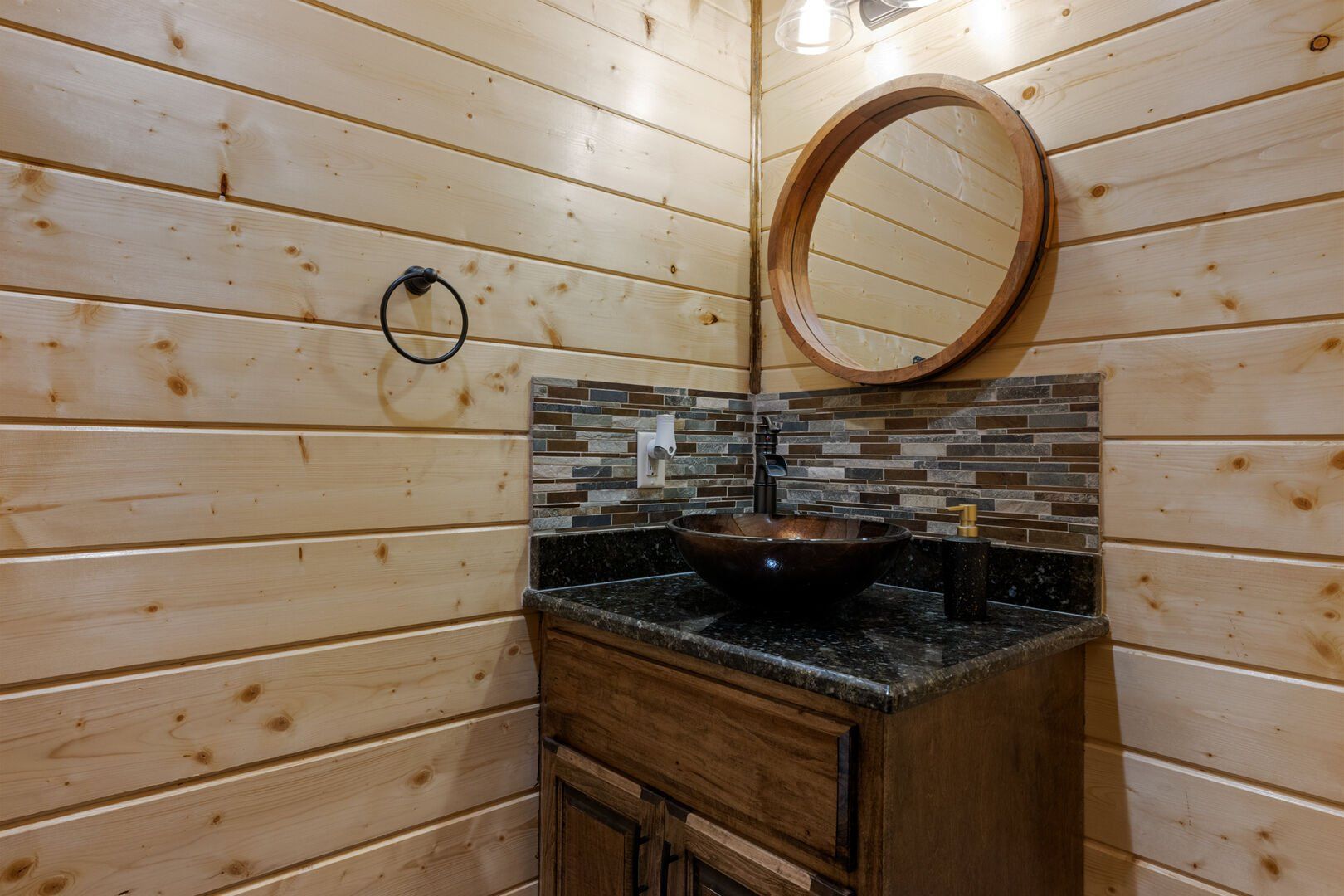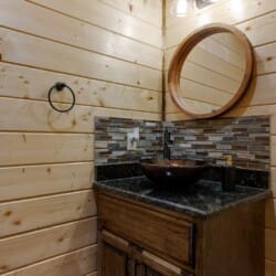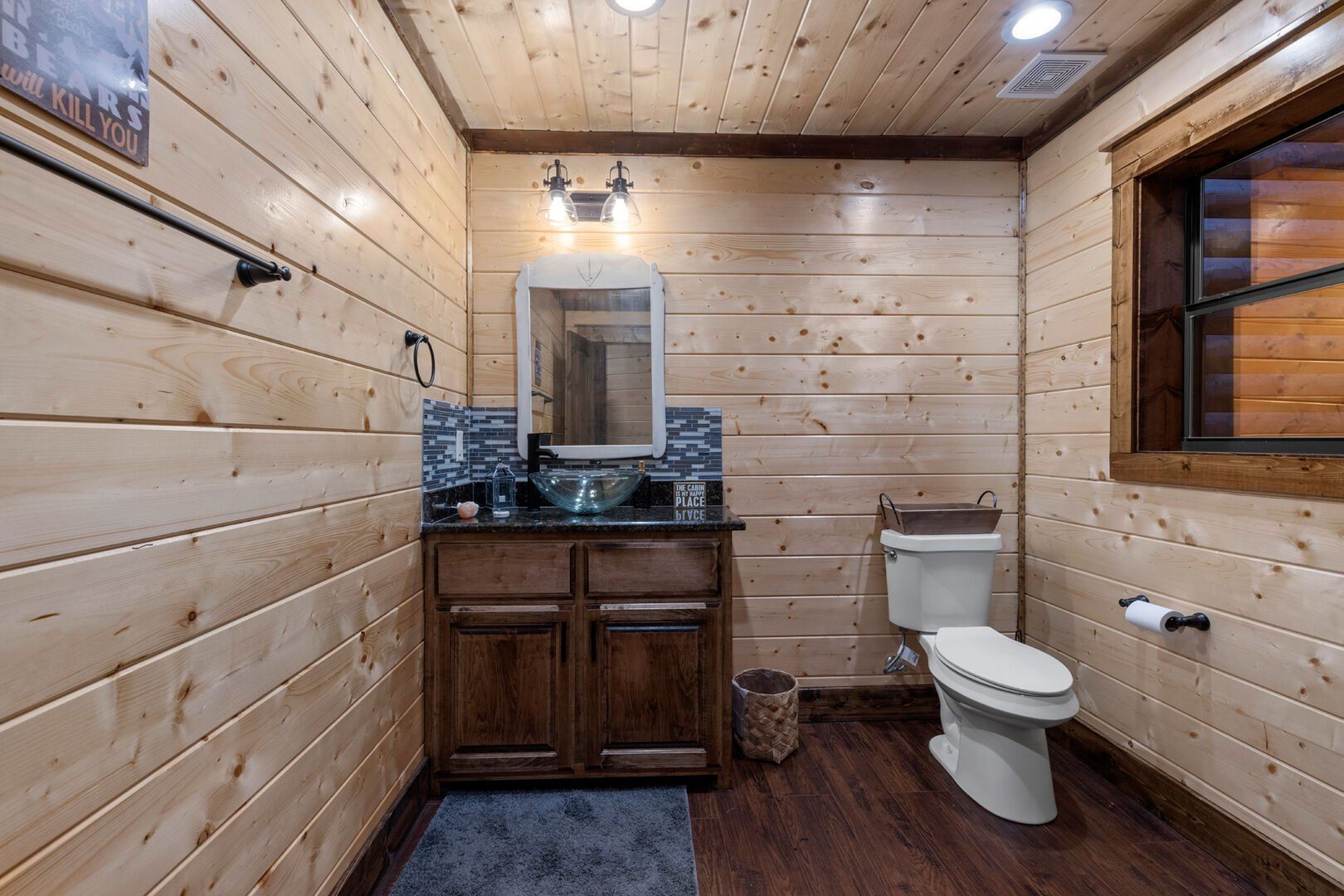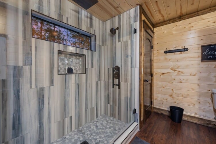 When it’s time to rest, Hochatown Haven delivers plenty of options. Each of the three king bedrooms offers privacy, style, and comfort, with ensuite bathrooms that feature walk-in showers and, in one, a soaking tub for extra relaxation. The upstairs bunk area features two twin beds and a sleeper sofa nearby, making it perfect for children or extra guests. With two additional half baths conveniently placed throughout the cabin, everyone has space and privacy.