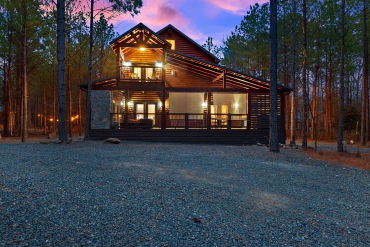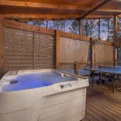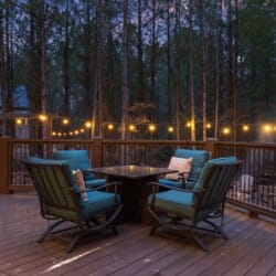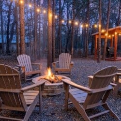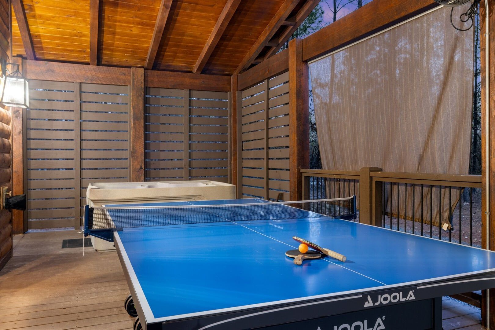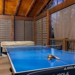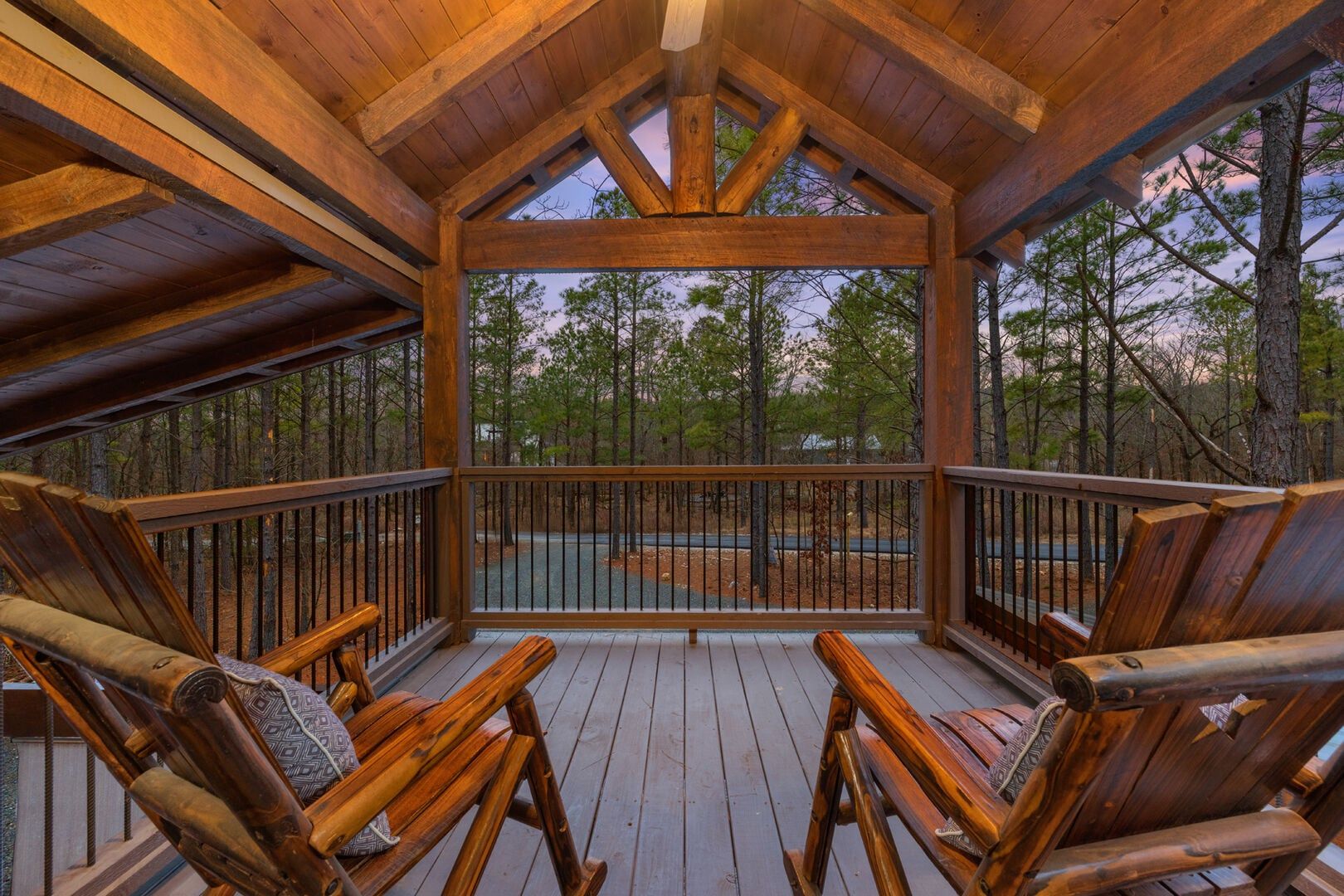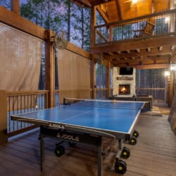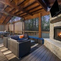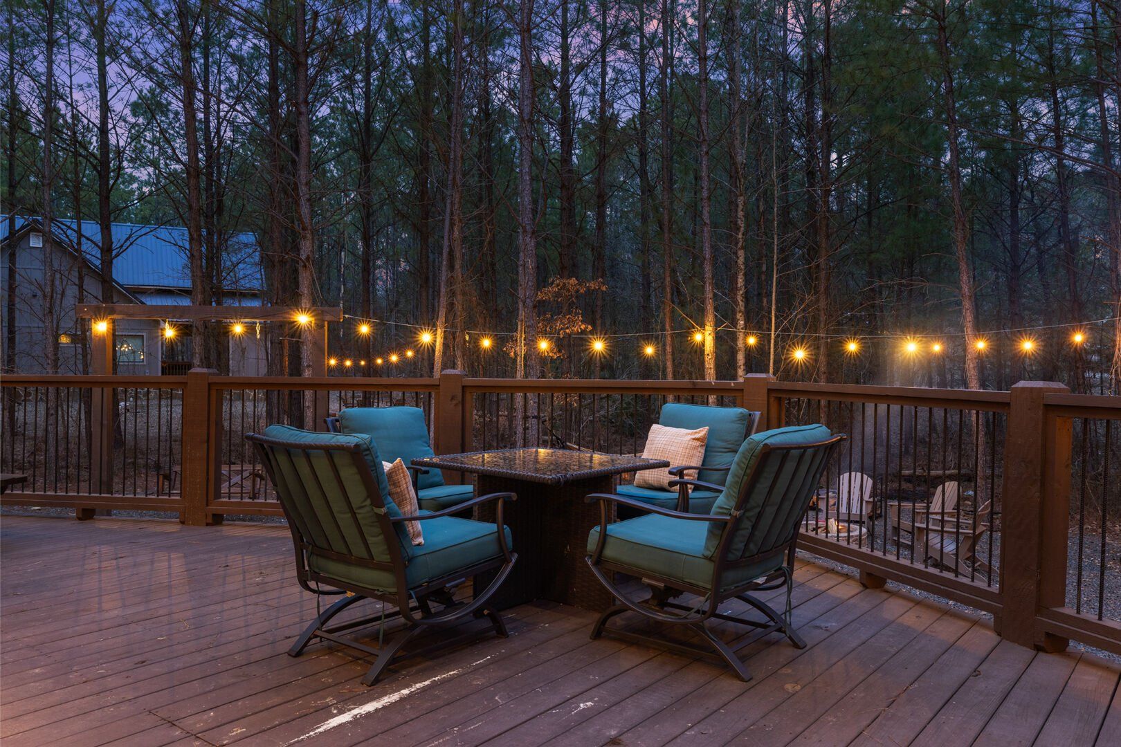 Outdoors, Hochatown Haven impresses with a wide deck overlooking the forest. Guests can grill dinner, enjoy outdoor dining, or unwind in the gazebo-style hot tub. At night, string lights above the fire pit cast a warm glow while stories are shared and marshmallows roast. Whether enjoying a ping pong match, soaking in the spa or simply sitting in silence under the stars, the outdoor space invites everyone to slow down and breathe deeply.
