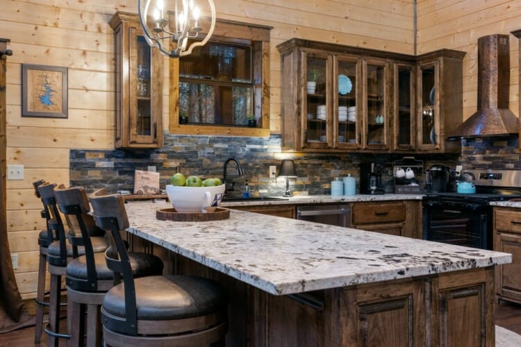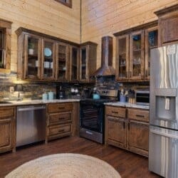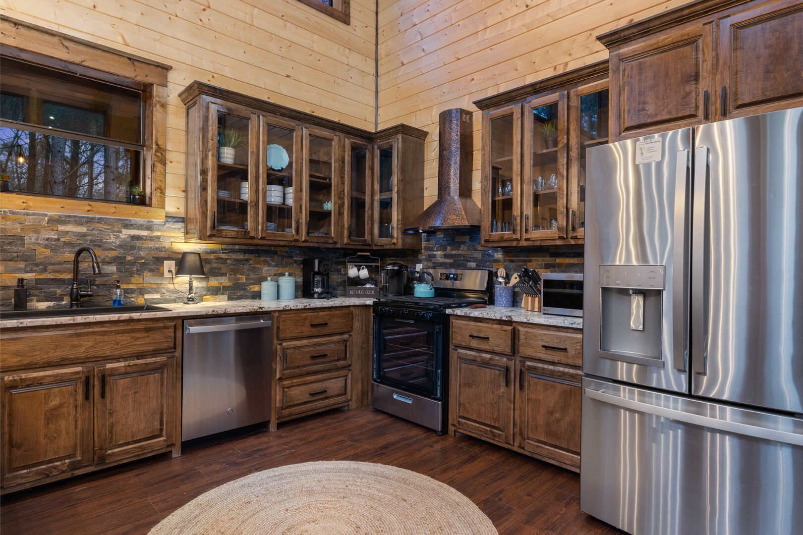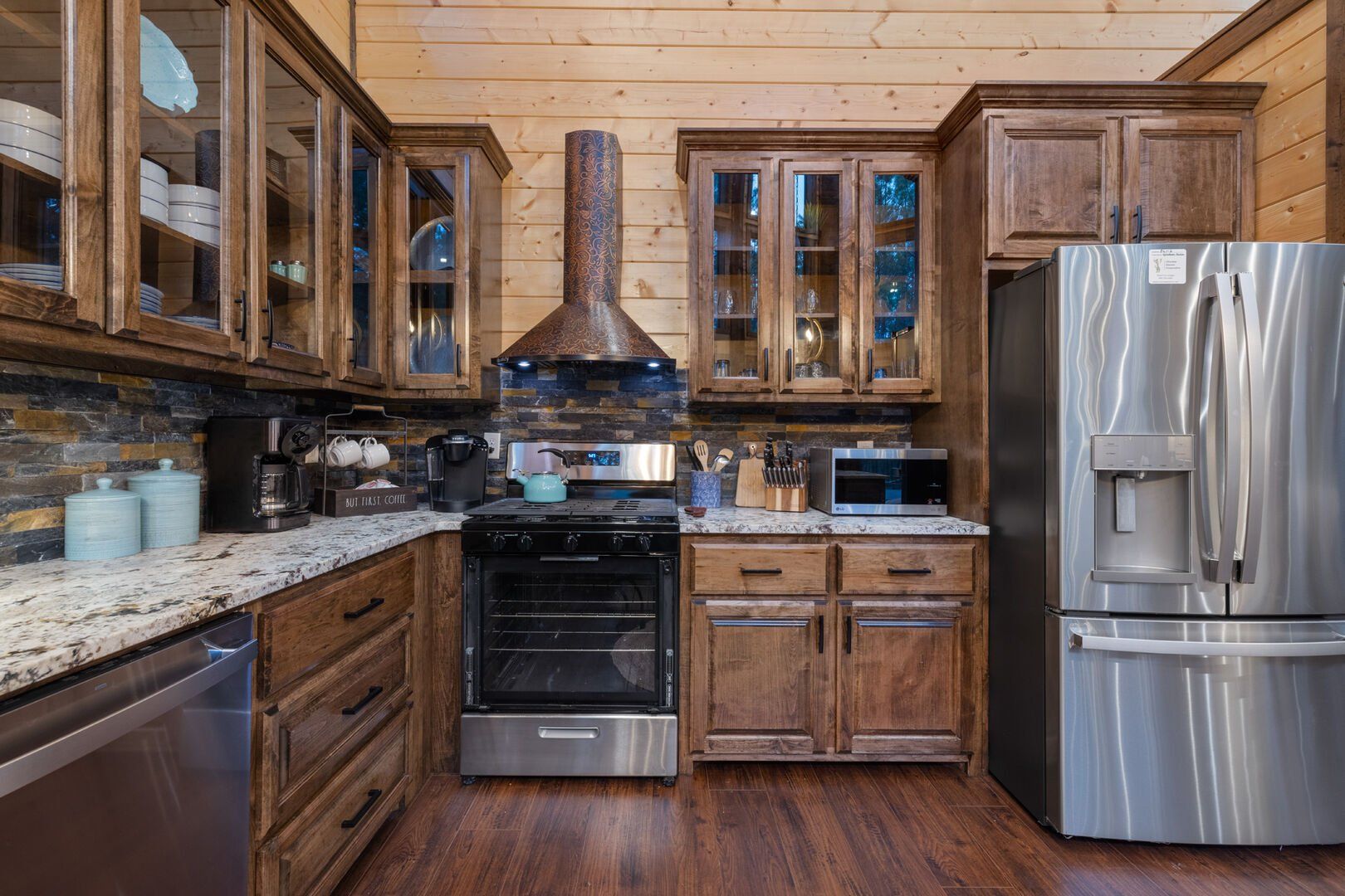 Inside Hochatown Haven, the open-concept design creates a natural flow between the kitchen, dining, and living areas. This layout enables groups to stay connected while still maintaining personal space. The kitchen offers everything needed to prepare meals, from a quick breakfast to a family dinner. Stainless steel appliances, modern cookware, and a dual coffee machine help make mornings simple and satisfying. Natural light fills the space during the day, adding a fresh and cheerful feel that continues throughout the cabin.