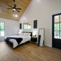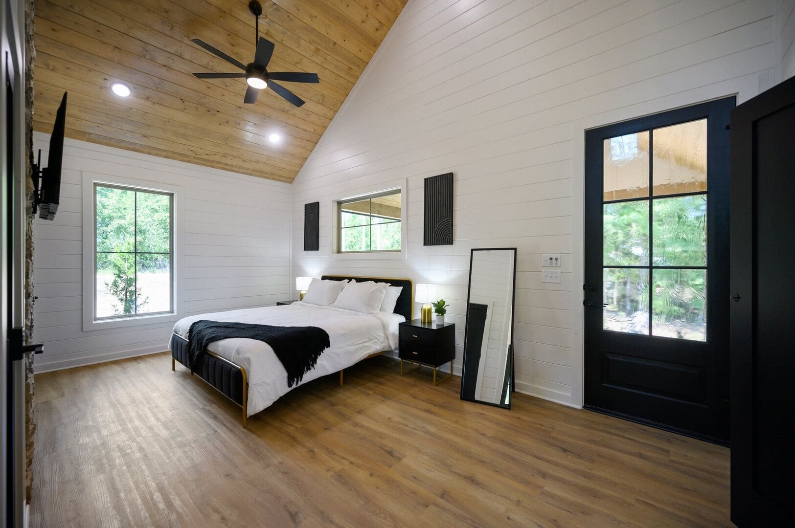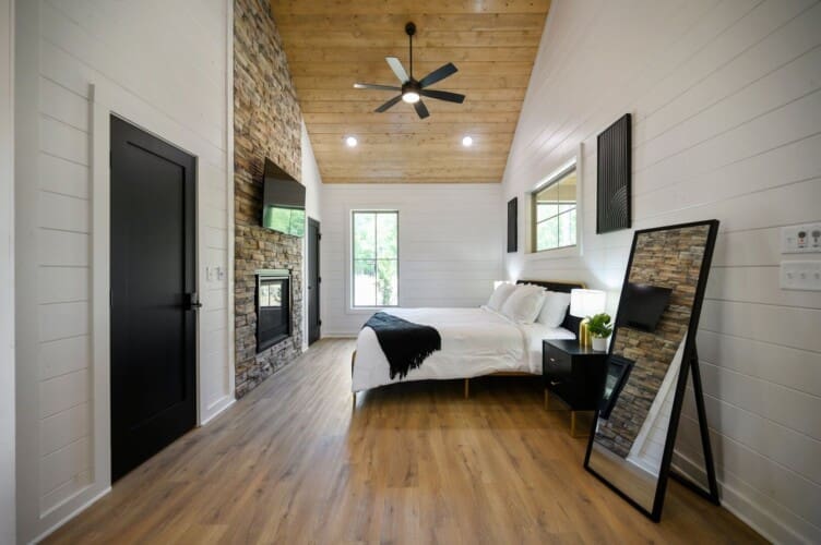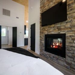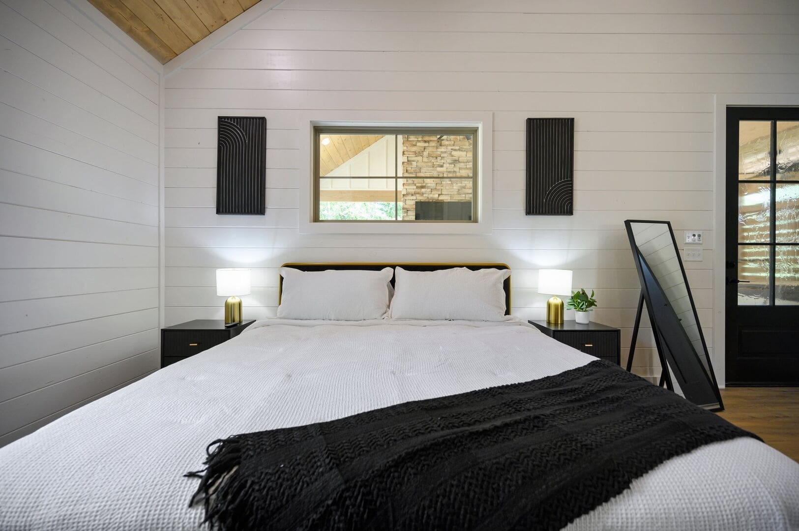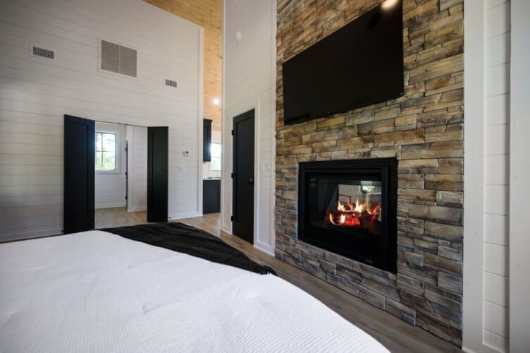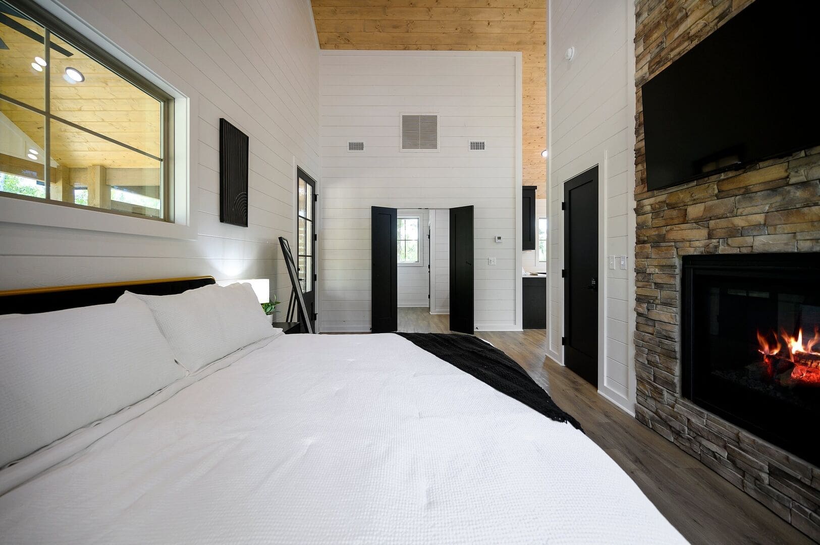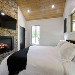 The Bedroom and Bathroom, a serene haven for two, boast a King-size bed, nightstands on both sides, a gas fireplace, a big-screen HDTV, a closet with hangers, a full-length mirror, and inviting throw blankets. Enjoy the convenience of an ensuite bathroom featuring a large walk-in shower, extensive counter space with a single vanity sink, and a private toilet. Direct access to the patio enhances the romantic ambiance.