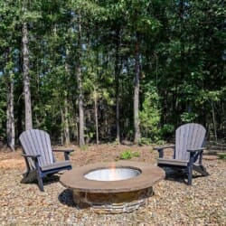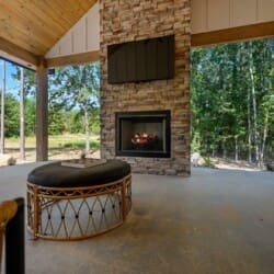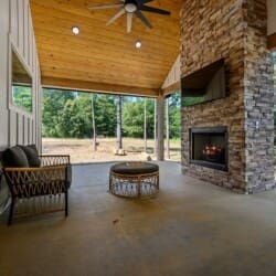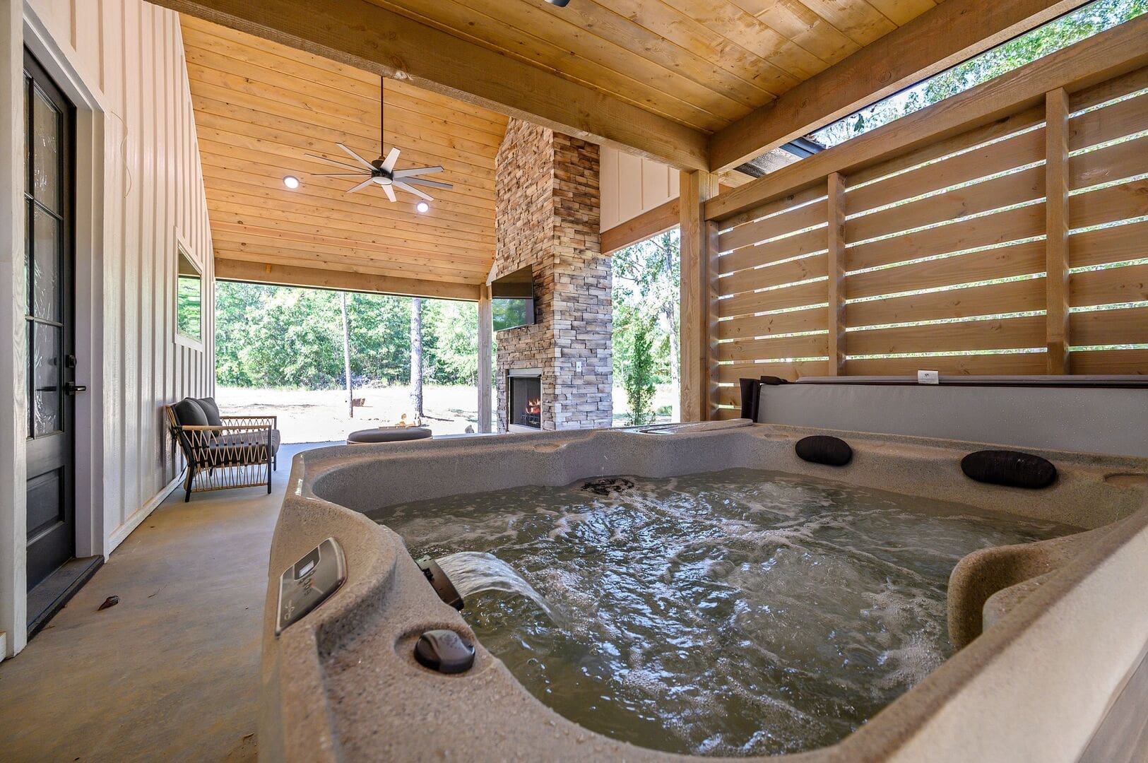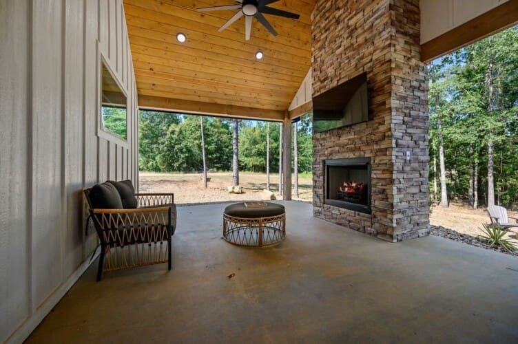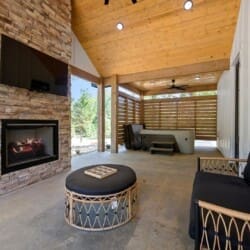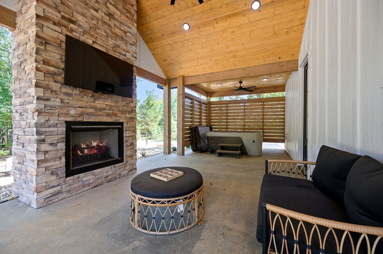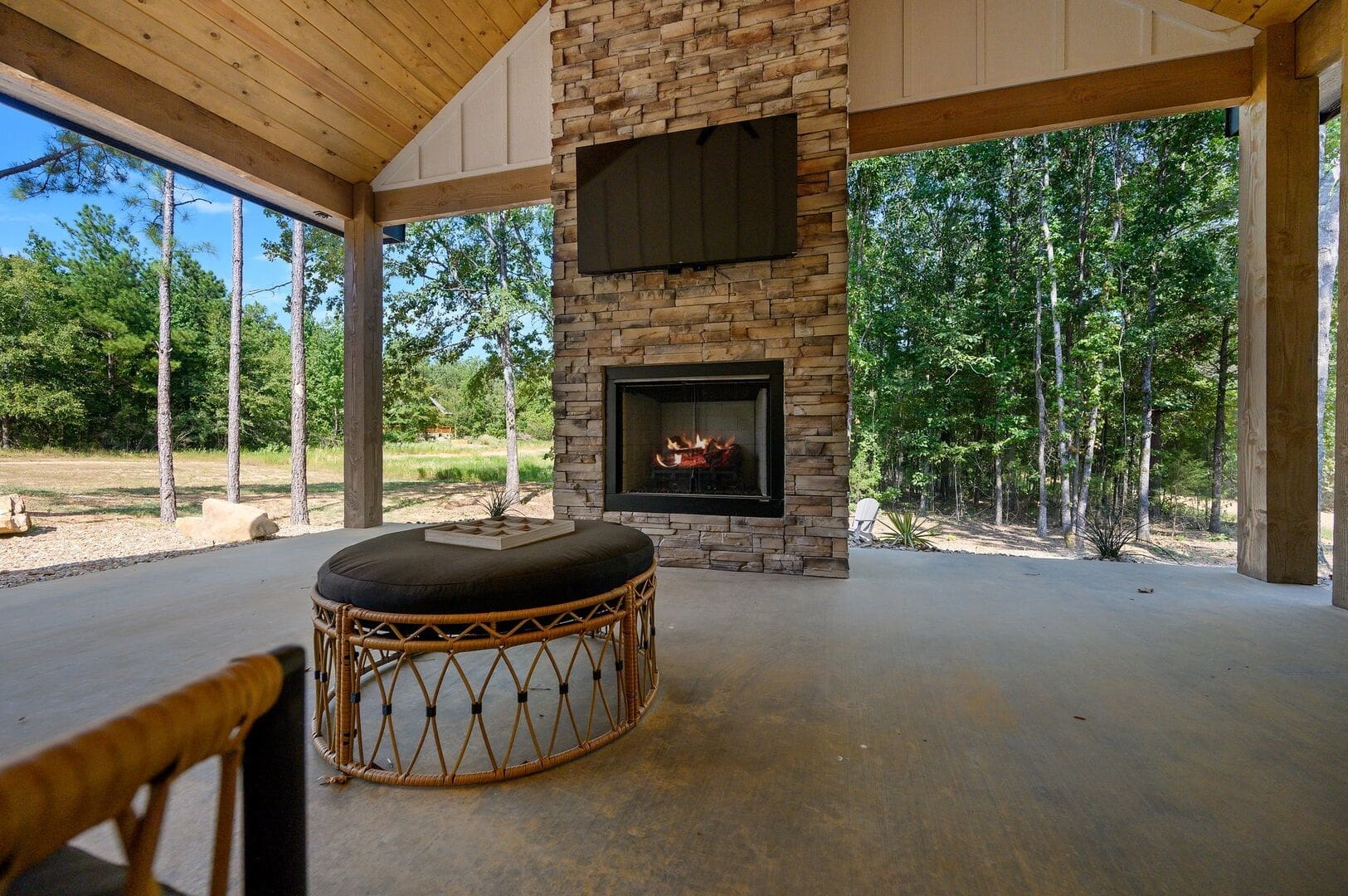 Outdoor Living takes center stage with a private oasis that includes patio furniture for two, a gas fireplace, a big-screen HDTV, a hot tub, and a fire pit with seating for two. Front porch patio furniture completes the scene, offering a perfect spot for shared moments.