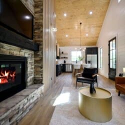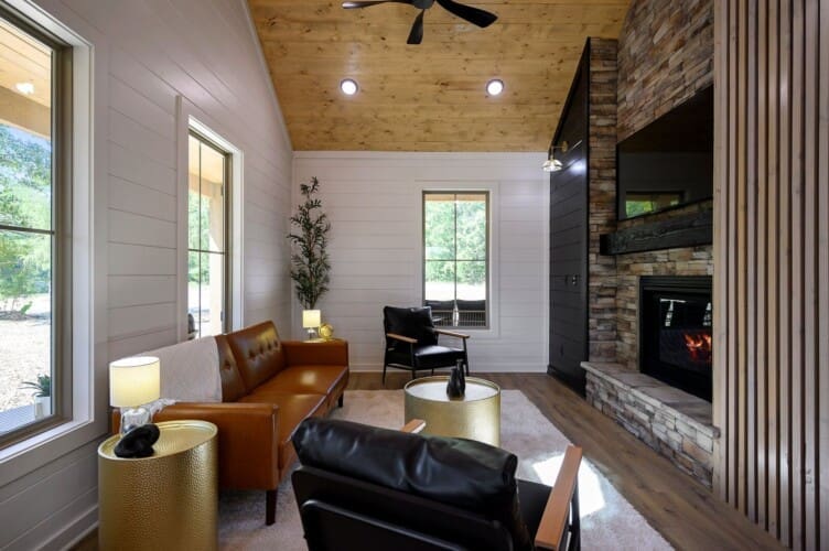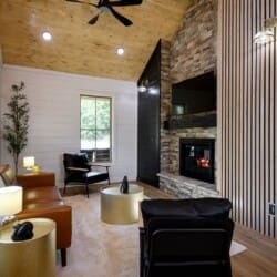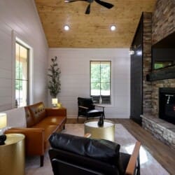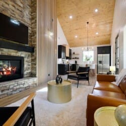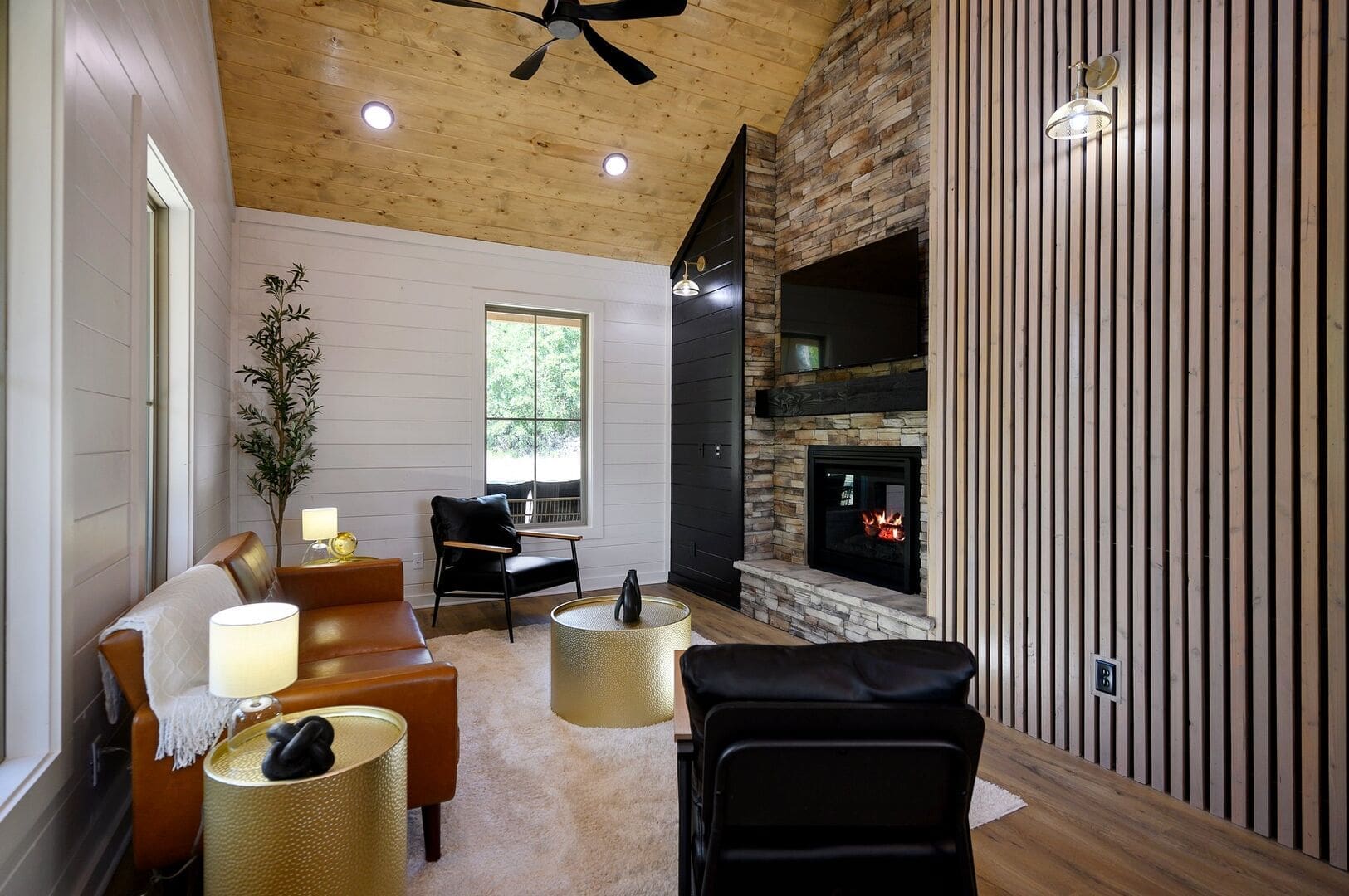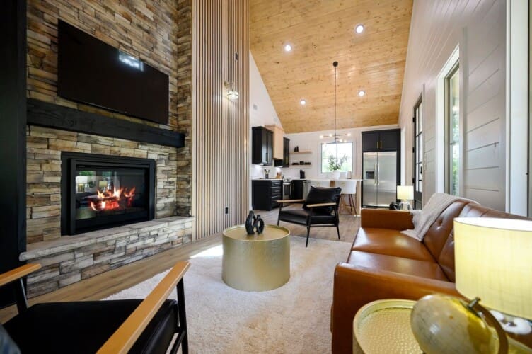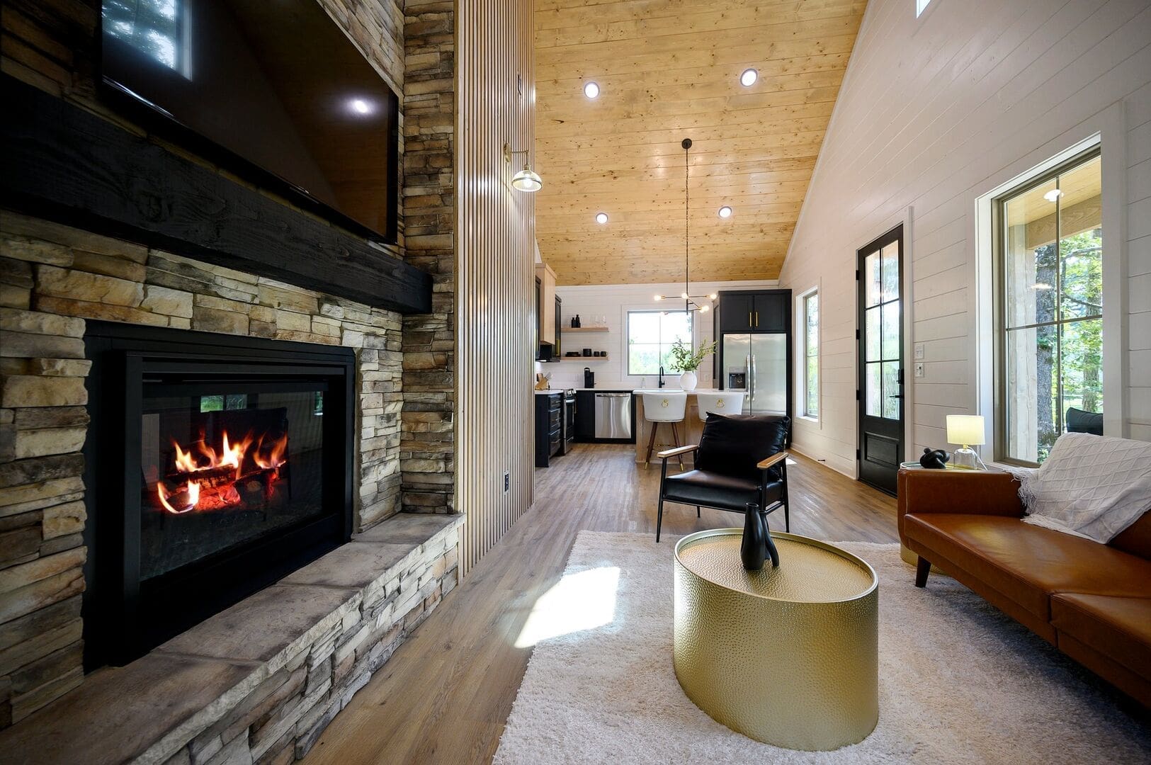 The Living Room, designed for comfort and relaxation, features a leather sleeper sofa, two lounge chairs, a gas fireplace, a big-screen HDTV, and inviting throw blankets, creating the perfect space to unwind and connect.