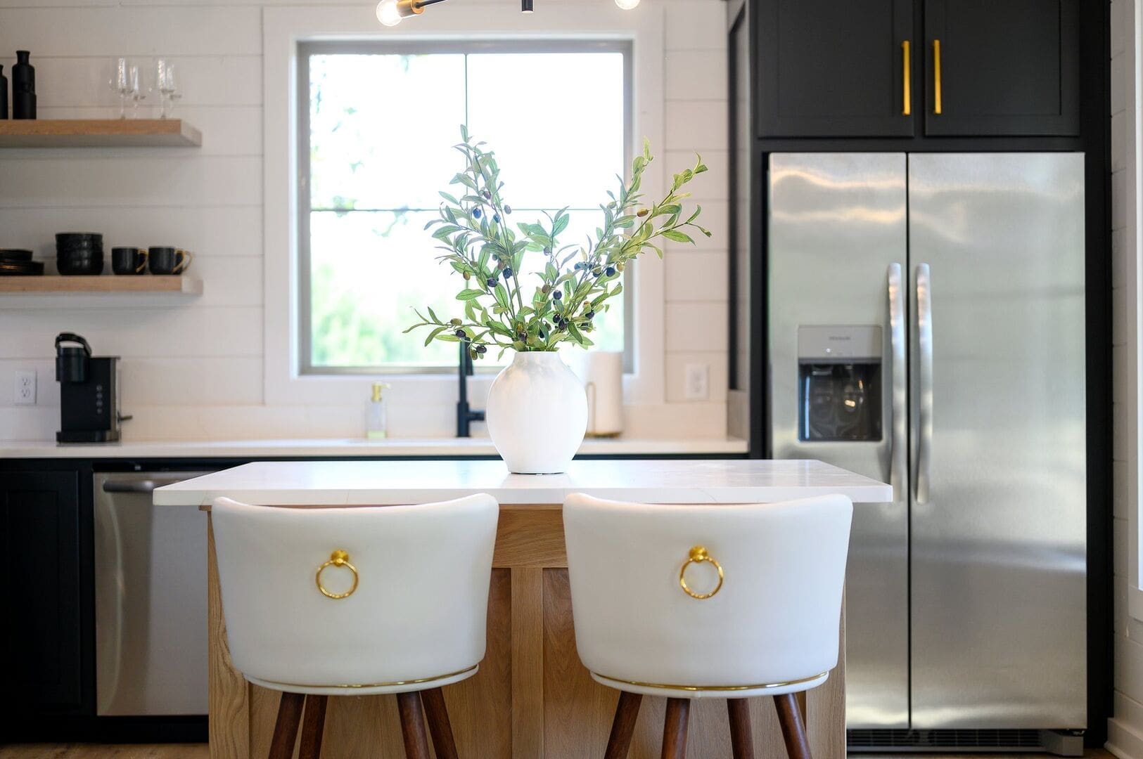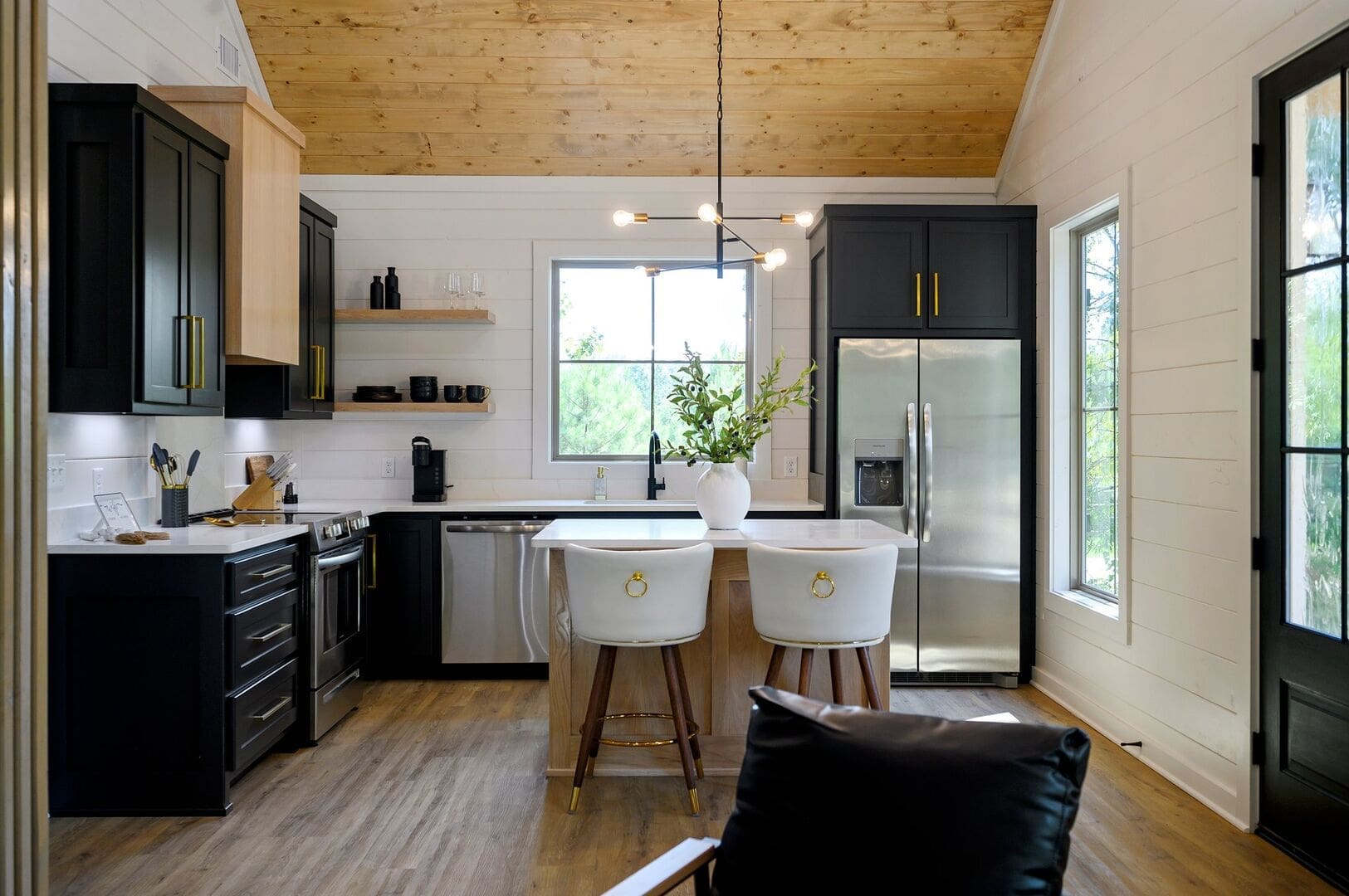 The Kitchen and Dining area beckon culinary adventures with island bar seating for two. The fully stocked kitchen provides all the essentials, including dinnerware, pots, pans, blender, toaster, crockpot, basic spices, and more.