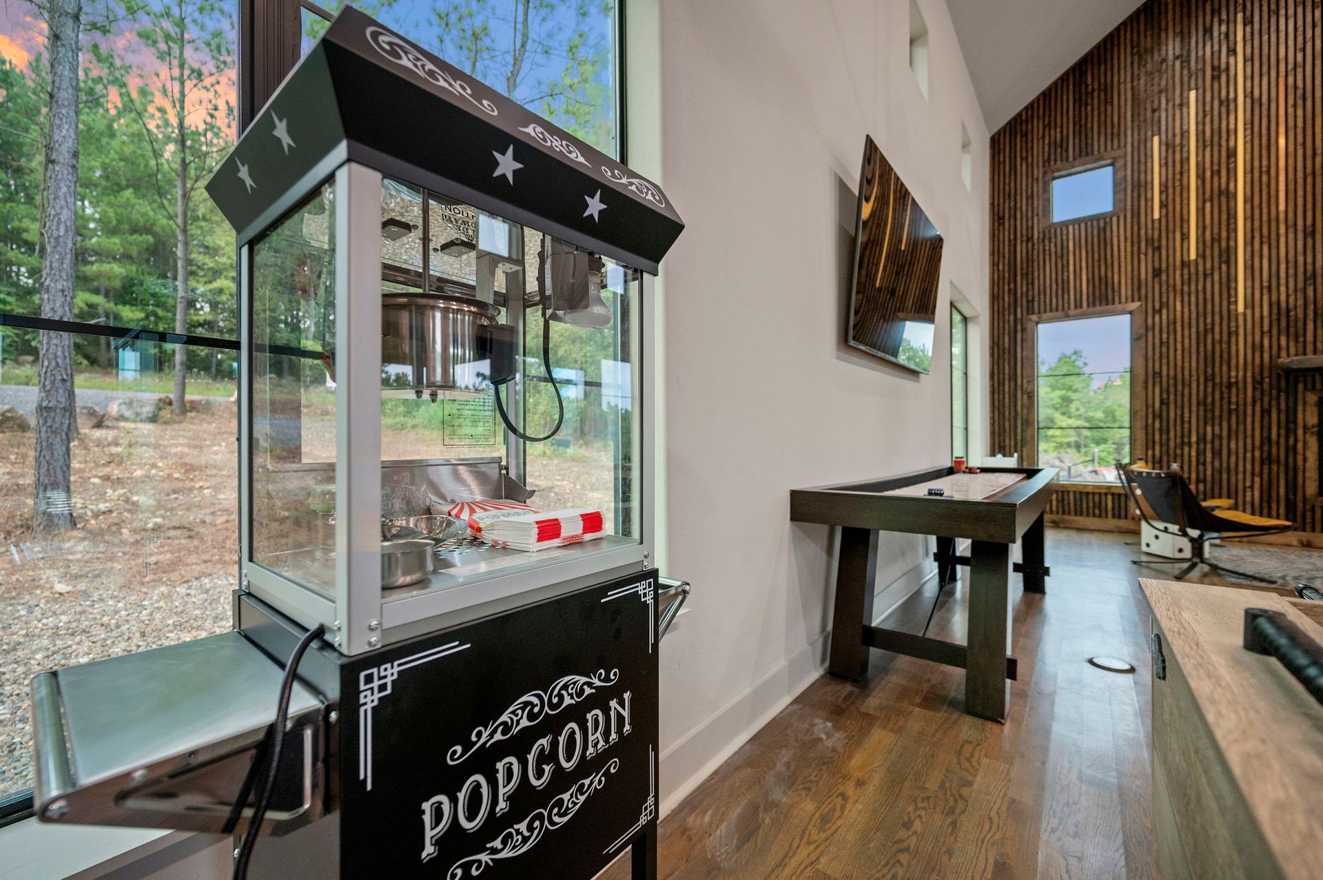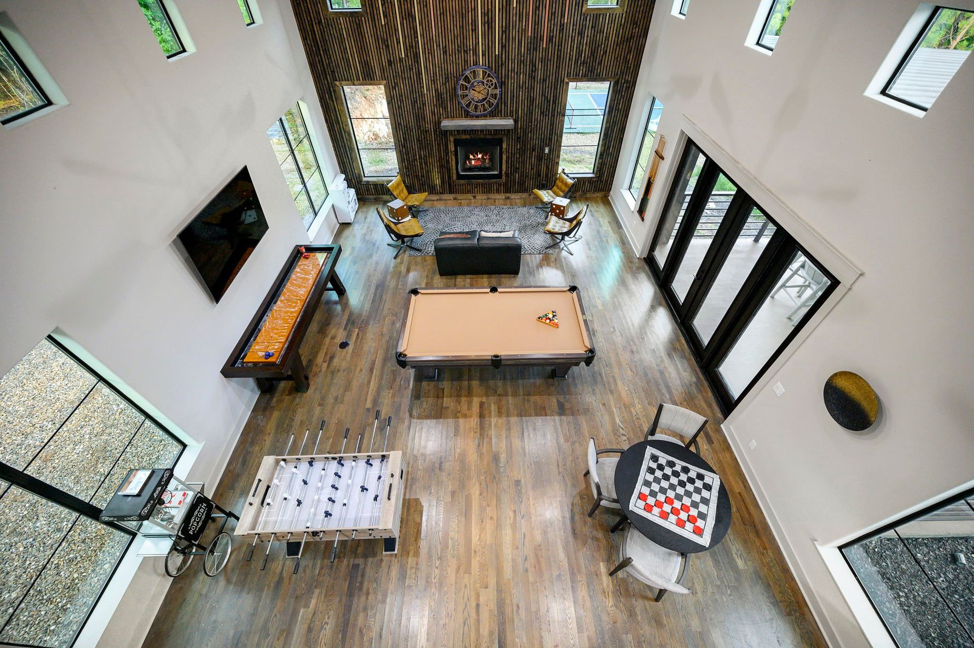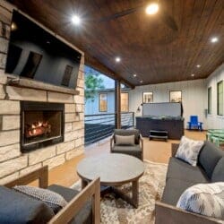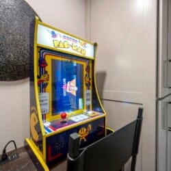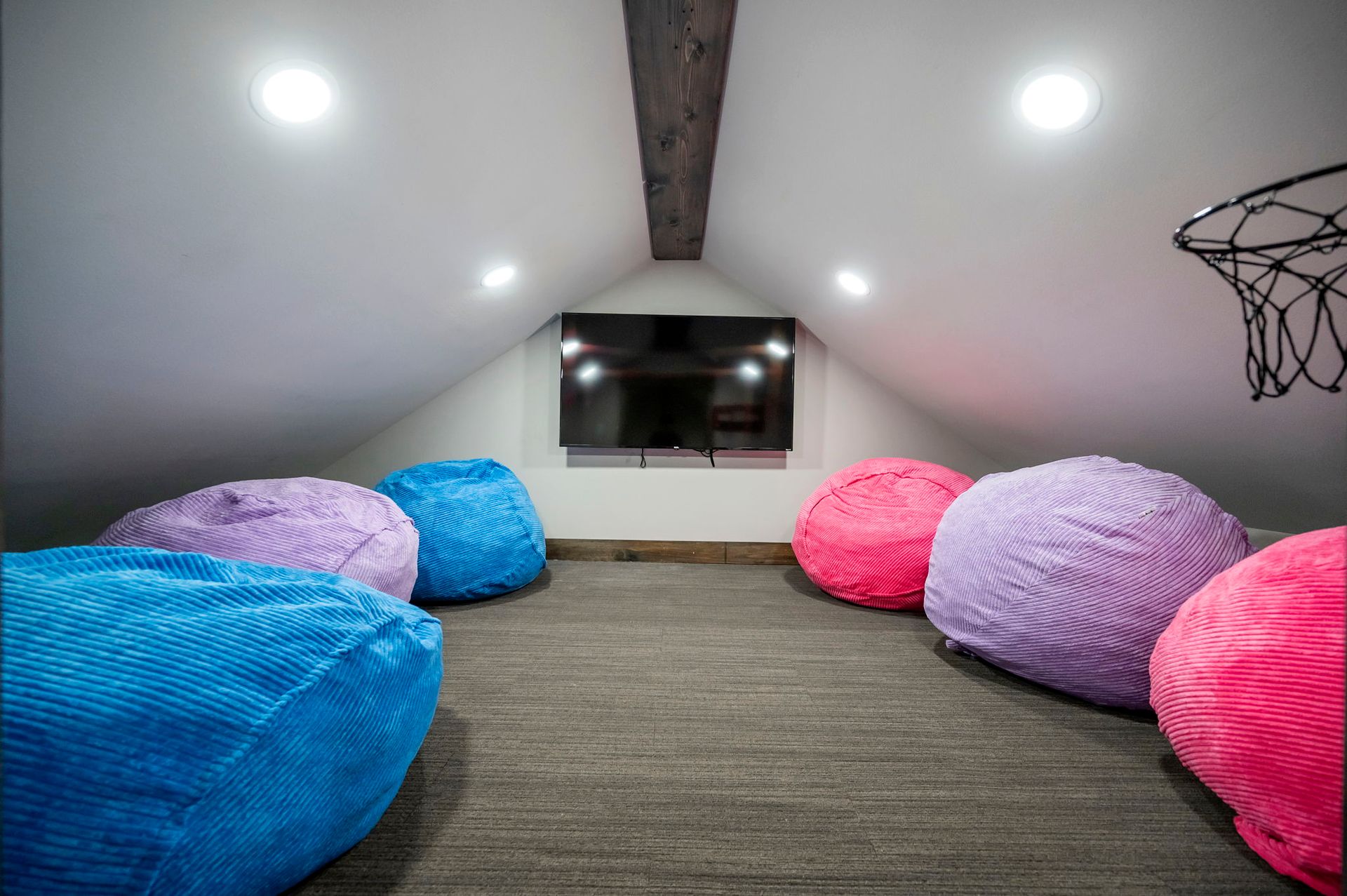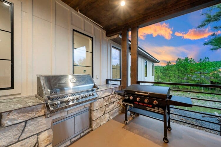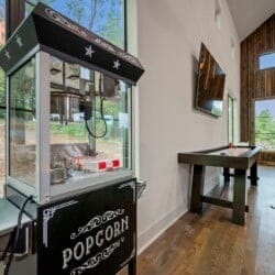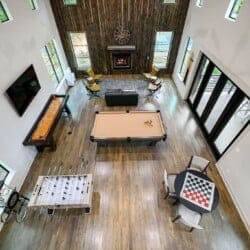 But it’s not just about sleeping and eating here. Iron Bull brings the fun to the forefront. Past the kitchen, the game room is an all-ages playground. There’s air hockey, pool, shuffleboard, an arcade console, and even a popcorn machine to complete the vibe. A second living area, complete with board games, kid-size play furniture, and an oversized TV, makes it easy to spread out without missing the action. When you’re ready to take the party outside, the back patio steps things up with a built-in gas grill, Blackstone, a large dining table, and another TV and fireplace setup for late-night laughs under the stars.