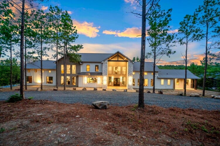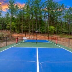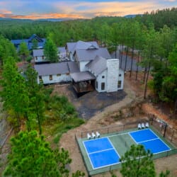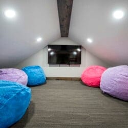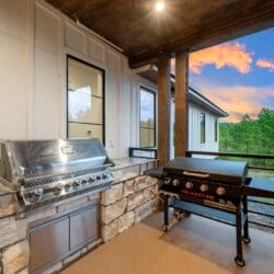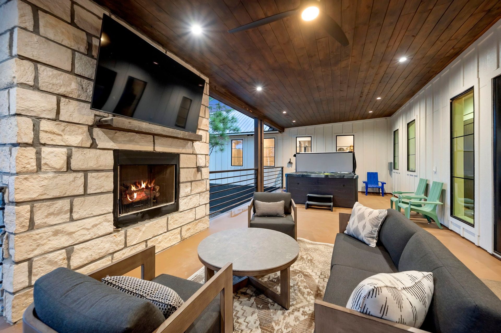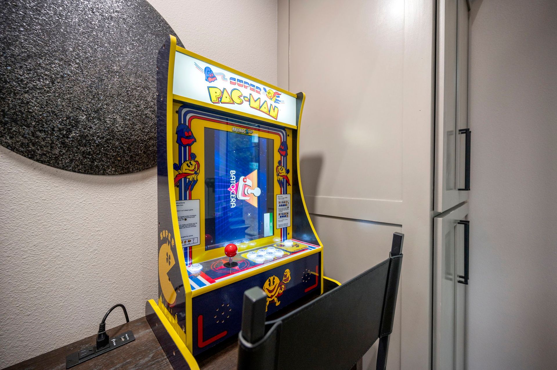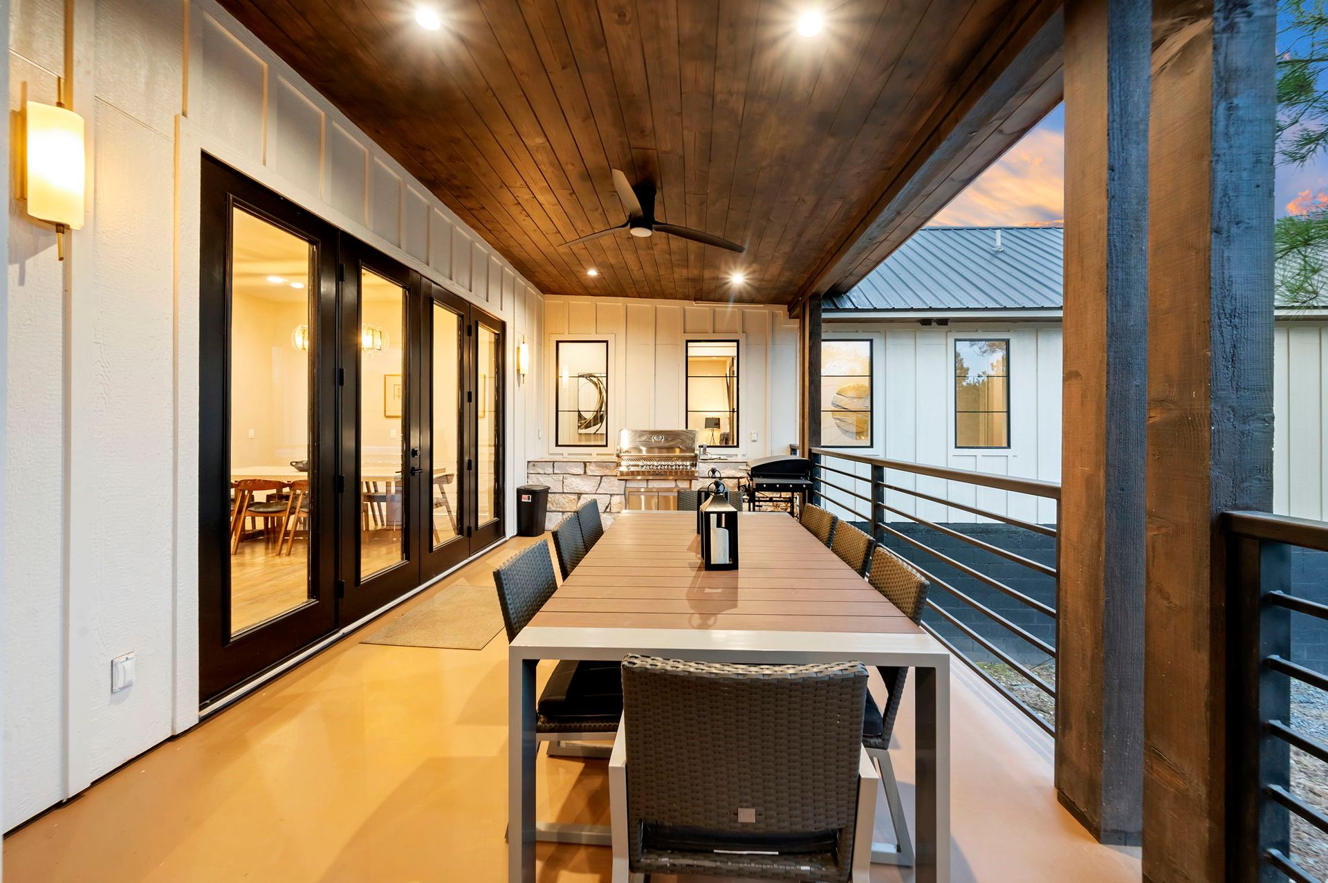 But it’s not just about sleeping and eating here. Iron Bull brings the fun to the forefront. Past the kitchen, the game room is an all-ages playground. There’s air hockey, pool, shuffleboard, an arcade console, and even a popcorn machine to complete the vibe. A second living area, complete with board games, kid-size play furniture, and an oversized TV, makes it easy to spread out without missing the action. When you’re ready to take the party outside, the back patio steps things up with a built-in gas grill, Blackstone, a large dining table, and another TV and fireplace setup for late-night laughs under the stars.