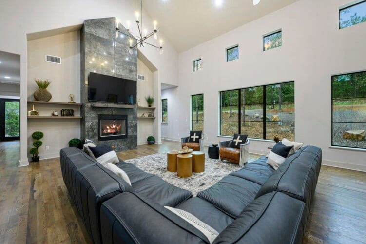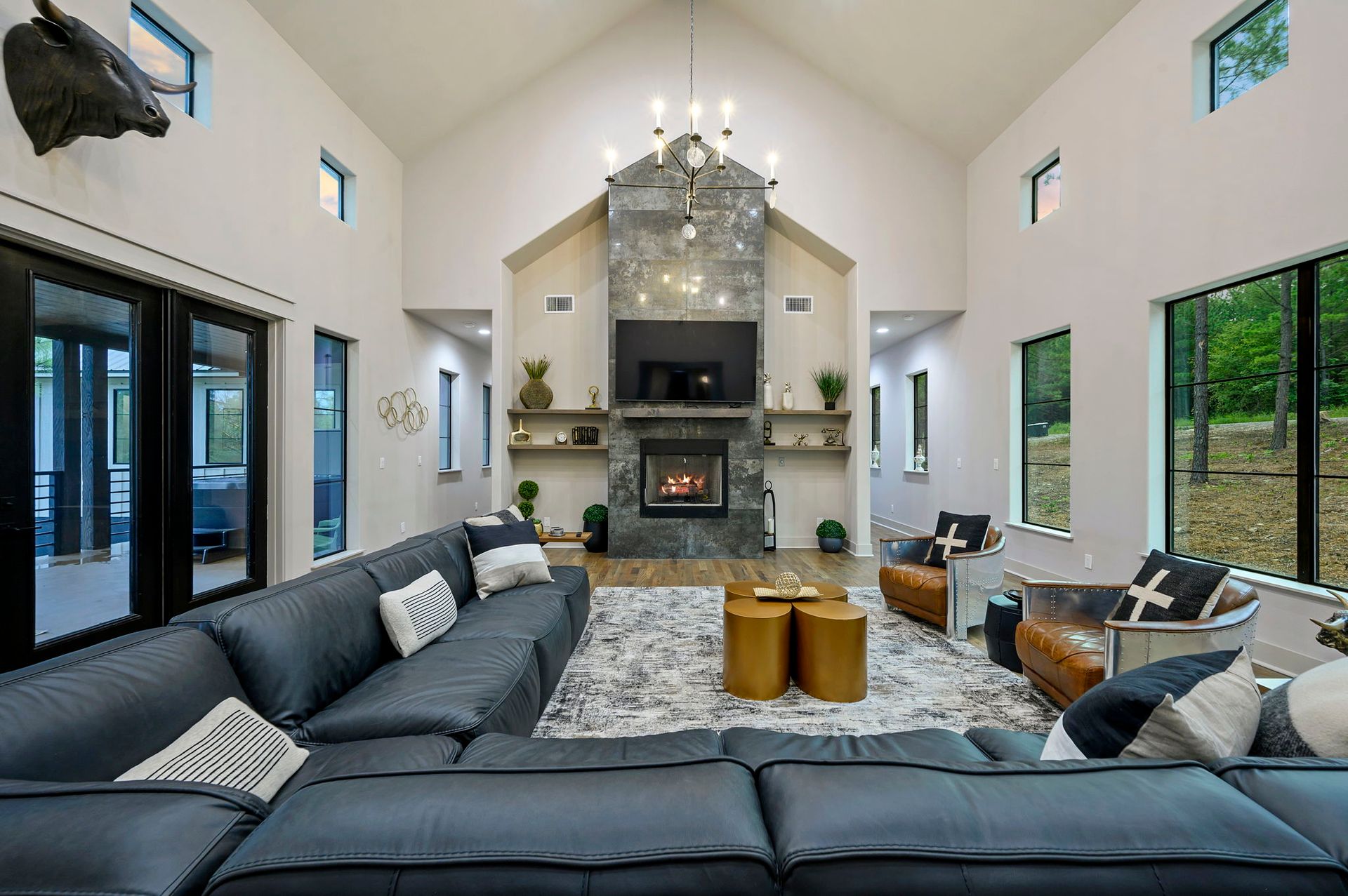 Turn toward the living room, and the mood instantly shifts to one of coziness. A massive leather sectional stretches out in front of a gas fireplace and a large-screen TV, creating the perfect area to unwind after a full day. The room has an effortless warmth that makes you want to kick off your shoes and stay a while. It’s equally suited for lazy afternoons and lively evenings with your group.
