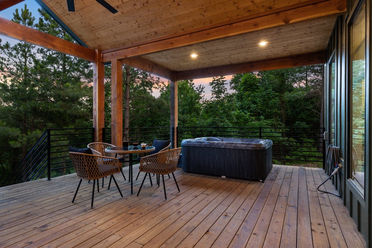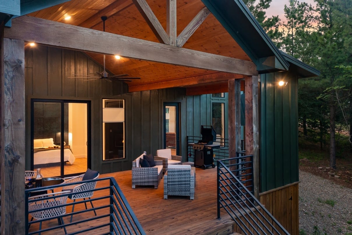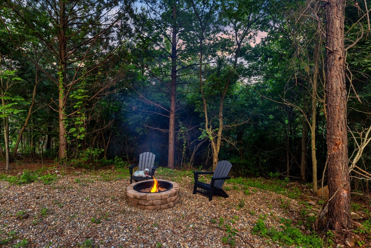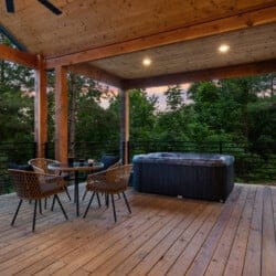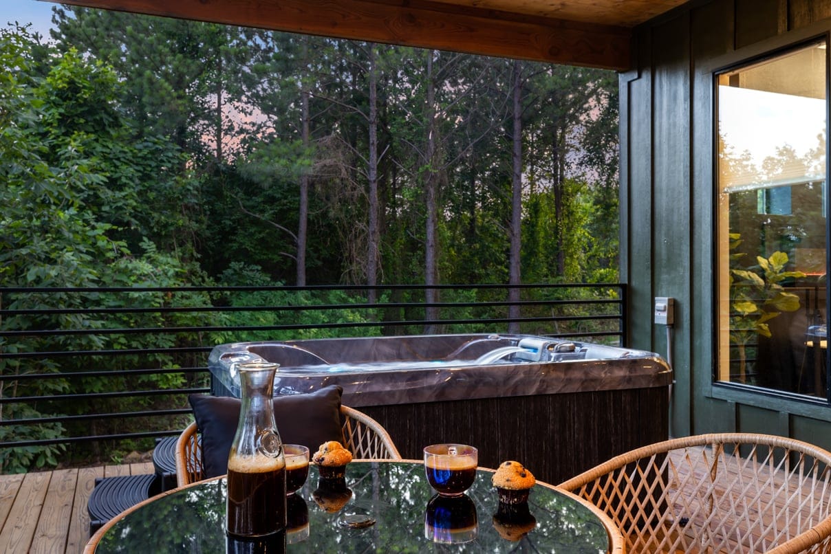 Jade makes outdoor time feel just as special as being inside. The large deck offers a breathtaking view of pine trees and the surrounding natural landscape. There’s a grill for preparing tasty meals outside and plenty of seating where you can dine or relax. The covered hot tub, surrounded by string lights, feels magical at night. Jade also has a fire pit below the deck, where you can sit, toast marshmallows, and share stories. It’s these little moments that guests love most about Jade.