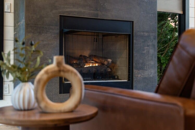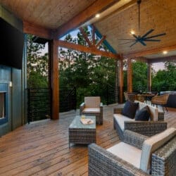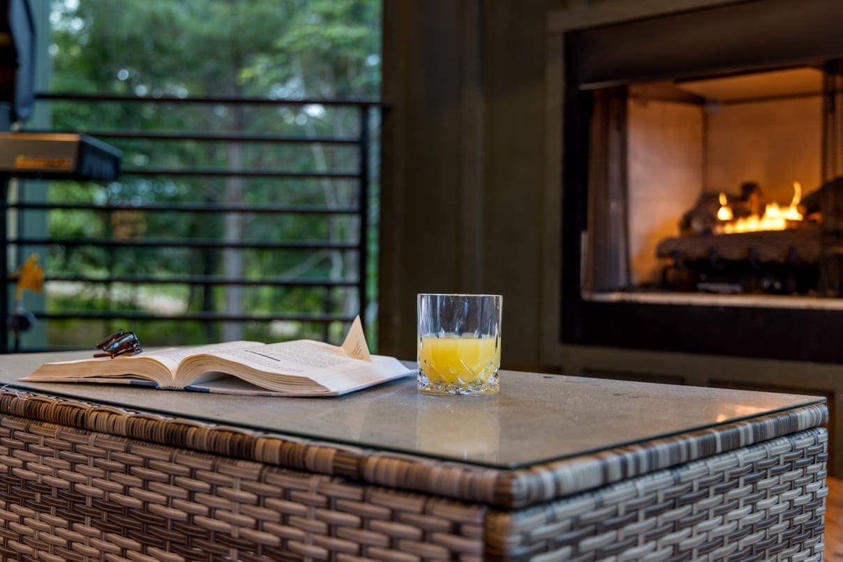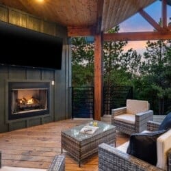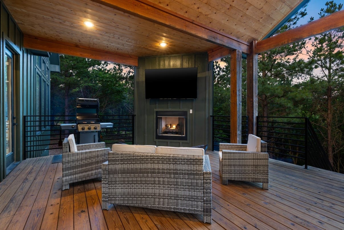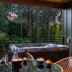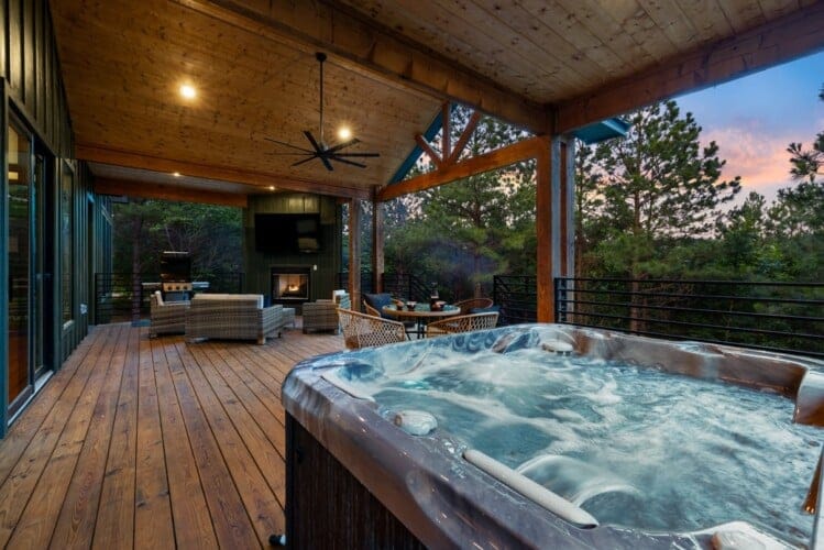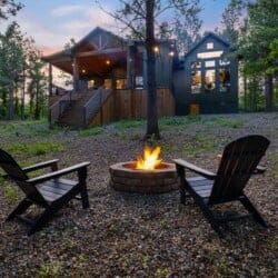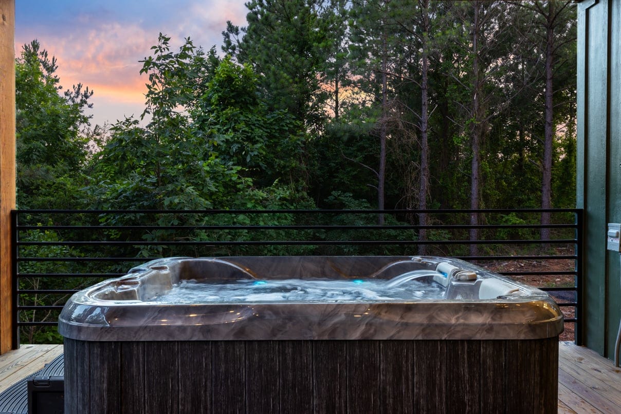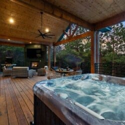 Jade makes outdoor time feel just as special as being inside. The large deck offers a breathtaking view of pine trees and the surrounding natural landscape. There’s a grill for preparing tasty meals outside and plenty of seating where you can dine or relax. The covered hot tub, surrounded by string lights, feels magical at night. Jade also has a fire pit below the deck, where you can sit, toast marshmallows, and share stories. It’s these little moments that guests love most about Jade.