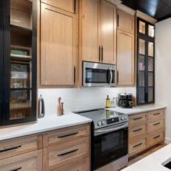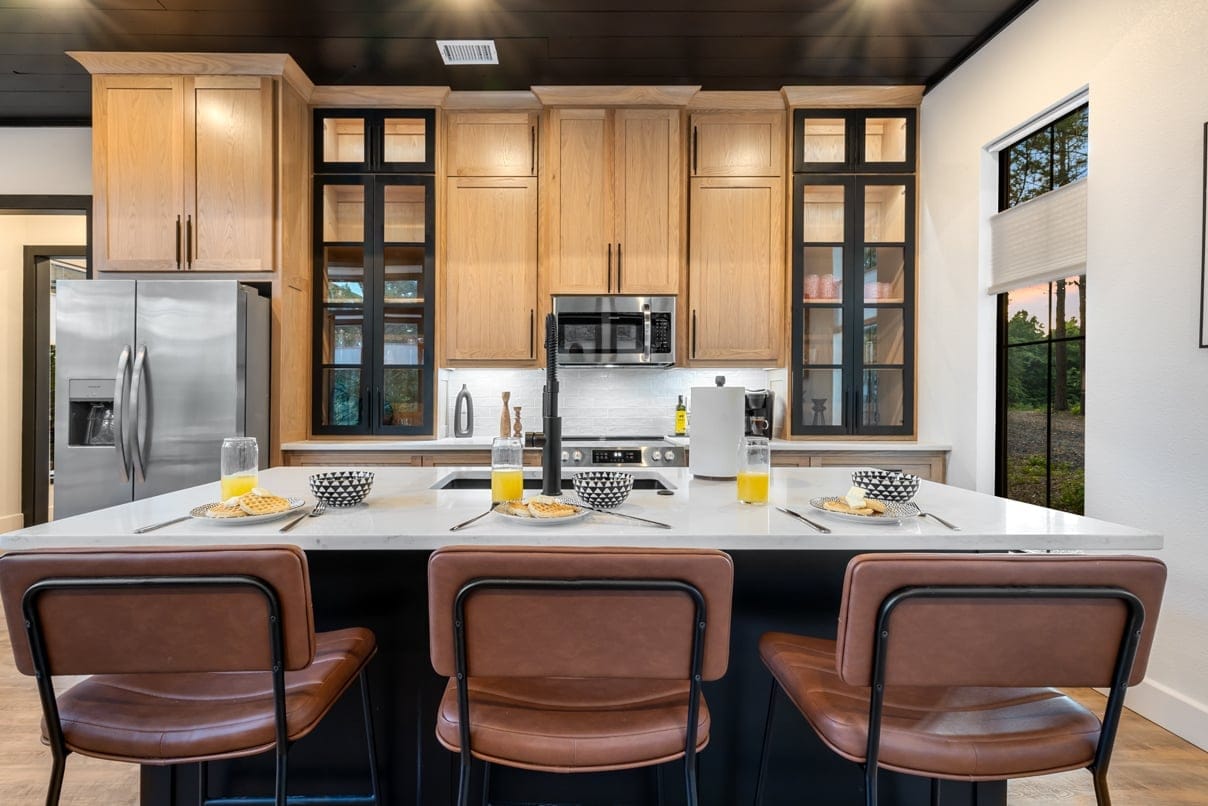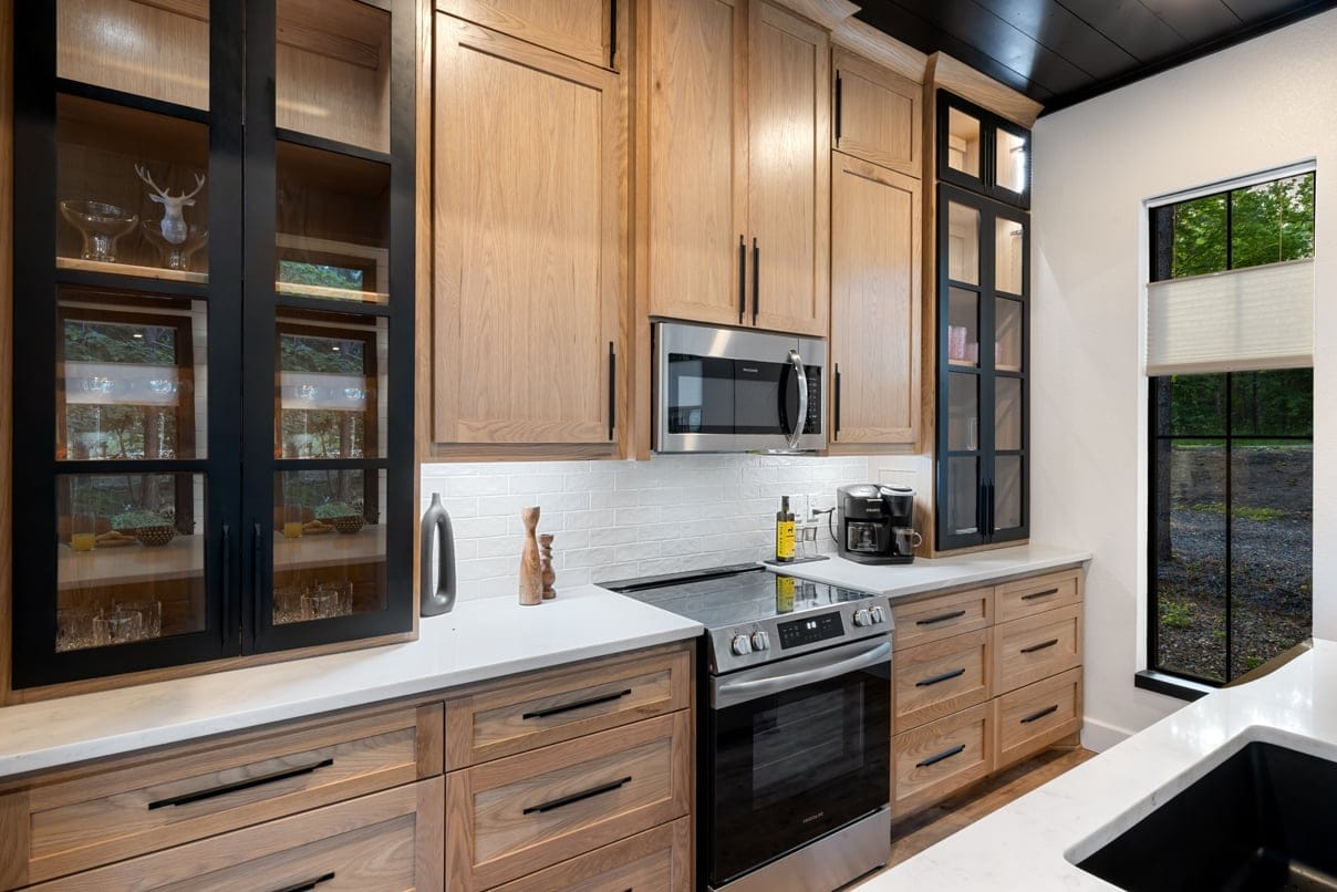 The kitchen in this Broken Bow cabin is ideal for those who enjoy cooking their meals while on vacation. Jade features a full kitchen with everything you might need, including a large fridge, stove, dishwasher, and even a Keurig coffee maker for both pods and ground coffee. The wooden cabinets and natural light create a warm and welcoming atmosphere. You can cook a full dinner or warm up something simple, then enjoy it indoors or out on the deck. Either way, Jade offers options to suit your mood.