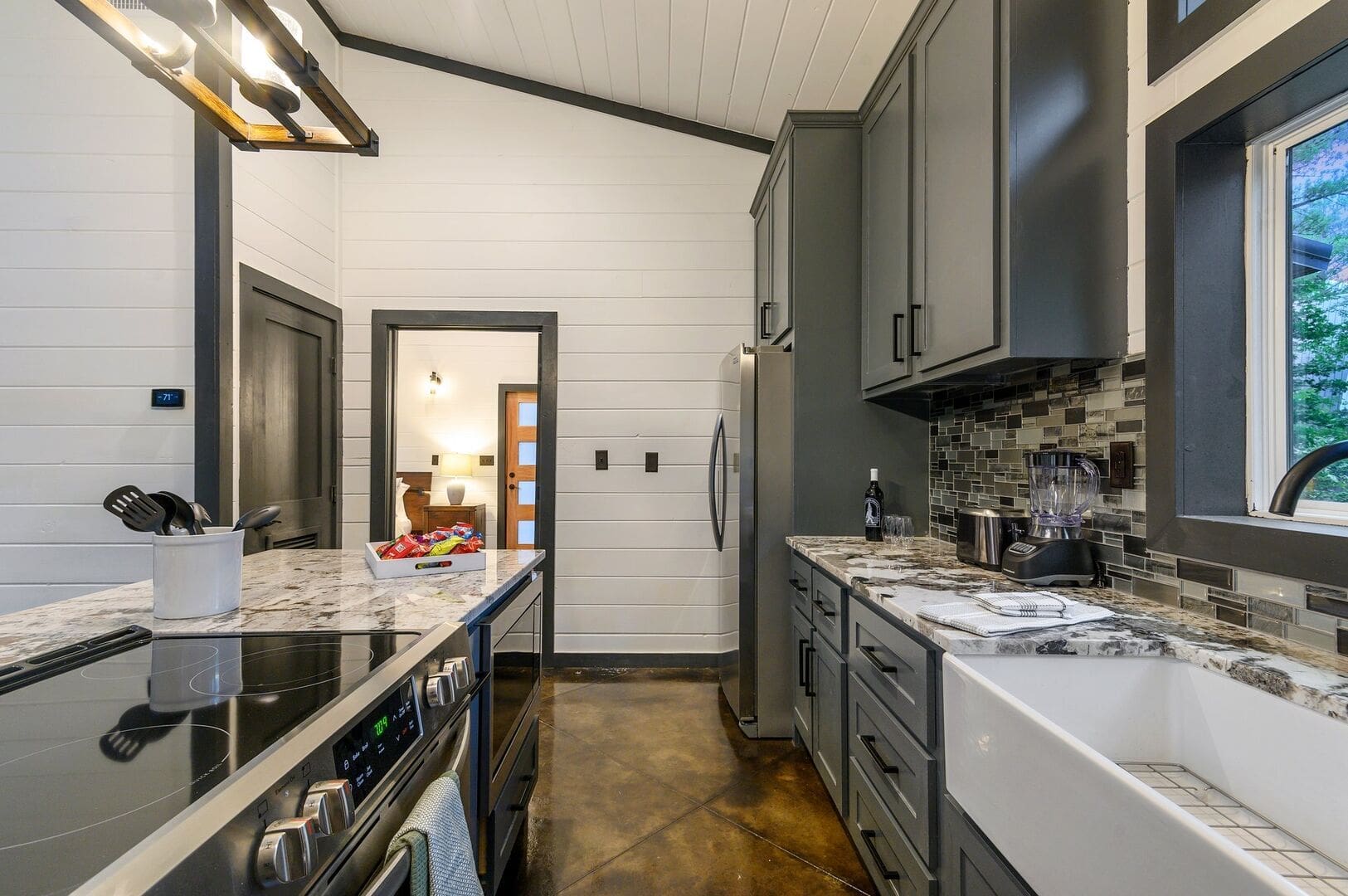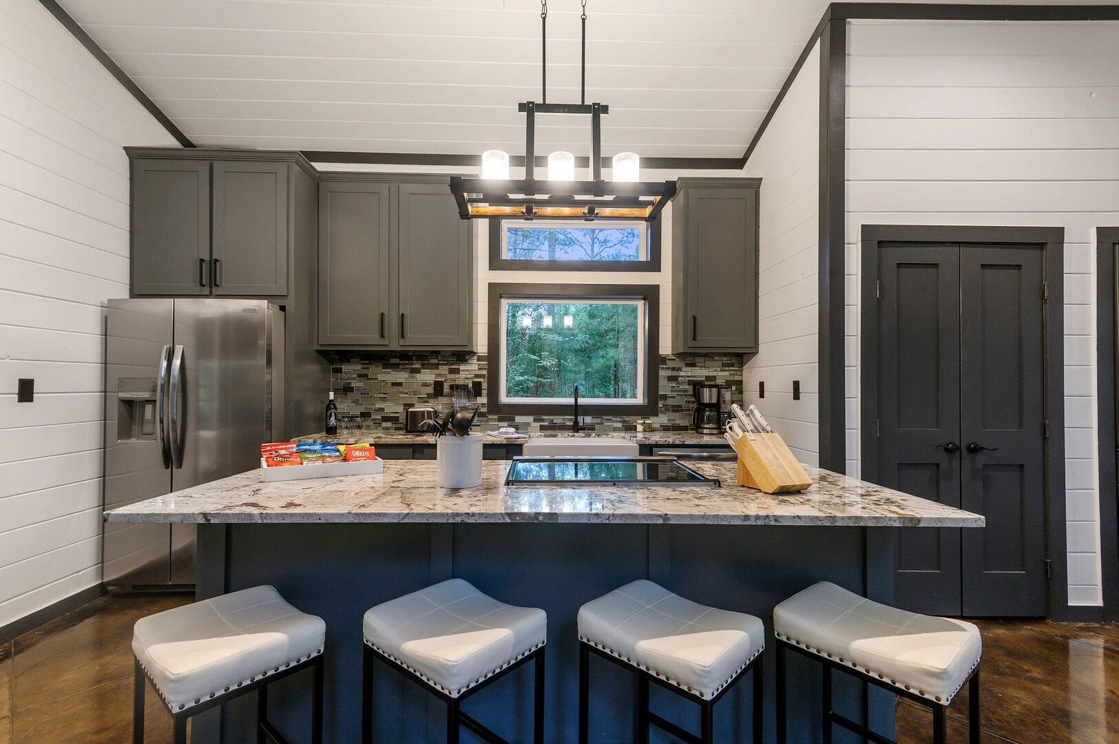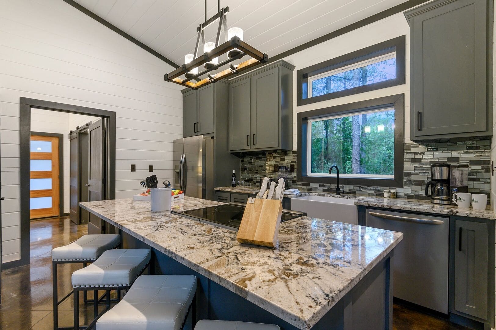The Kitchen and Dining area is a haven for culinary enthusiasts, fully stocked with everything you might need for your stay. From a toaster and blender to a Ninja coffee maker (complete with a starter pack of coffee), the kitchen ensures a seamless experience. Four bar stools on the island provide a charming spot for intimate meals.