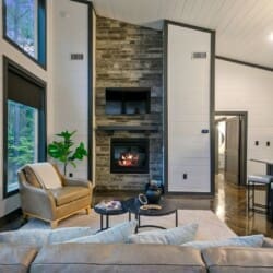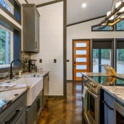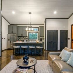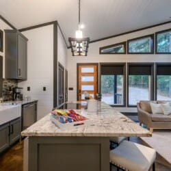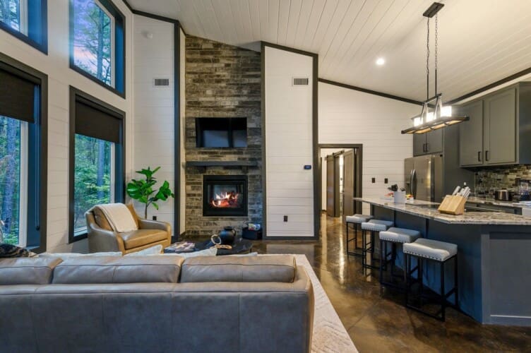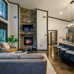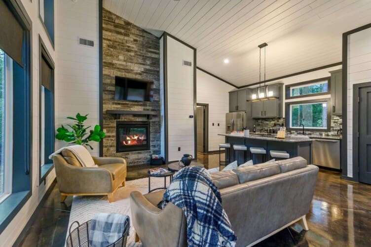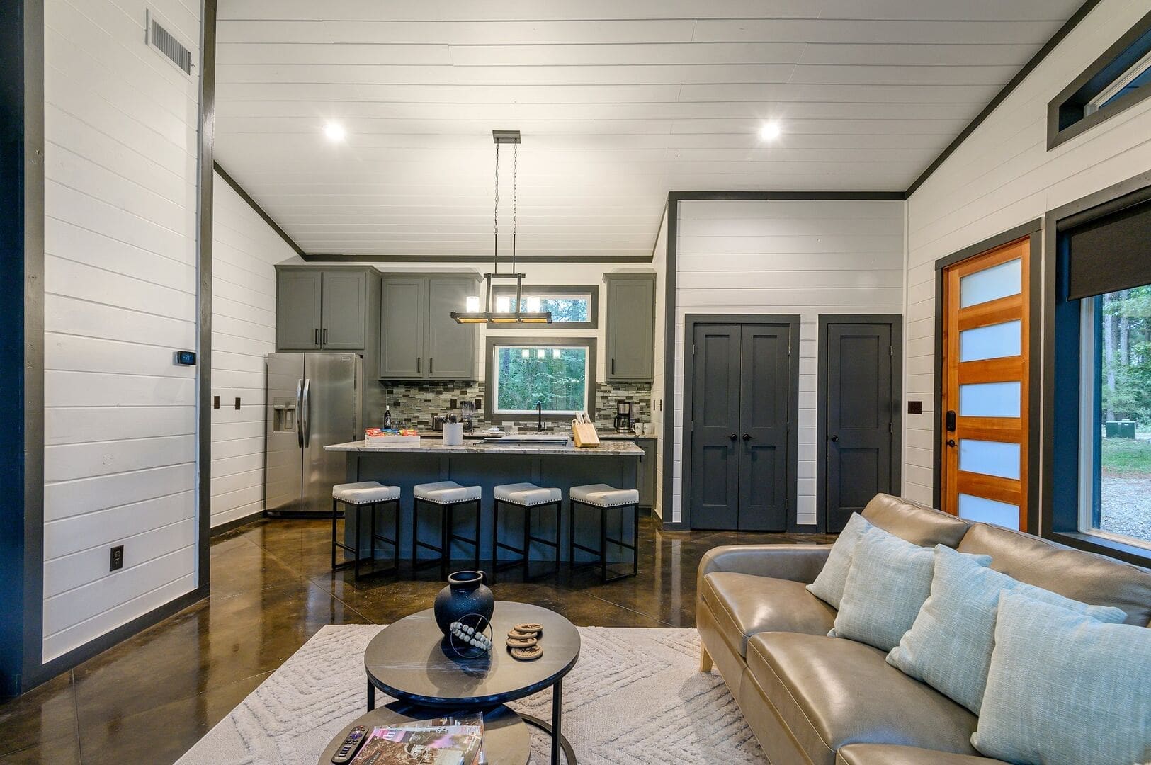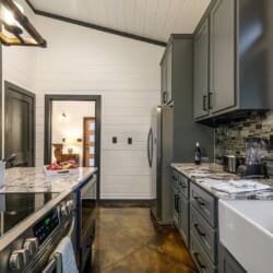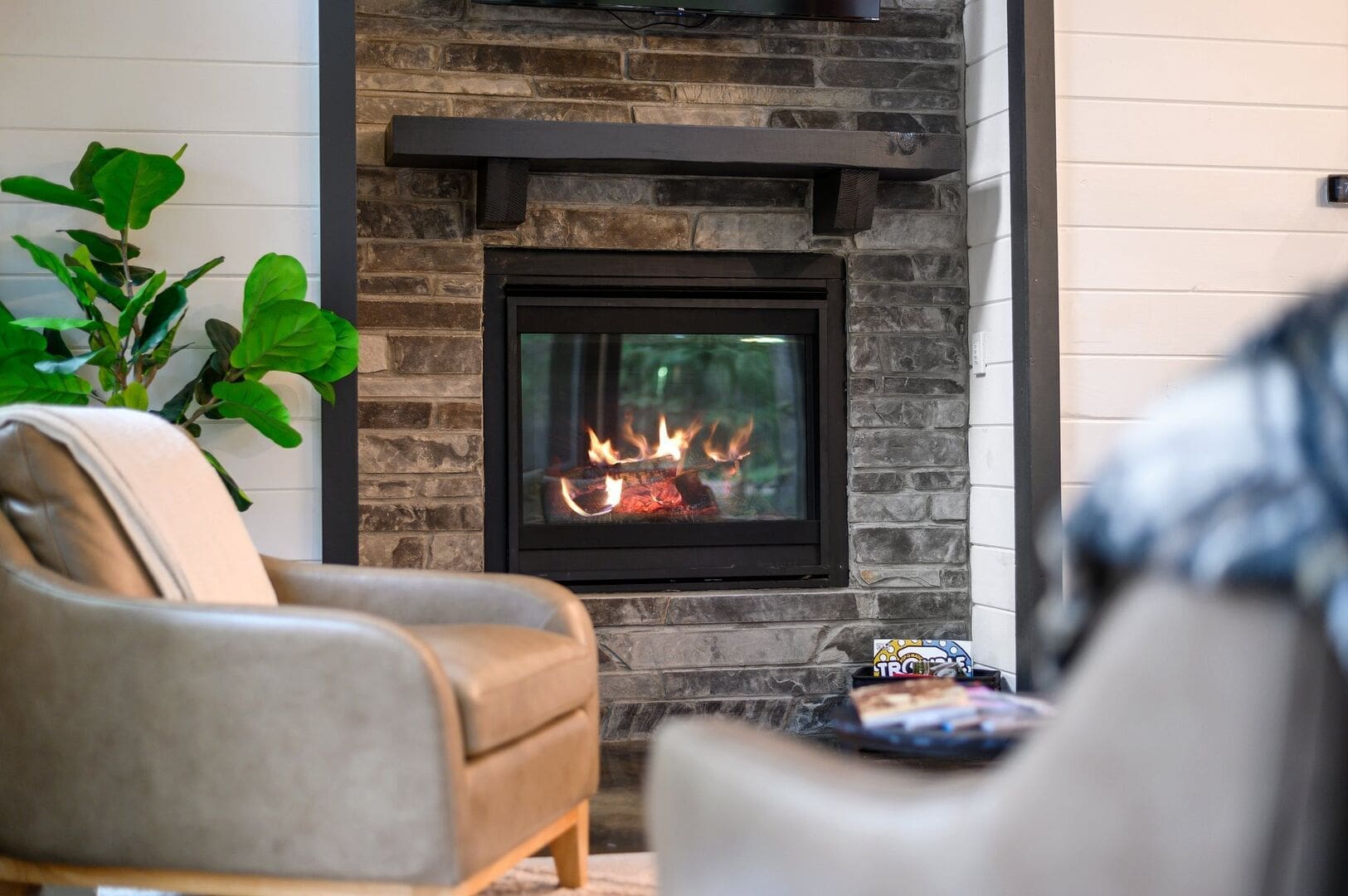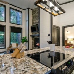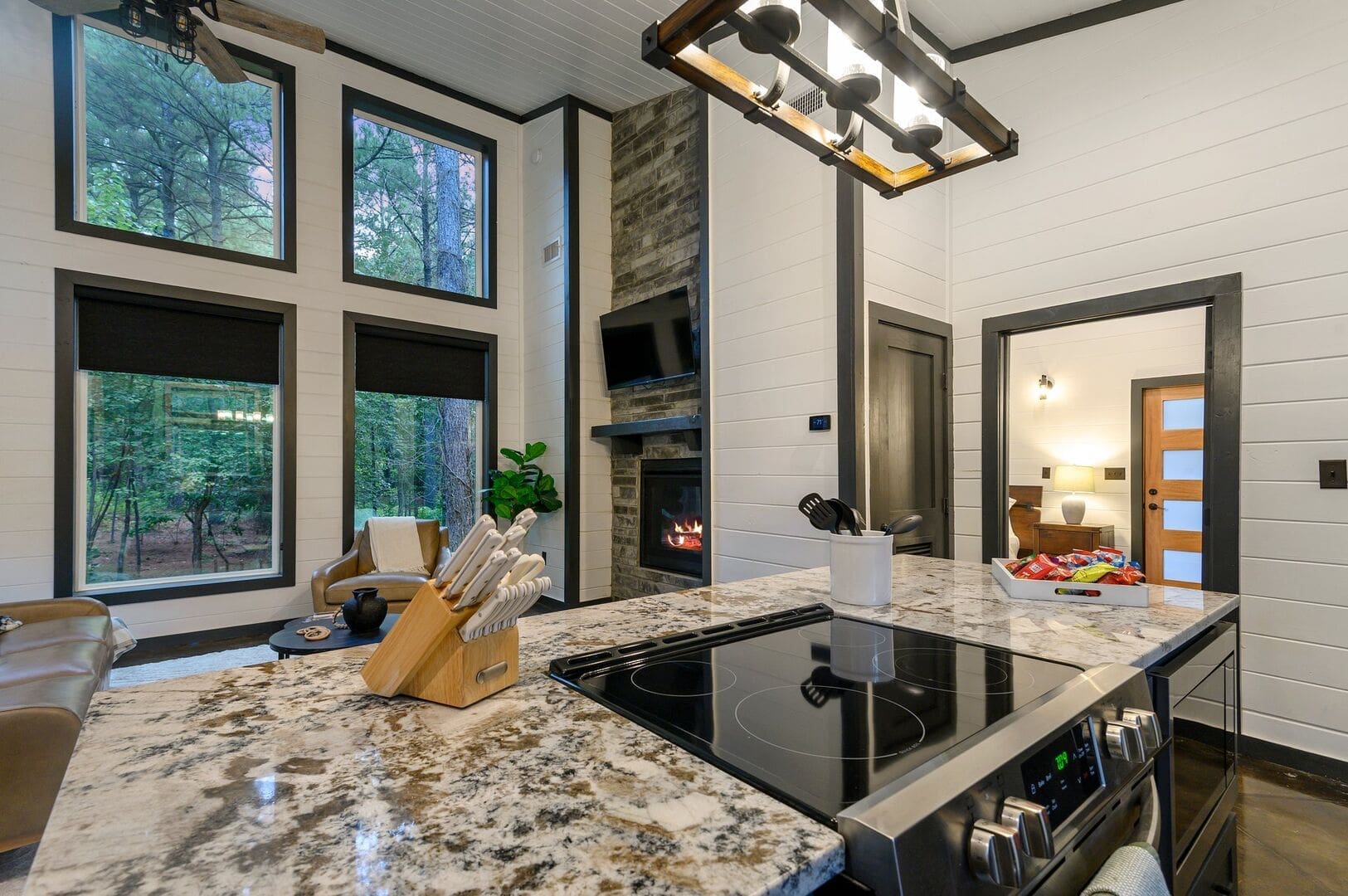 The Living Room invites you to unwind in style as you enter the cabin. Sink into the embrace of a plush leather couch or a lounge chair while the warmth of the gas fireplace flickers nearby. A big-screen TV sets the stage for cozy evenings, and a selection of games, including Dominos, Yahtzee, UNO, and a 300-piece puzzle, promises delightful entertainment.