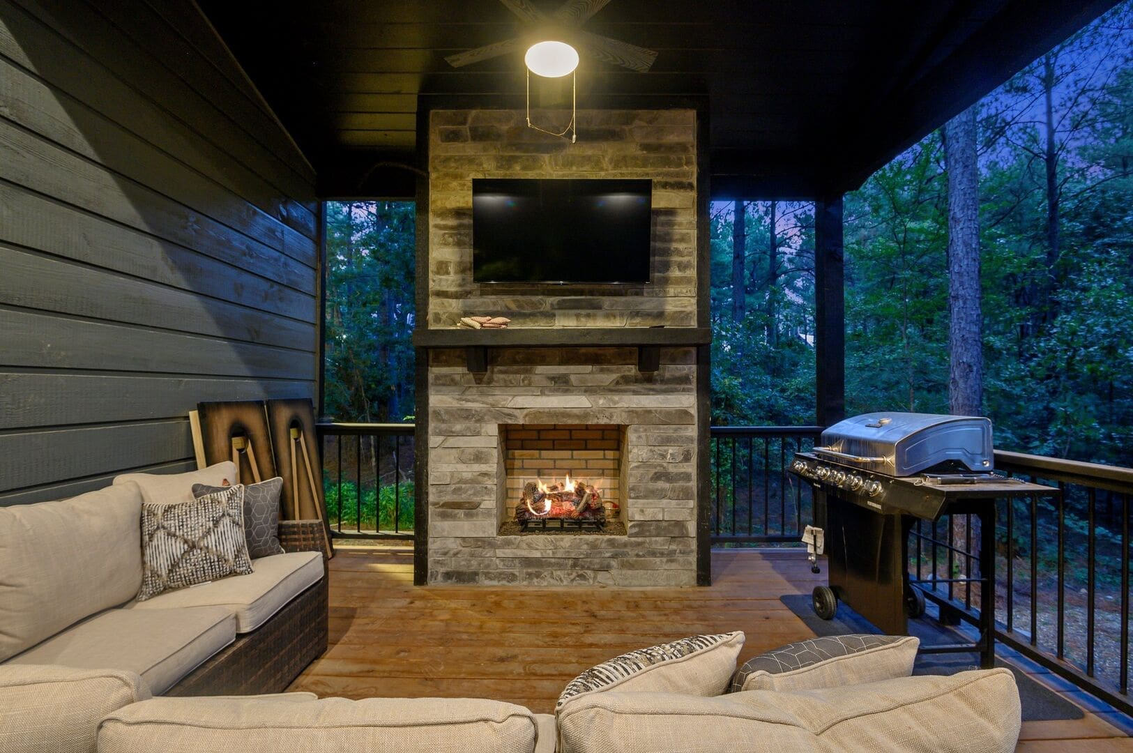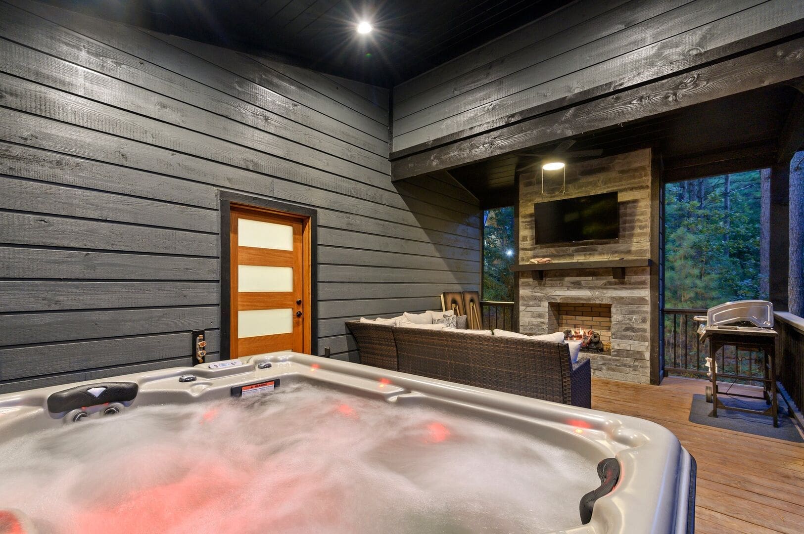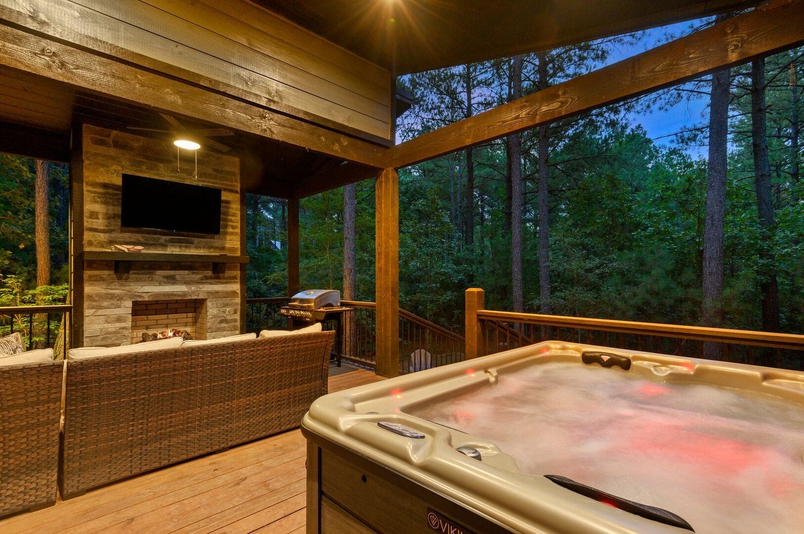 Step into the outdoors, where the magic continues. The Patio offers a retreat with comfortable furniture, a hot tub for romantic evenings, and a gas grill for al fresco dining. A gas fireplace, a big-screen TV, and a firepit with seating for four create an enchanting ambiance.