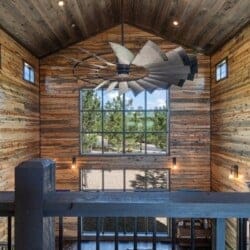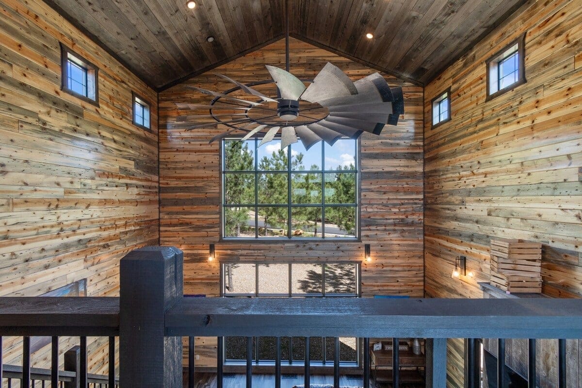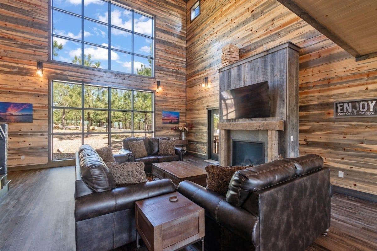 The main living area features leather seating for seven people and is centered around a warm gas fireplace. A queen sleeper sofa and two love seats offer space for lounging and extra sleeping. The windmill-style ceiling fan adds a rustic touch, while the large HDTV provides entertainment after a long day outdoors.