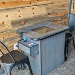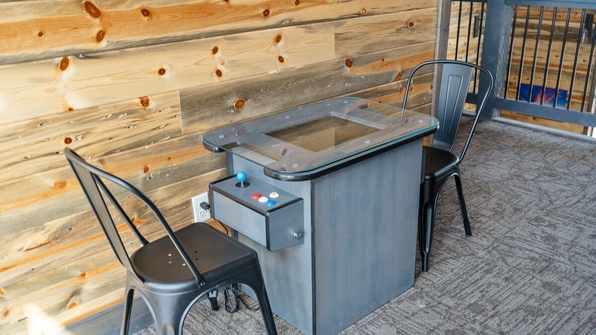 The upstairs loft doubles as a game room with a shuffleboard table, arcade-style game console, and HDTV. This space opens directly onto the upper deck, which provides seating for up to seven and is a quiet spot to take in morning light or evening skies. The game room offers plenty of fun for guests of all ages and makes indoor time as exciting as outdoor time.