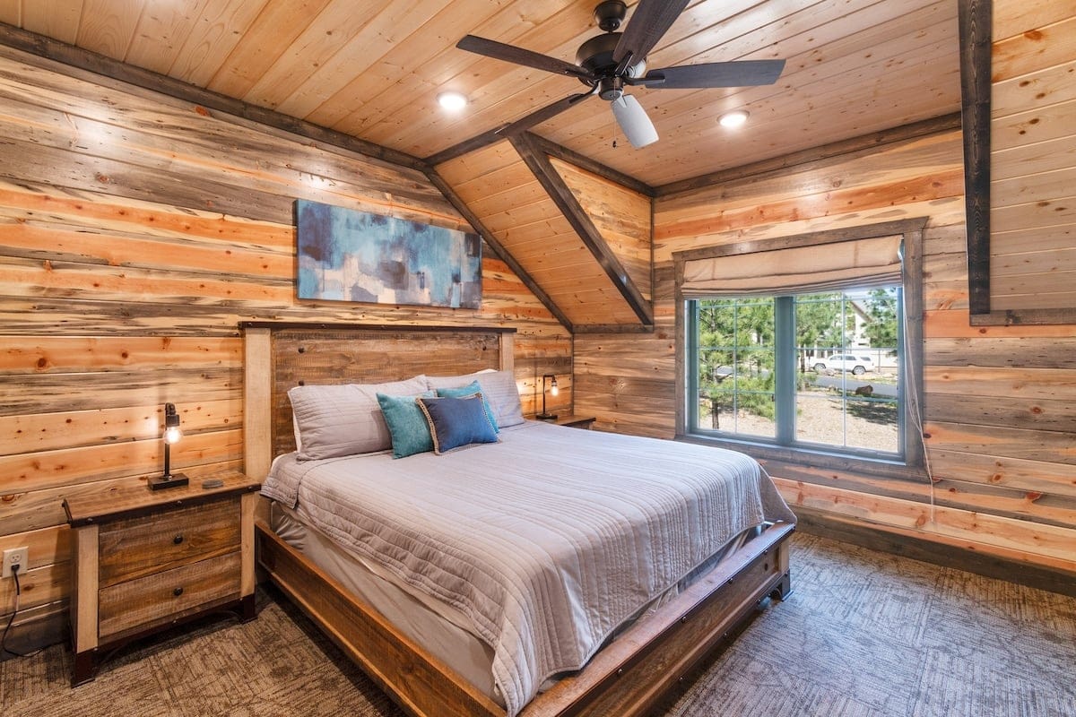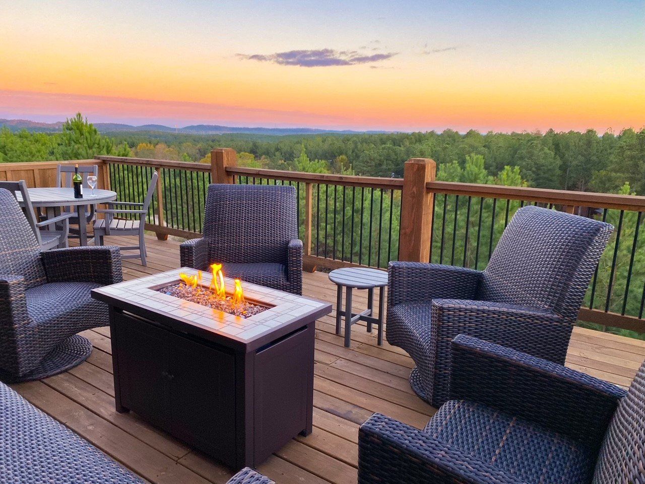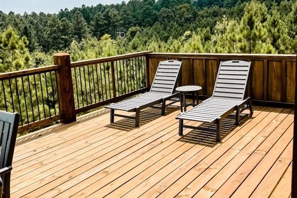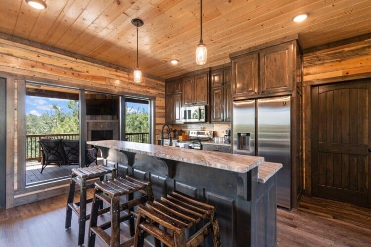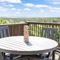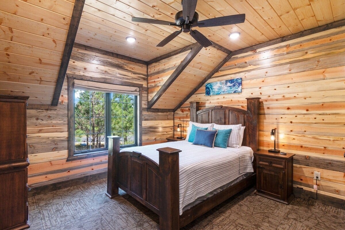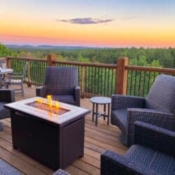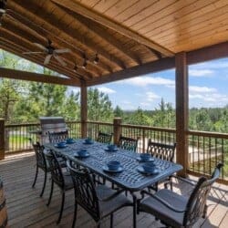 The cabin’s charm begins with two spacious back decks that open to beautiful scenes of the forested ridgeline. Whether watching the sunrise with a warm cup of coffee or sitting quietly during a glowing sunset, guests are surrounded by the calm beauty of the pines in every direction. Every season brings something special to this spot—from the golden leaves of fall to the fresh green shades of spring. These decks are perfect for outdoor dining, relaxing in the hot tub, or sitting by the fireplace under the stars.