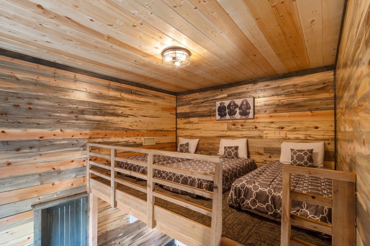 Each of the five bedrooms offers its unique comfort. The first master bedroom downstairs has a king bed, HDTV, private bath, and direct access to the front porch and the lower back deck. The second downstairs bedroom has a king bed and connects to a bathroom that serves as the guest bath for the main living area. Upstairs, three more bedrooms await. One has a king bed and a private ensuite. Another includes a queen bed and shares a bathroom with the game room. The largest bedroom upstairs sleeps five with a queen bed and three twin beds in a cozy loft area—perfect for kids or cousins wanting a sleepover feel.
