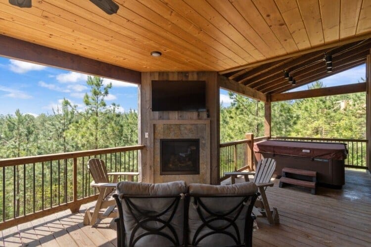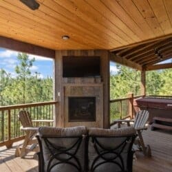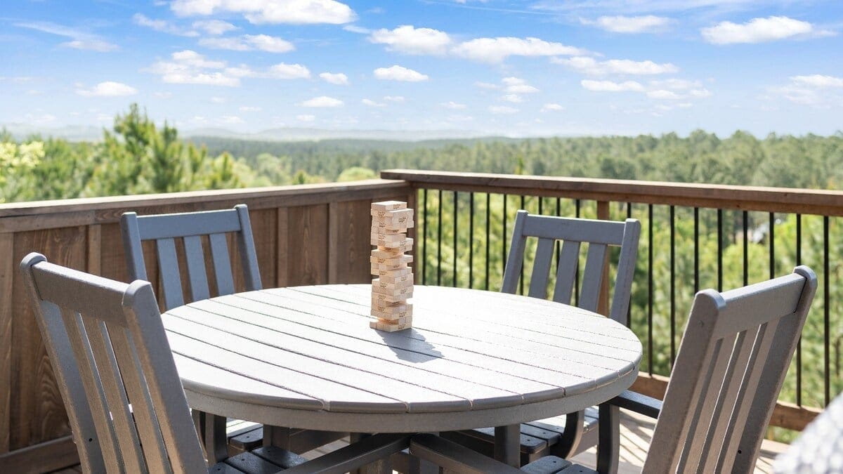 The cabin shines even more outdoors. The lower deck includes a large dining table, a gas grill, cozy outdoor furniture, and a second fireplace. A hot tub offers a peaceful soak with a view, and a fire pit nearby is the perfect place for roasting marshmallows or telling stories late into the night. Guests can also play corn hole or enjoy rocking on the front porch while breathing in the mountain air.