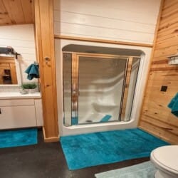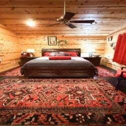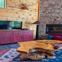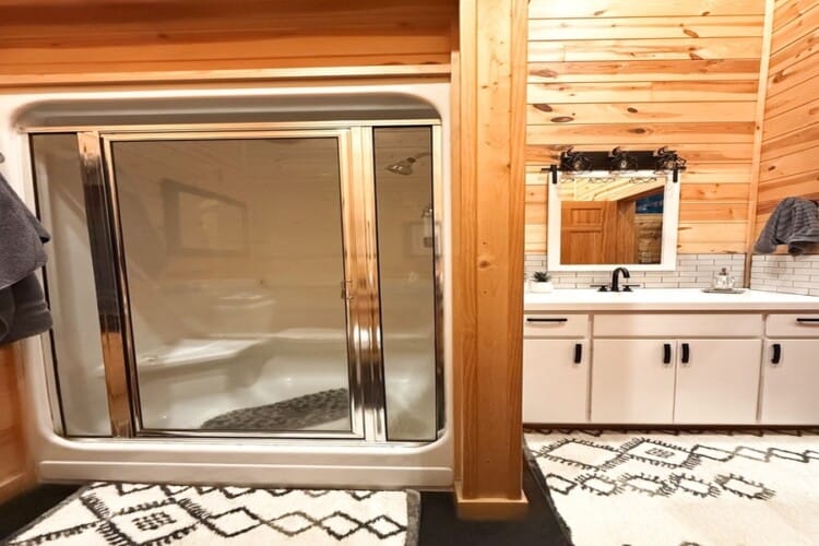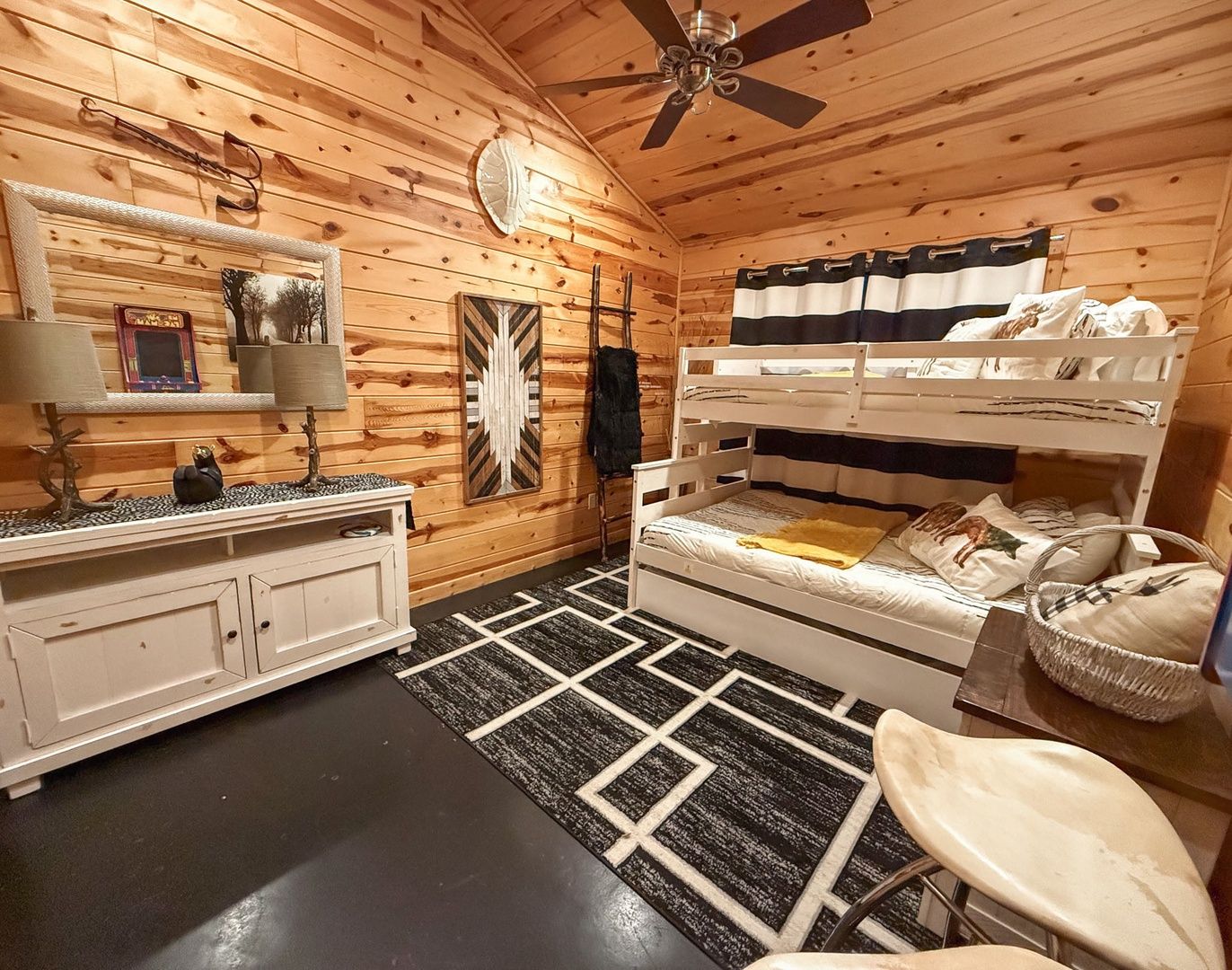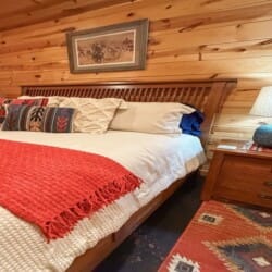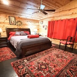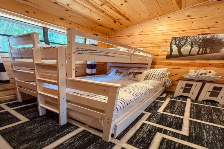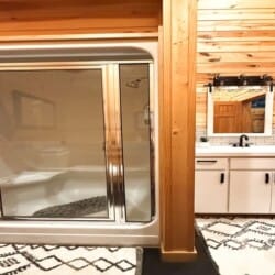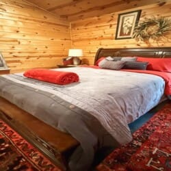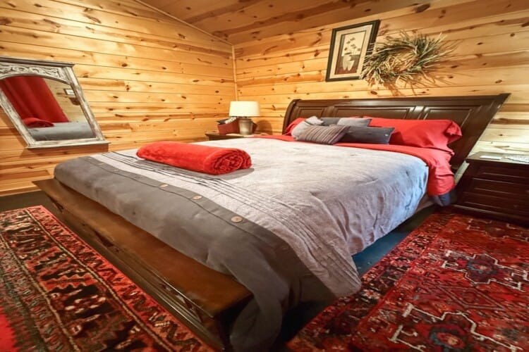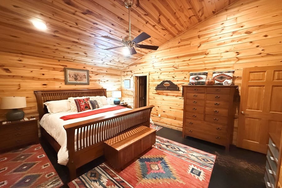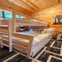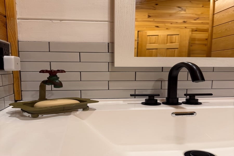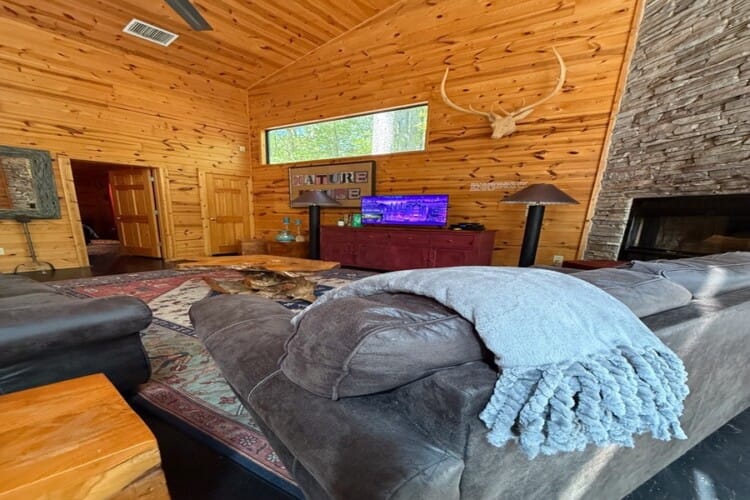 The cabin features two king suites and a queen sleeper sofa, comfortably accommodating six guests. With its farmhouse design, the cabin creates a warm and inviting atmosphere. Enjoy modern amenities like smart TVs and fast Wi-Fi, ensuring entertainment and connectivity during your stay. The fully equipped kitchen with a coffee bar makes meal preparation a breeze. We provide coffee, sugar, and creamer for your convenience. Spa-like bathroom amenities, including soap, shampoo, and conditioner, are provided to enhance your stay.