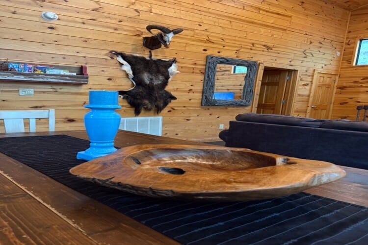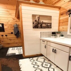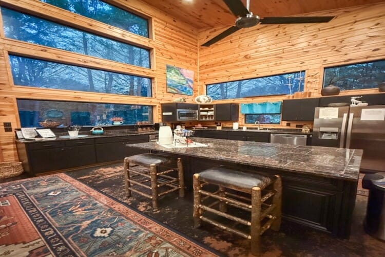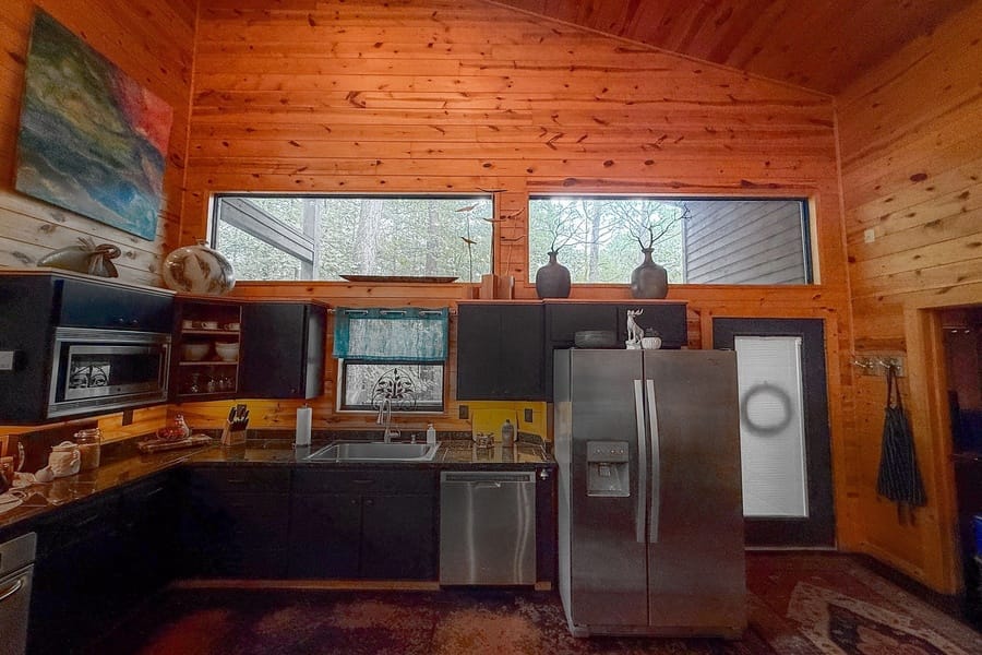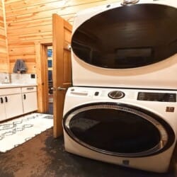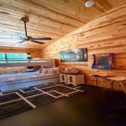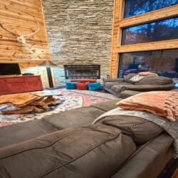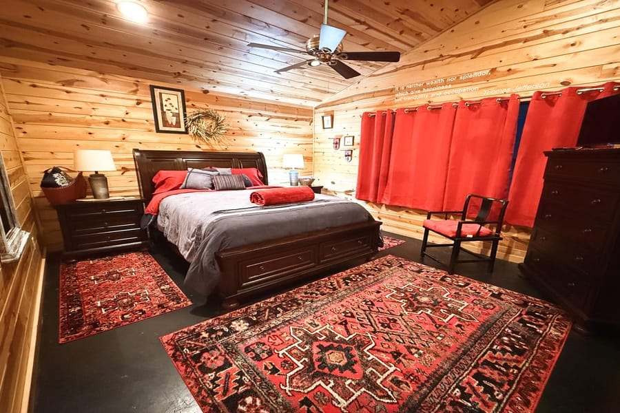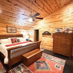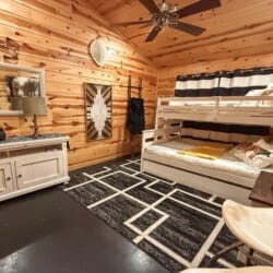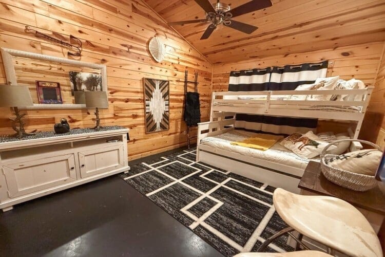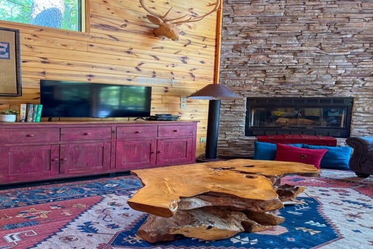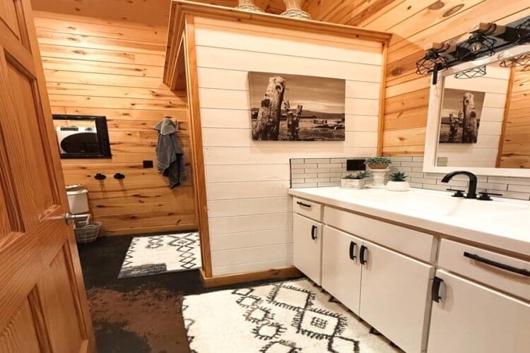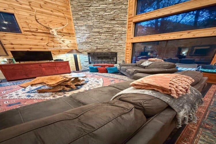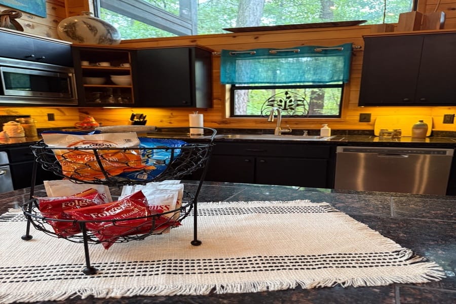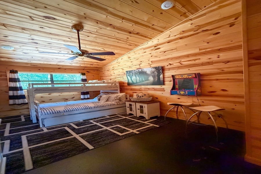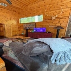 As you enter the cabin, you’ll be captivated by the open space, tall ceilings, and cozy farmhouse vibe. The living area features a comfortable sectional sleeper sofa and an accent chair with pillows, creating a perfect spot for relaxation. A smart TV with DISH cable and a gas fireplace adds comfort and entertainment options.
