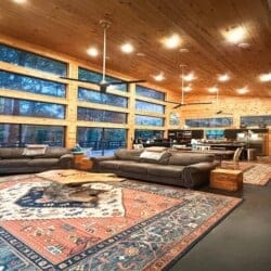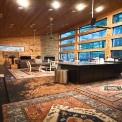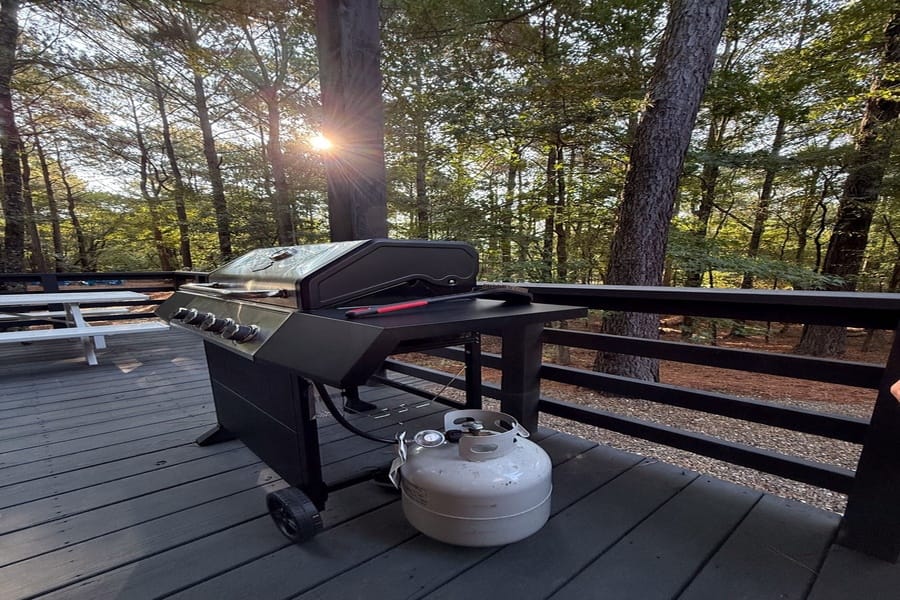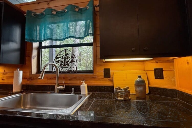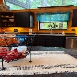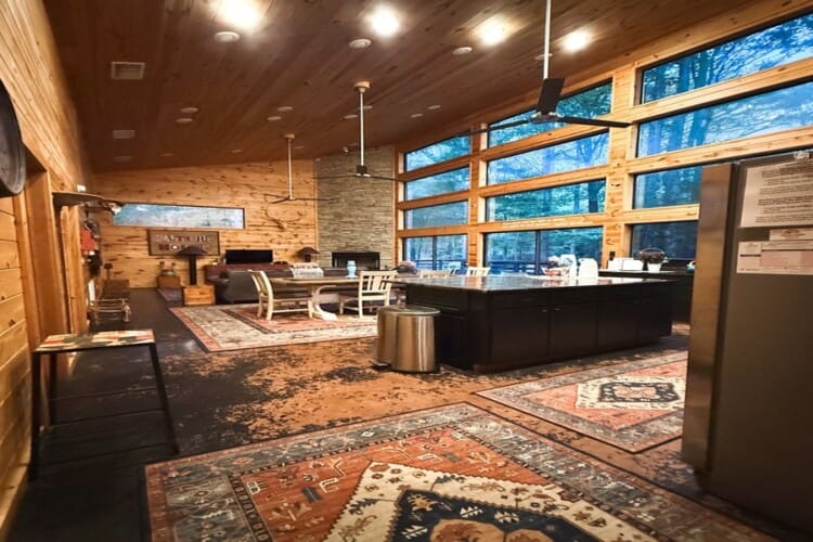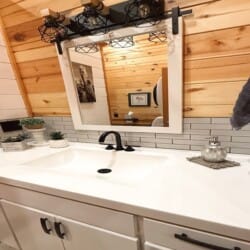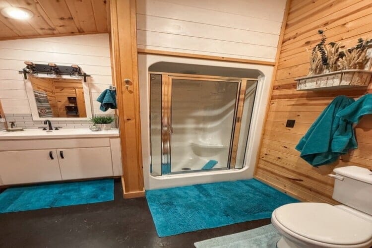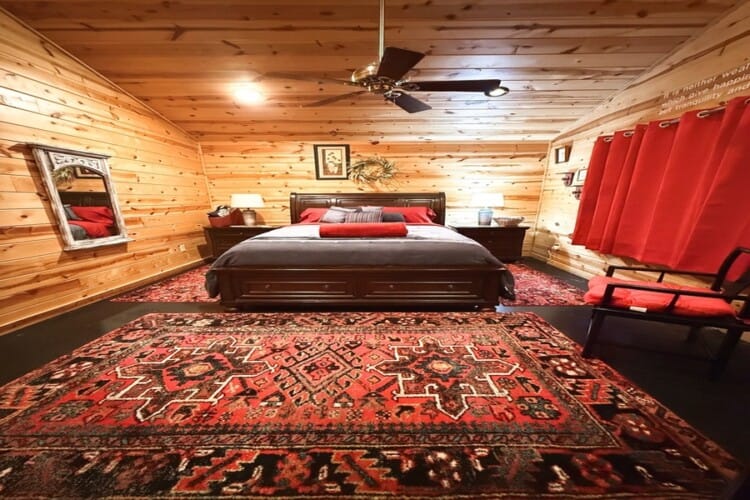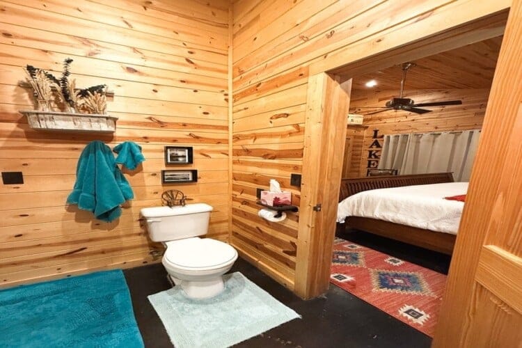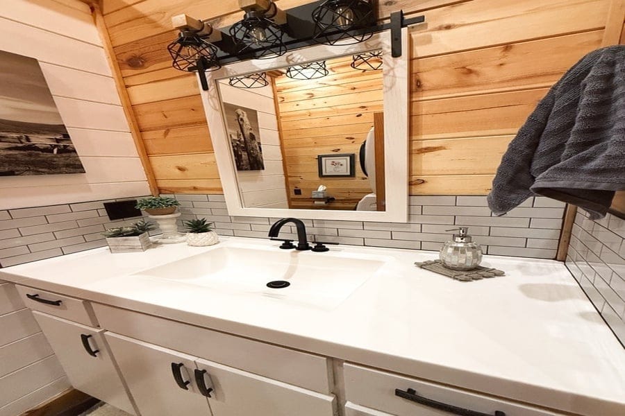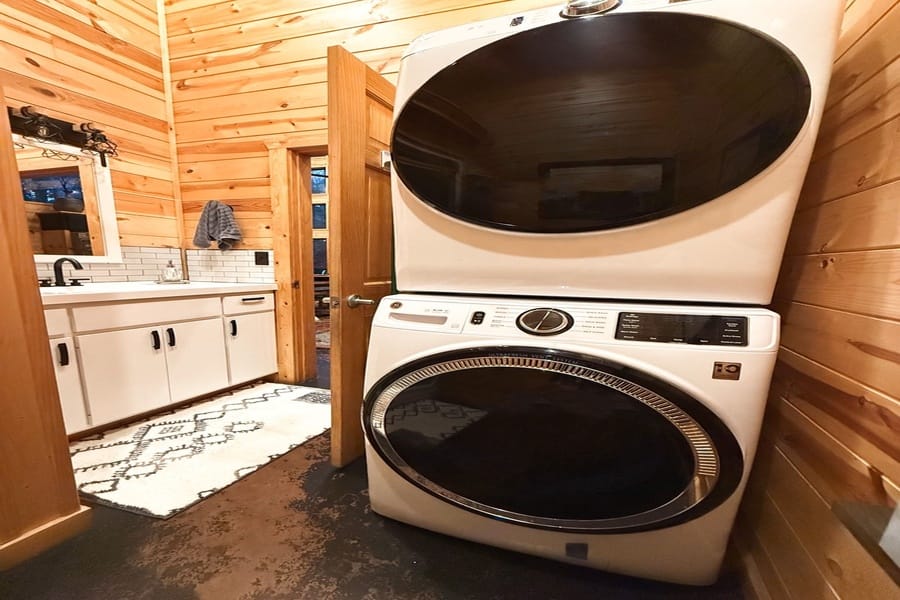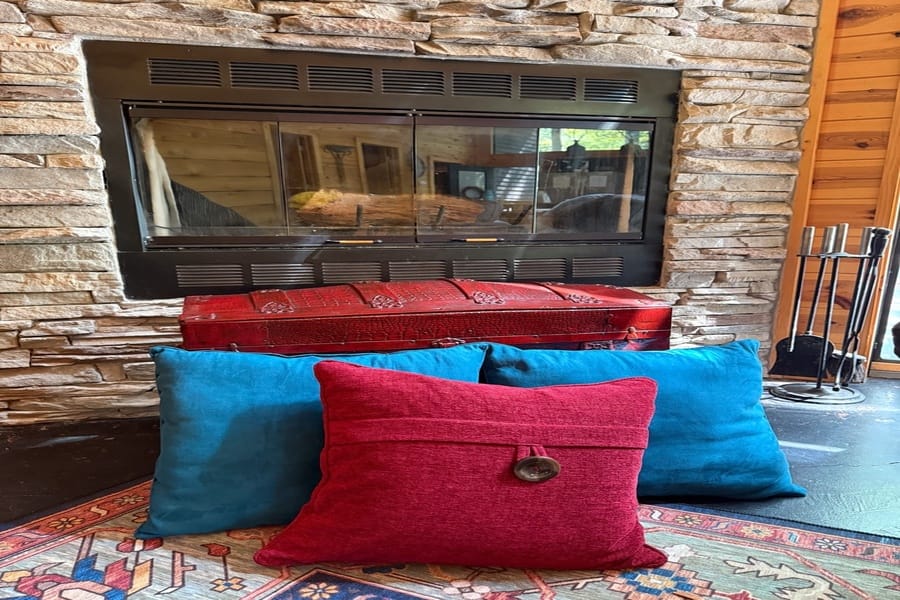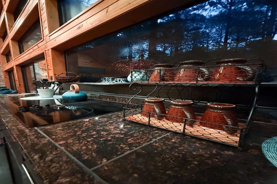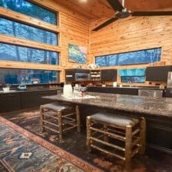 As you enter the cabin, you’ll be captivated by the open space, tall ceilings, and cozy farmhouse vibe. The living area features a comfortable sectional sleeper sofa and an accent chair with pillows, creating a perfect spot for relaxation. A smart TV with DISH cable and a gas fireplace adds comfort and entertainment options.