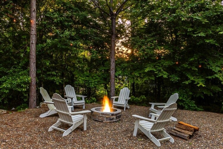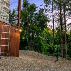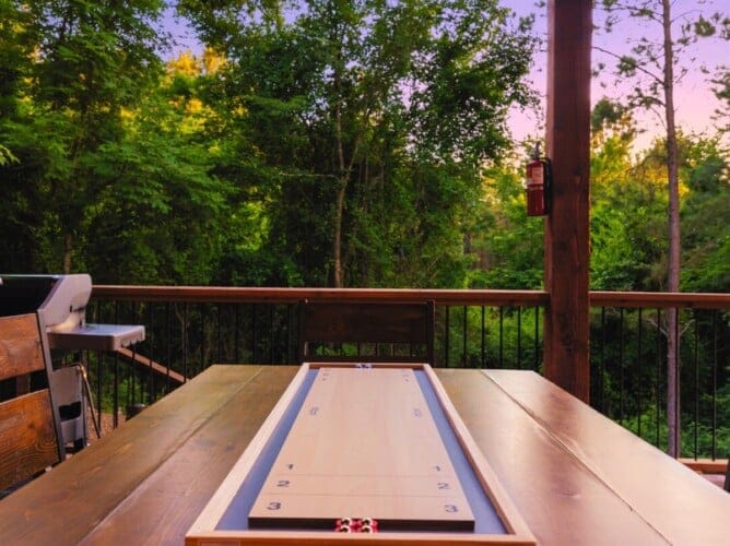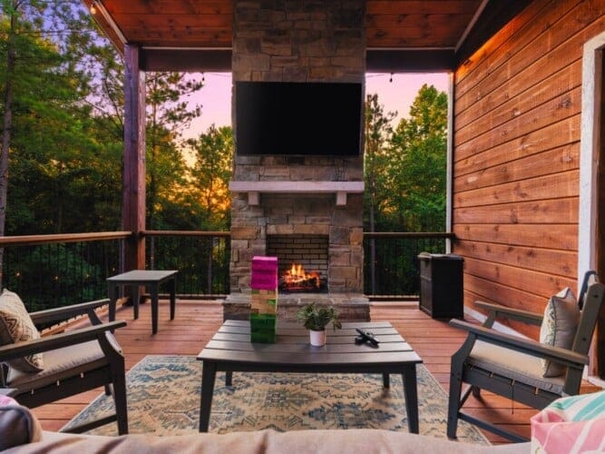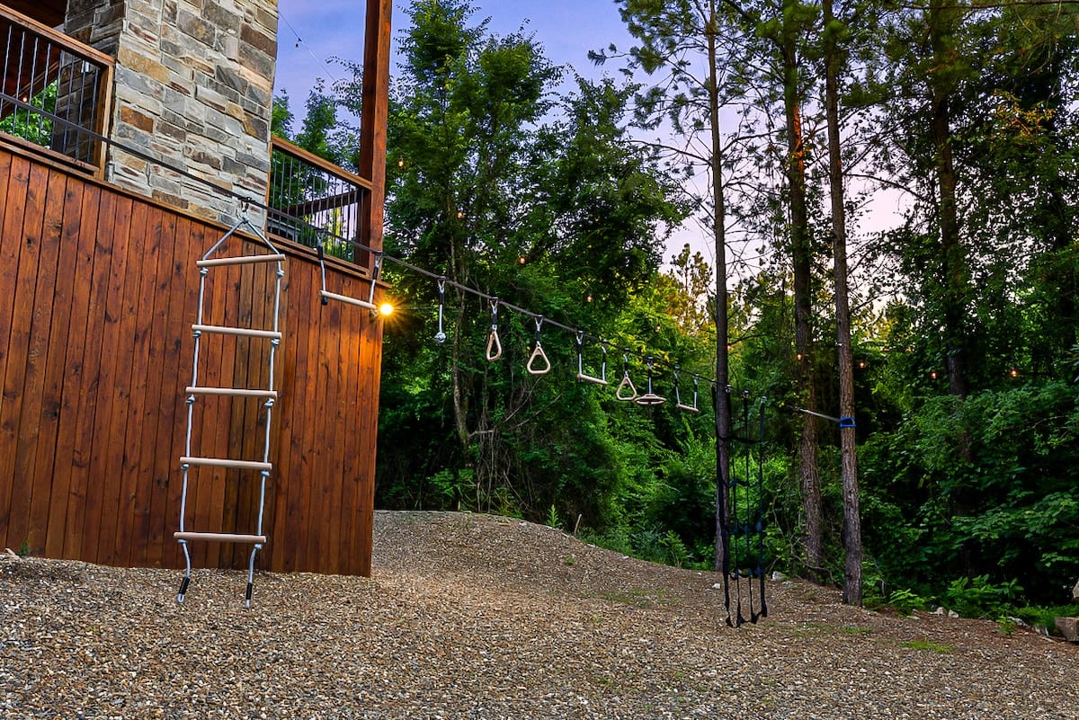 The outdoor area is a true haven for fun and relaxation, surrounded by pine trees. The patio, accessible from the living area and both king suites, features a flat-screen TV above a gas fireplace, ample seating, and various games and activities. Enjoy the hot tub, outdoor dining, seating areas, and a gas grill for outdoor cooking. The patio also includes games like Connect 4, cornhole, and mini shuffleboard, providing entertainment for all ages. A short walk from the back deck leads to an inviting outdoor fire pit with chairs for your entire group to gather around and enjoy. Additionally, there is a Ninja Warrior obstacle course for kids to enjoy.