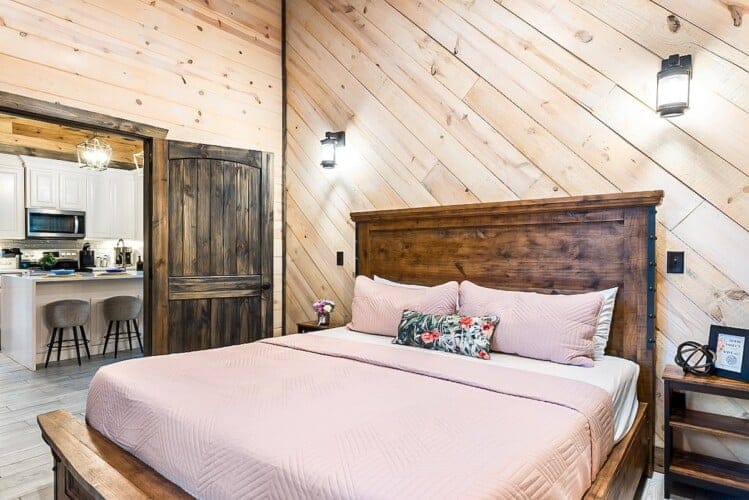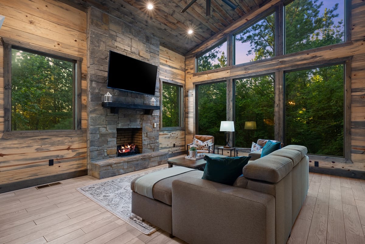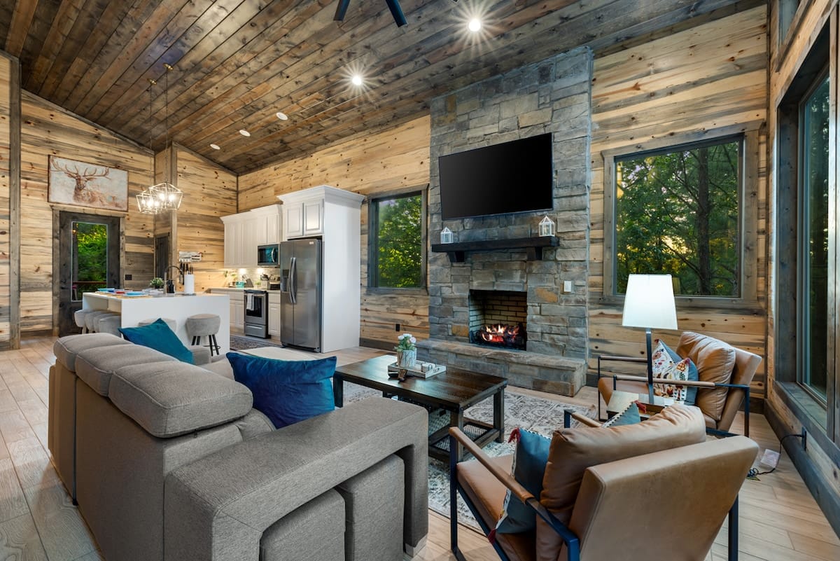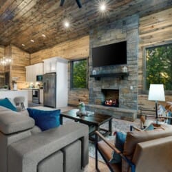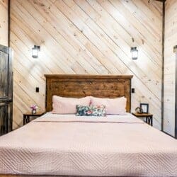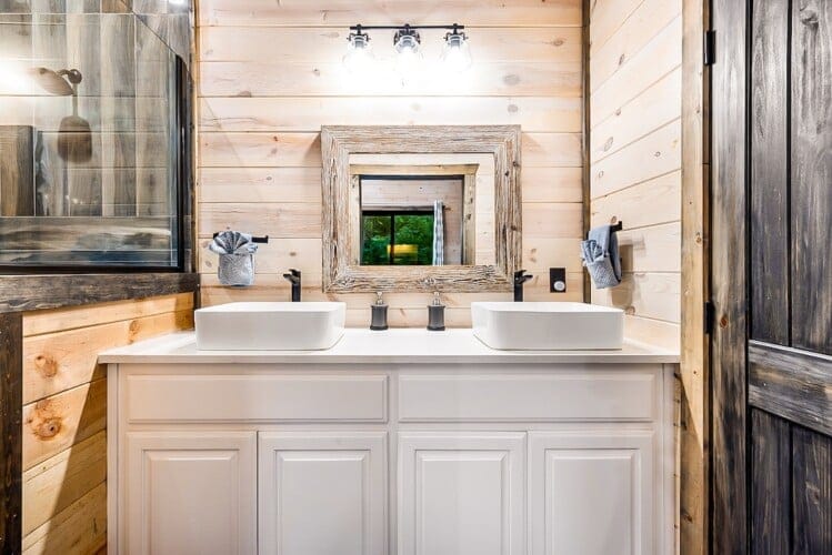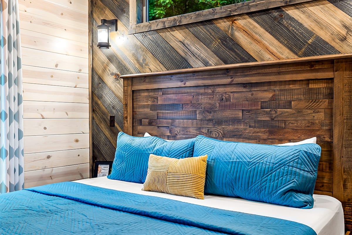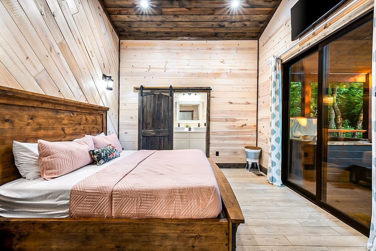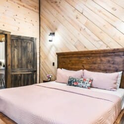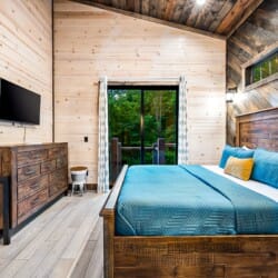 As you enter the Nature’s Nest cabin, you’ll be captivated by the open space, tall ceilings, and cozy farmhouse vibe. The living area features a comfortable sectional sleeper sofa and an accent chair with pillows, creating a perfect spot for relaxation. A smart TV with DISH cable and a gas fireplace adds comfort and entertainment options. A hallway leads to the two identical king suites. Each suite offers a king-sized bed, nightstands, an ensuite bath with a shower, and access to a balcony that leads to the patio. Premium pillows, linens, sheets, smart TVs, and room-darkening curtains or shades are provided in both bedrooms.