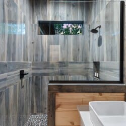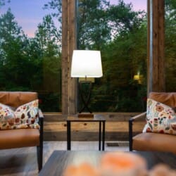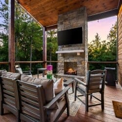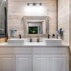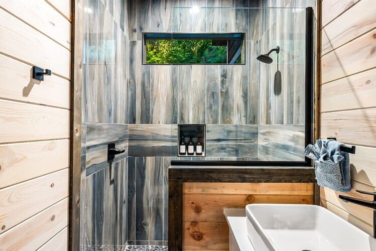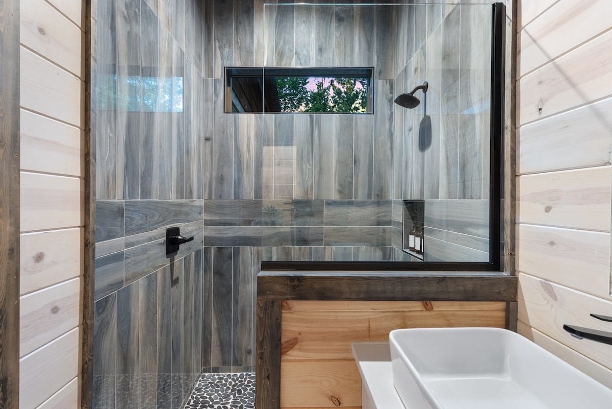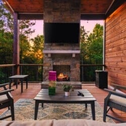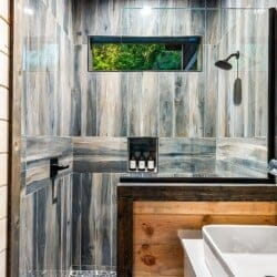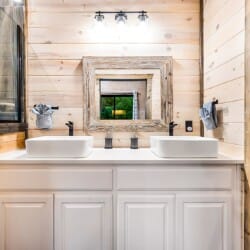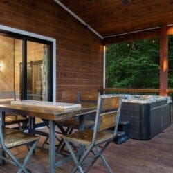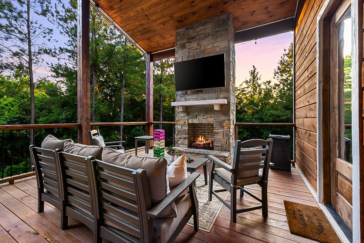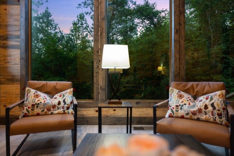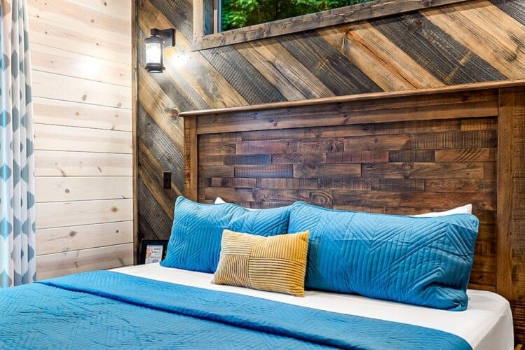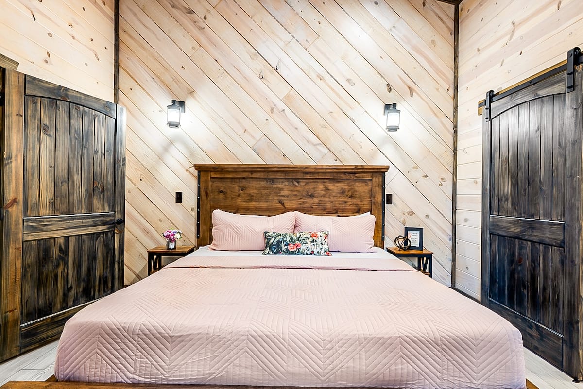 As you enter the Nature’s Nest cabin, you’ll be captivated by the open space, tall ceilings, and cozy farmhouse vibe. The living area features a comfortable sectional sleeper sofa and an accent chair with pillows, creating a perfect spot for relaxation. A smart TV with DISH cable and a gas fireplace adds comfort and entertainment options. A hallway leads to the two identical king suites. Each suite offers a king-sized bed, nightstands, an ensuite bath with a shower, and access to a balcony that leads to the patio. Premium pillows, linens, sheets, smart TVs, and room-darkening curtains or shades are provided in both bedrooms.