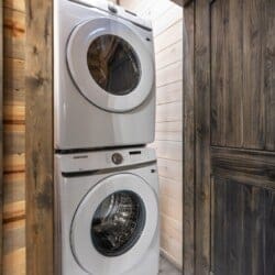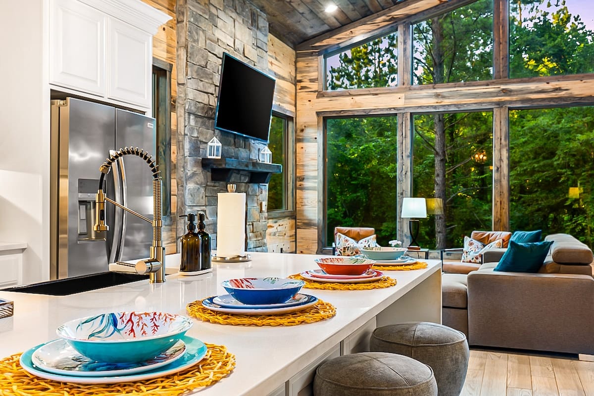 Nature’s Nest kitchen and dining area are perfect for preparing and enjoying homemade meals. The fully equipped kitchen includes quartz countertops and stainless steel appliances, such as a microwave, stove, refrigerator/freezer, dishwasher, hand mixer, blender, toaster, and bakeware. The bar area has six bar stools, providing ample seating for dining at the counter.