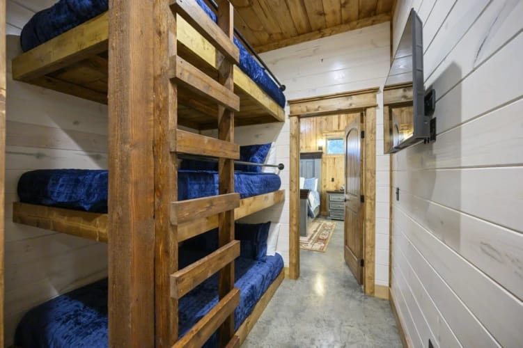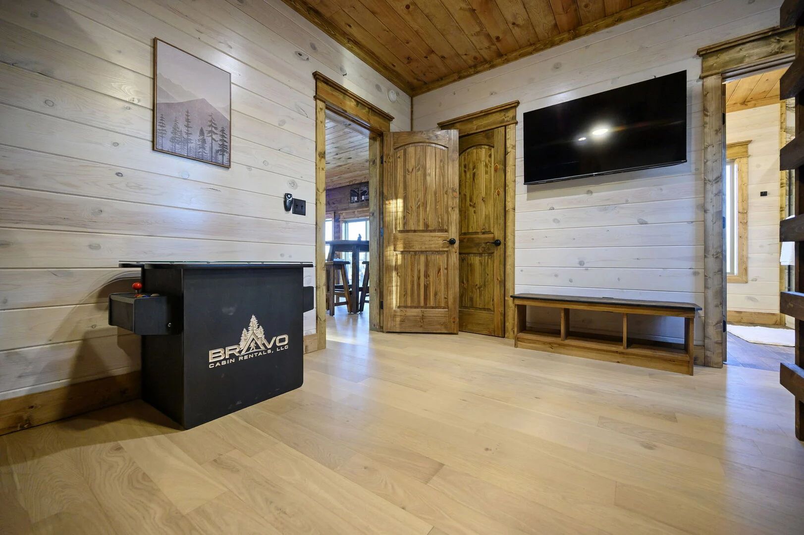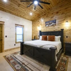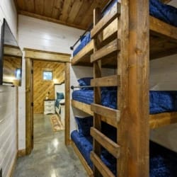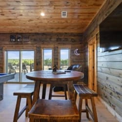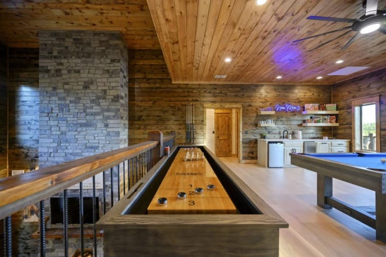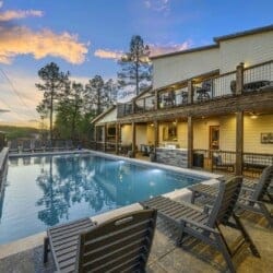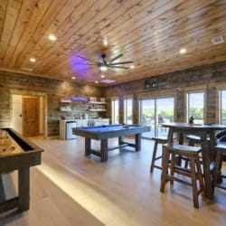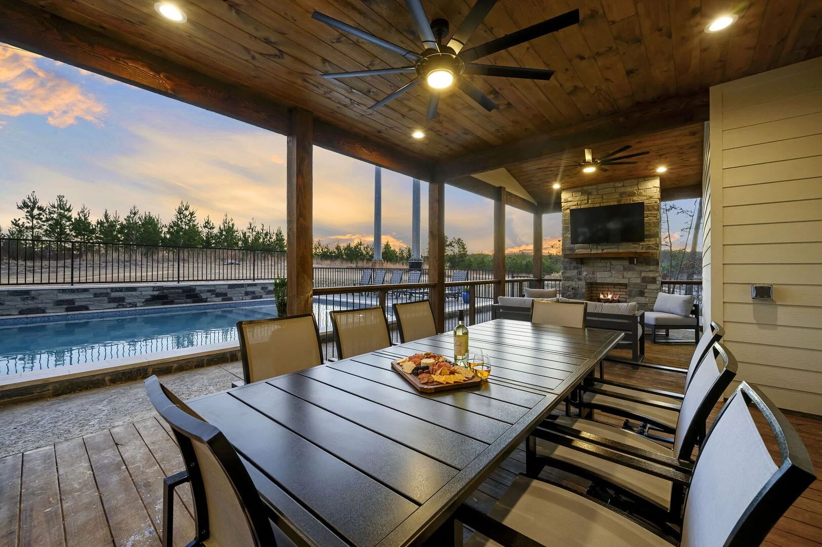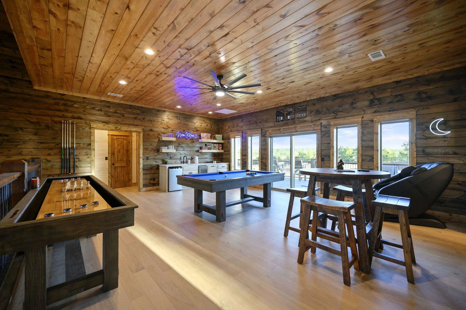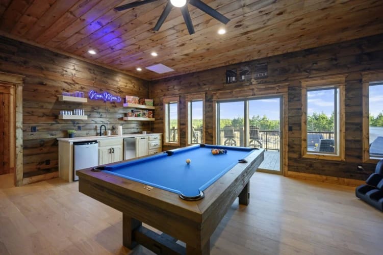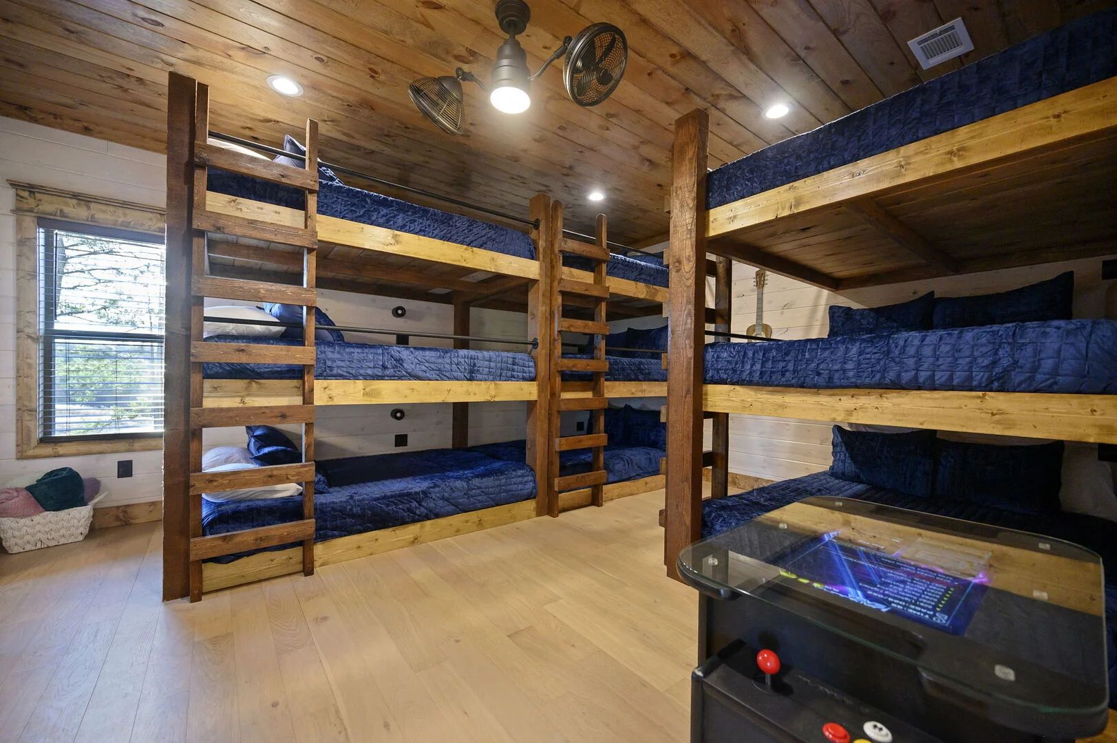 6 King Master Suites • 1 Bunk Room • Half Bath • Sleeps 42 • Heated Private Pool • Hot Tub • Game Loft • Expansive Balcony • Chef-Inspired Kitchen • Direct ATV Trail Access • EV Plug-In • Pool Table • Shuffleboard • Massage Chair • Arcade table