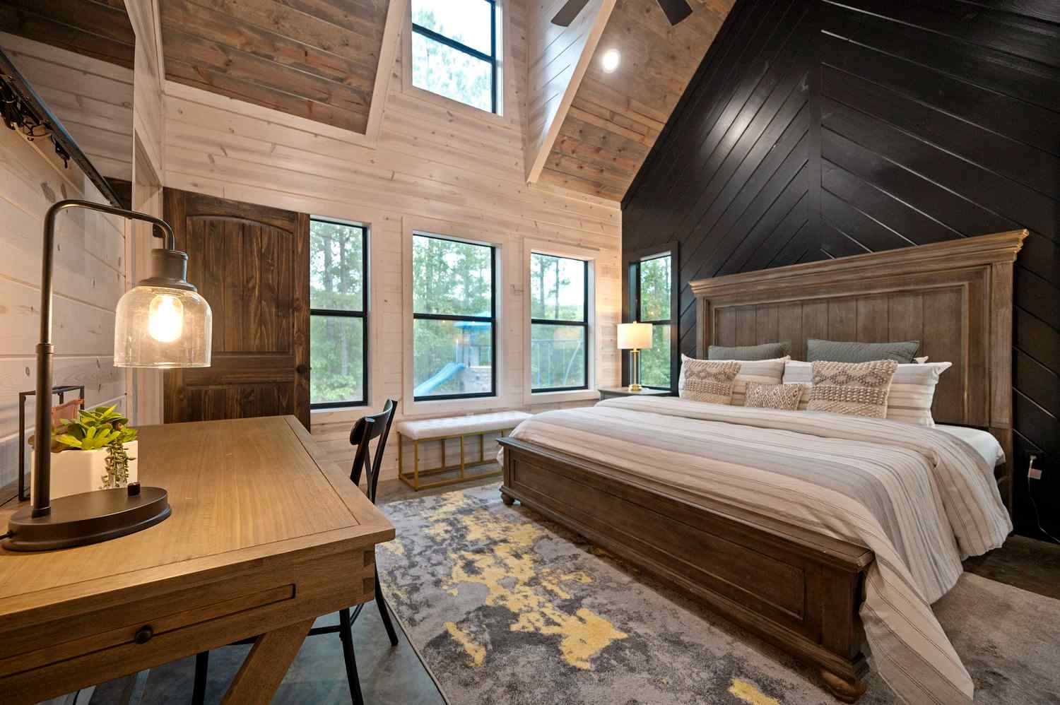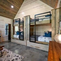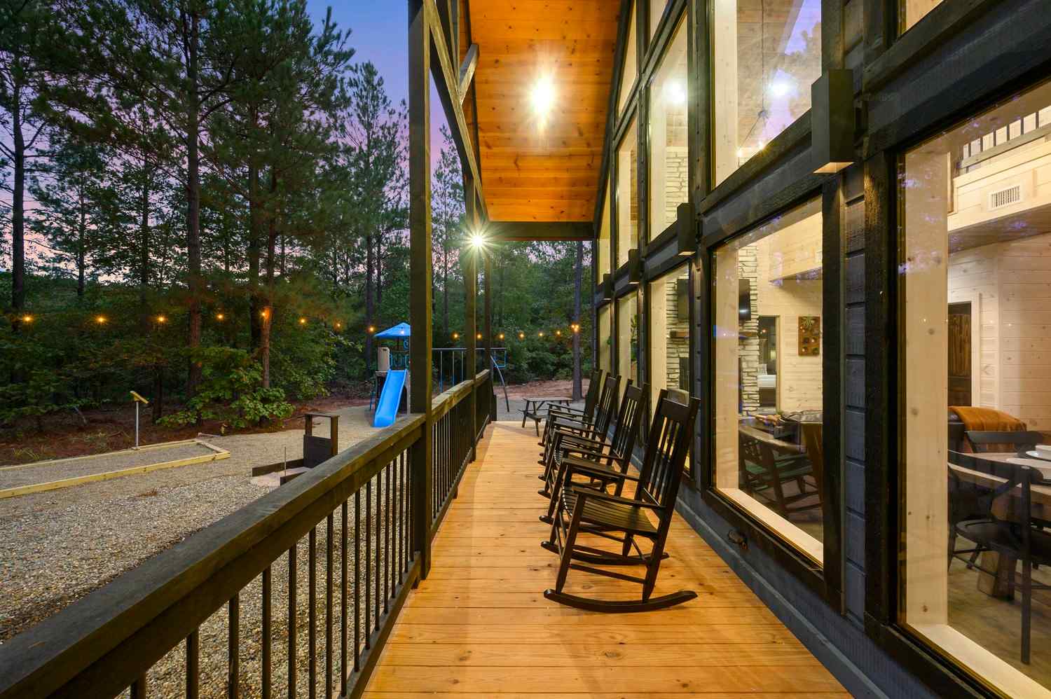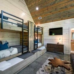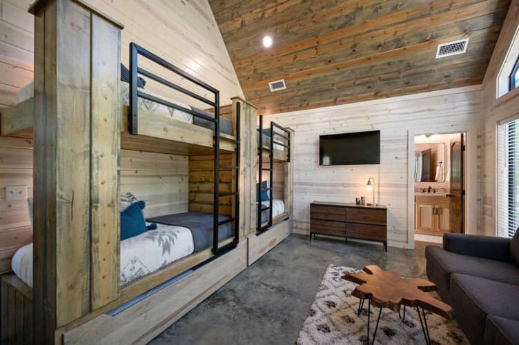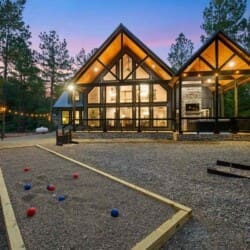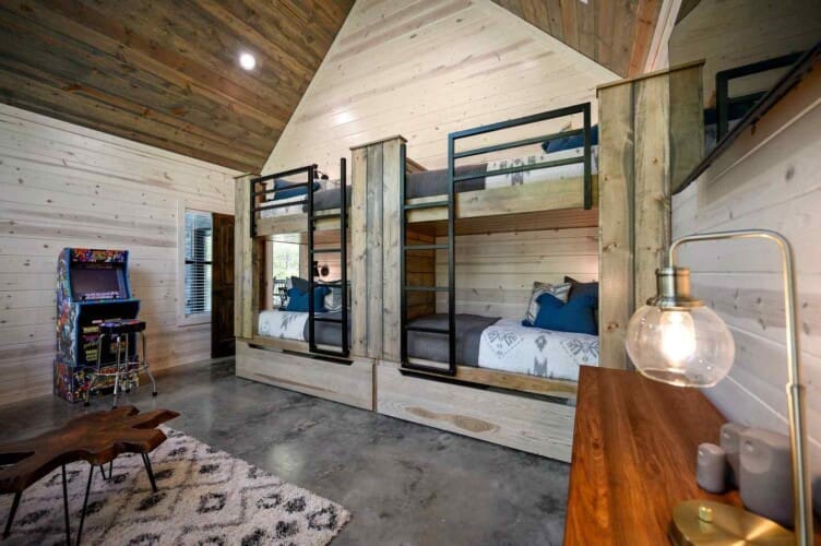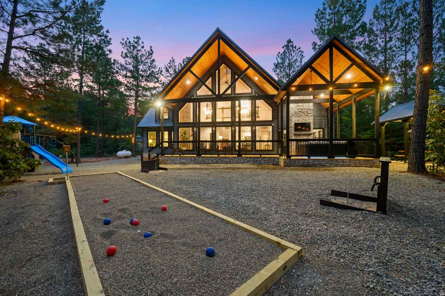 Guests can look forward to two king suites with individual bathrooms, special features like vanities and soaking tubs, and walk-in showers. Each bedroom also features 55-inch intelligent TVs so you can catch your favorite shows in the comfort of your own space. Cozy up in the upstairs loft with board games and puzzles, or get the family together for a game of poker. The downstairs bunk room offers a game console and foosball for guests looking for thrills and excitement. Outdoor games are provided, so you can get competitive with a rousing game of corn-hole or horseshoes or go a bit more tactical with a Bocce-ball court.