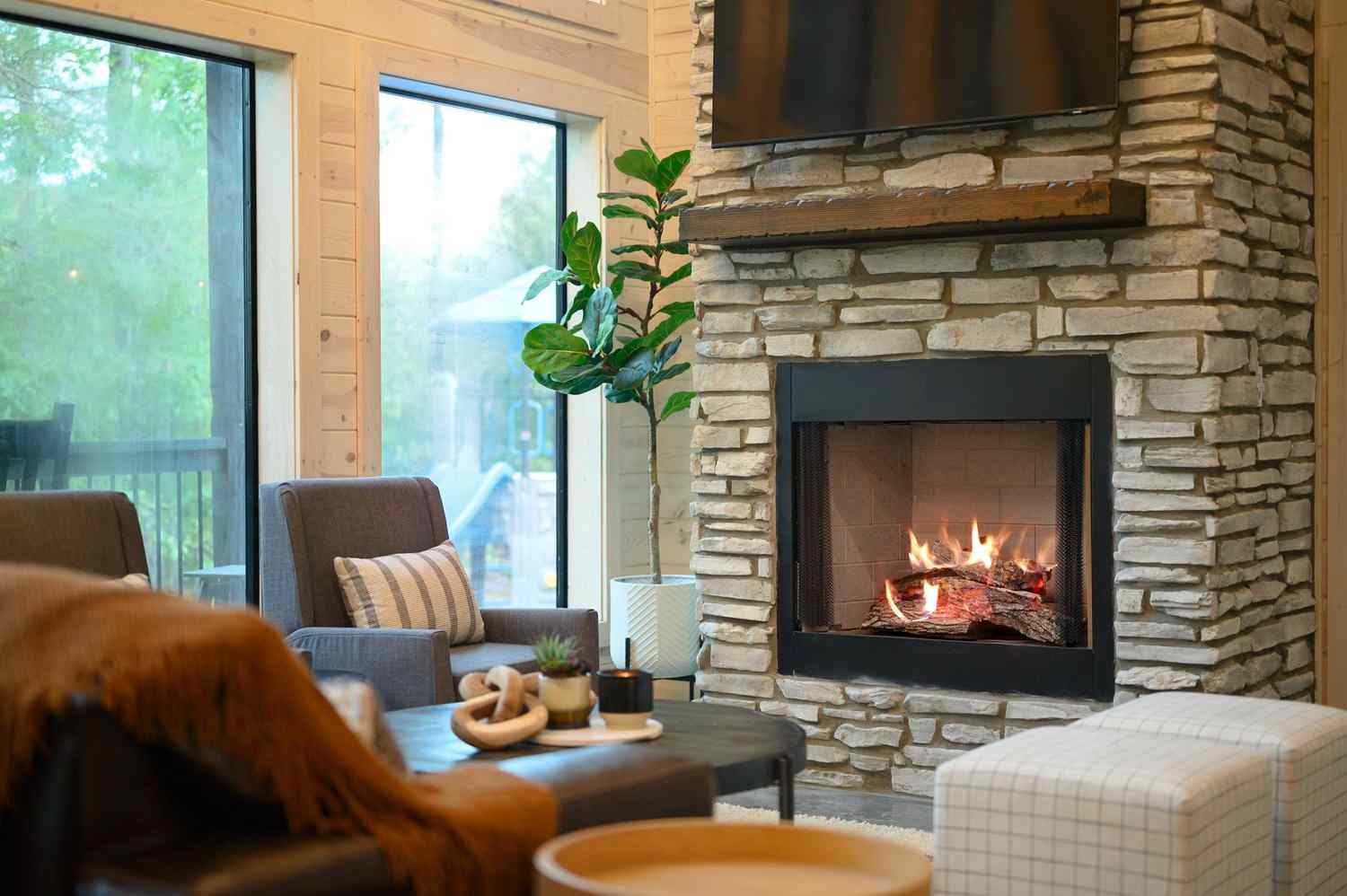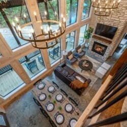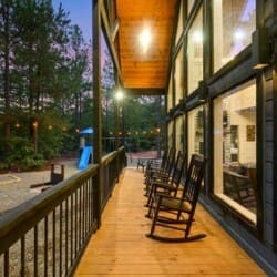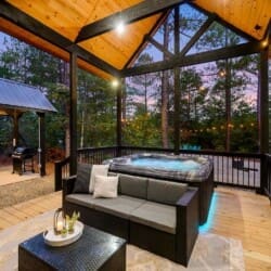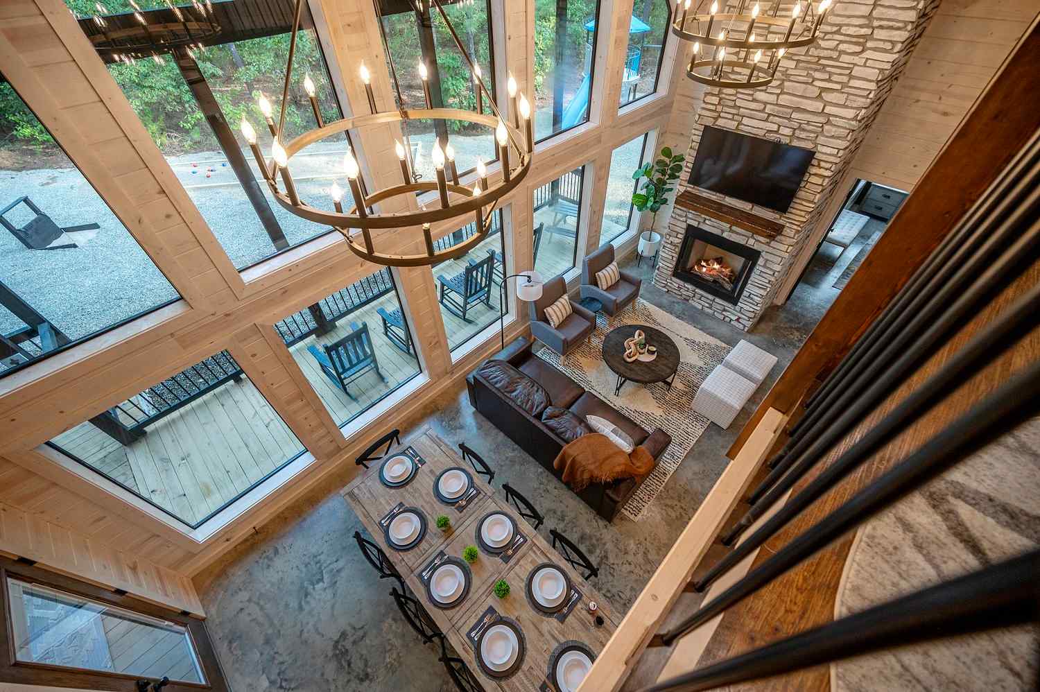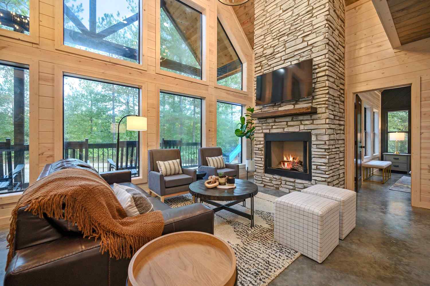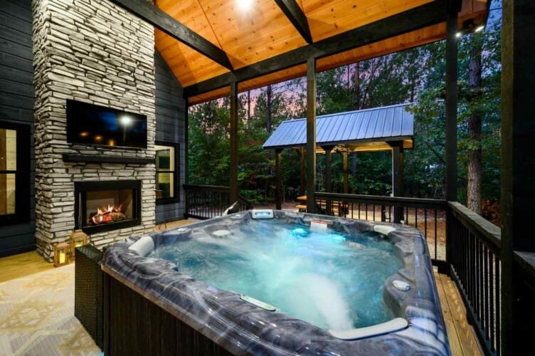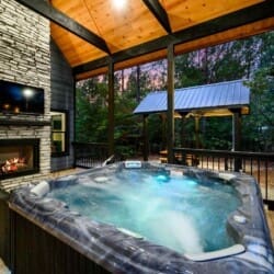 The sizeable downstairs porch allows you to soak up the natural beauty of the surroundings while relaxing in front of the gorgeous outdoor fireplace or grilling and dining outdoors with a view. Spend your evenings gathered around the stone fire pit, or soak in the covered hot tub, which is situated in front of the outdoor TV and fireplace for your ultimate entertainment.