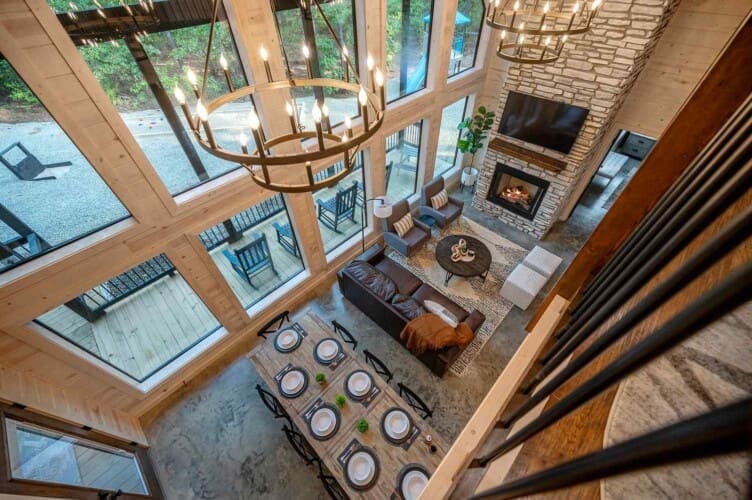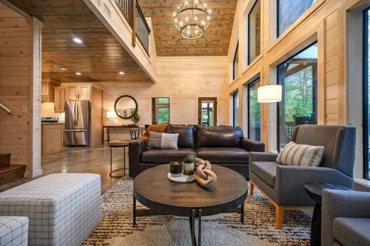 This home-away-from-home Night Owl cabin offers an open-concept floor plan, warm tones, and an inviting aesthetic sure to comfort you. Walls of windows allow for replete natural light to illuminate the living space, blurring the barrier between the indoors and the environs beyond. The expansive culinary kitchen, with its quartz countertops, stainless steel appliances, and a wine fridge, beckons laughter-filled evenings that linger long into the night.