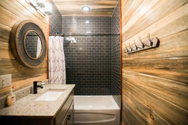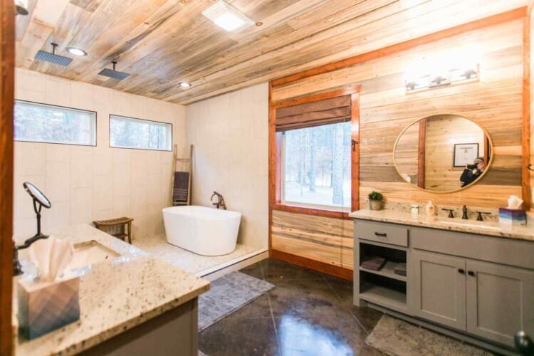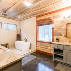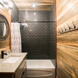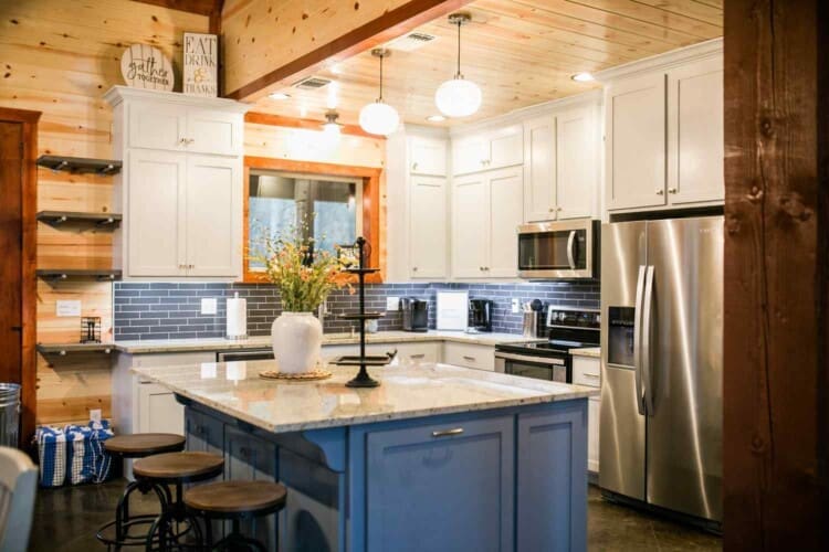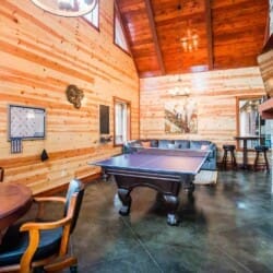 Step out onto the Palmetto Moon veranda and take in the scenery, which looks even more stunning when framed by the tall windows. It’s great living area, with an elevated ceiling and beautiful wooden beams, is home to a double-sided 24 ft fireplace, perfect for creating a cozy atmosphere on chilly nights. On one side of the fireplace is a sprawling seating area where you can watch your favorite shows on the large 65″ television mounted above the fireplace. Move to the other side of the fireplace and family room, and you’ll find a game room area perfect for your next challenge. Here, you’ll find a pool table, game table, TV set, and additional seating for relaxing.