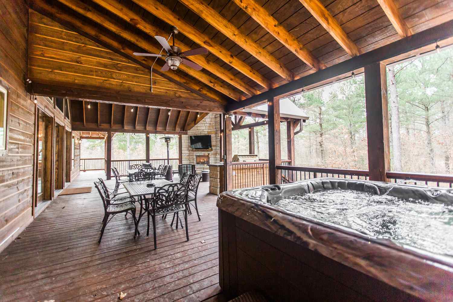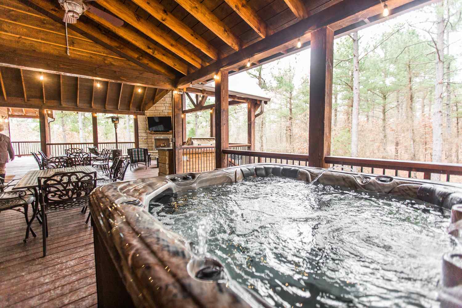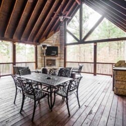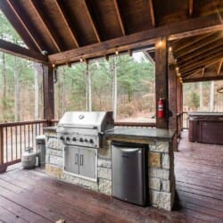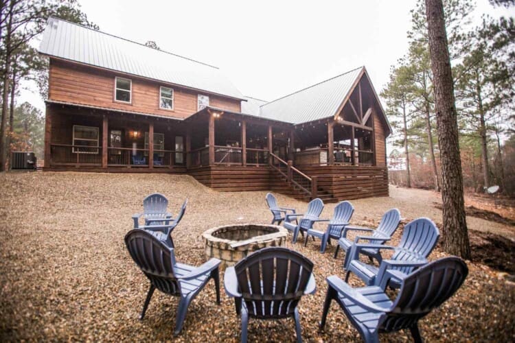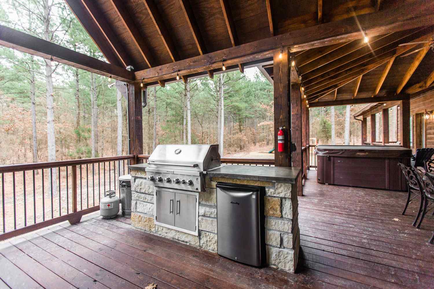 From the fully equipped kitchen, which boasts a large island bar, to the covered outdoor dining area, you’ll find everything you need for a relaxing stay. Get a relaxing soak in the hot tub on the covered deck or rustle up something delicious in the outdoor kitchen with a large, built-in gas grill, refrigerator, and plenty of counter space for prepping. End the day with the fire ring in the backyard, where plenty of additional seating areas create a cozy atmosphere as you share stories and make memories together in this Broken Bow cabin rental.
